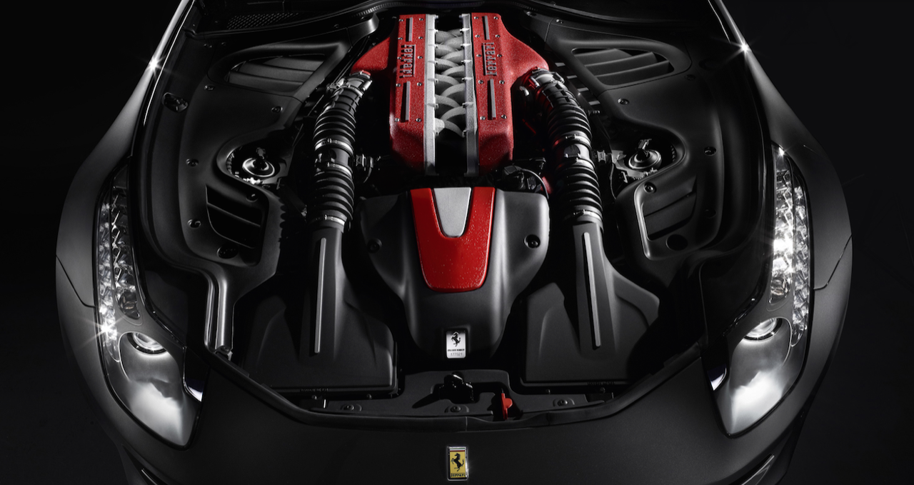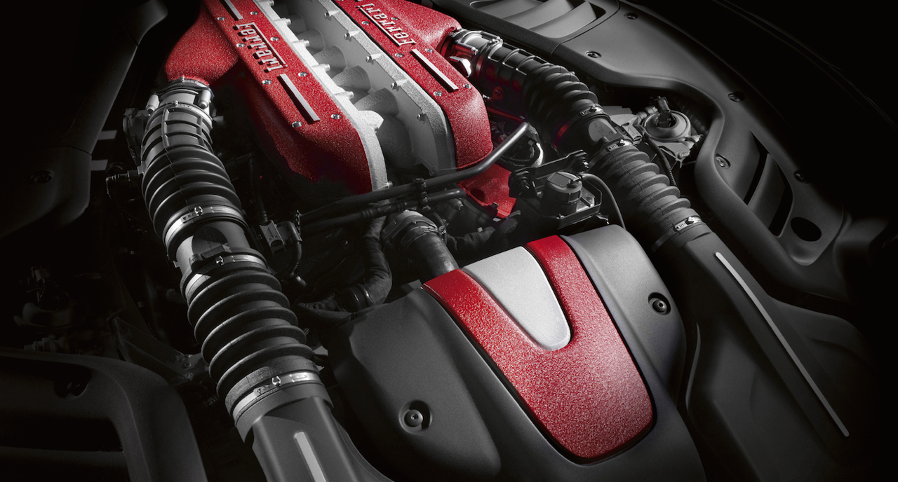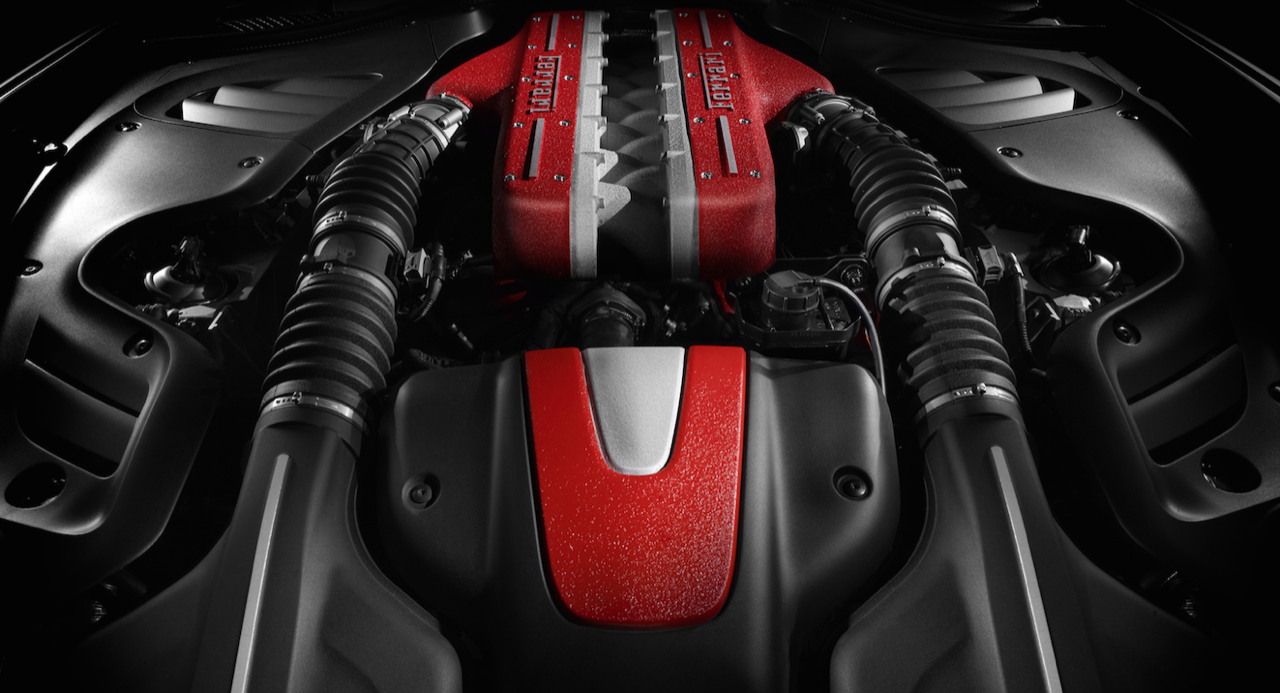 เครื่องยนต์ของ Ferrari FF เป็นเครื่องบล็อกโตรูปตัว V มีกระบอกสูบถึง 12 ตำแหน่ง วางทำมุม 65 องศา พัฒนามาเพื่อให้เข้ากับรูปแบบของการขับเคลื่อนบนล้อทั้ง 4 ปริมาตรความจุ 6,262 ซีซี วางตามยาวด้านหน้าโดยร่นเครื่องยนต์เข้ามาใกล้กับห้องโดยสารเพื่อการกระจายน้ำหนักที่ดี ให้กำลังสูงสุด 660 แรงม้า แรงบิดมีให้ถึง 500 นิวตันเมตร ตั้งแต่ 1,000 รอบ และสูงสุด 683 นิวตันเมตร ที่ 6,000 รอบต่อนาที เป็นเครื่องยนต์รุ่นล่าสุดที่พัฒนามาจากเครื่องรุ่นเก่าที่มีความจุ 5,748 ซีซี โดยวิศวกรของ Ferrari นำมาขยายความจุ พร้อมระบบจ่ายเชื้อเพลิงแบบ Direct Injection ของรุ่น California ซึ่งมีรูปแบบการวางตำแหน่งเครื่องยนต์ไว้ที่ด้านหน้าเหมือนกันกับเจ้า Ferrari FF แรงม้ามากขึ้นกว่าเดิมจาก 533 แรงม้าเป็น 651 แรงม้า โดยไม่มีระบบอัดอากาศมาคอยช่วยในการนำอากาศปริมาณมากเข้าสู่ท่อร่วมไอดี สมรรถนะของอัตราเร่งบนการตะกุย 4 ล้อ จาก 0-100 กิโลเมตรใน 3.7 วินาที พอๆ กันกับ 599 GTO Fiorano รวมถึงการเป็นรถยนต์จาก Ferrari แบบ 4 ที่นั่งคันแรกที่สามารถวิ่งได้ถึง 200 ไมล์ต่อชั่วโมง หรือ 335 กิโลเมตรต่อชั่วโมง แม้ตัวจะหนักถึง 1,860 กิโลกรัม แต่การตะกายจากจุดหยุดนิ่งไปที่ 200 กิโลเมตรต่อชั่วโมง FF ใช้เวลาไปเพียงแค่ 9.80 วินาทีเท่านั้น