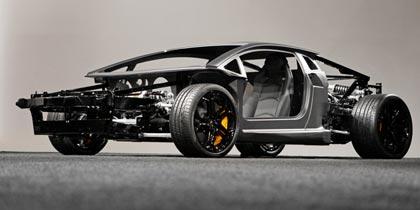 การวิจัยโครงสร้างด้วยวัสดุคาร์บอนคอมโพสิตที่มีการทำงานร่วมกัน ระหว่างวิศวกรของบริษัทผลิตอากาศยานชั้นนำอย่าง Boeing ทำให้เทคโนโลยีห้องโดยสารแบบกล่องกับเฟรมตัวถัง รวมถึงโครงสร้างทั้งหมดที่ทำจากคาร์บอนไฟเบอร์ของ Aventador มีความก้าวล้ำกว่าสปอร์ตซุปเปอร์คาร์ที่มีอยู่บนโลกใบนี้ ส่วนบนของตัวรถ เช่น หลังคาใช้กรรมวิธีการผลิตแบบ Preqreg เพื่อความแข็งแกร่ง ห้องโดยสารขึ้นรูปด้วยกรรมวิธี RTM-Lambo ด้วยการนำเอาแผ่นคาร์บอนเคฟล่าห์มาตัดแล้ววางลงในแม่พิมพ์ให้เป็นรูปร่างที่ต้องการ โครงสร้างคาร์บอนไฟเบอร์มีความแข็งแรงมากกว่าเหล็ก ช่วยปกป้องคนขับและผู้โดยสารหากเกิดการชนปะทะ ชิ้นส่วนโครงรถด้านหน้ายึดติดกับโครงสร้างด้วยอีพ็อกซี่ ส่วนที่เป็นโลหะในชุดโครงสร้างด้านหน้าถูกเชื่ิอมต่อจนเป็นชิ้นเดียวกัน แชสซีส์ขึ้นรูปแบบชิ้นเดียวทนทานต่อสภาวะแรงบิดที่กระทำต่อโครงสร้างของรถ รวมถึงการใช้โช๊คอัพวางแบบแนวนอนหรือ Post Rod Suspension เพื่อลดพื้นที่การวางตำแหน่งของระบบรองรับที่สามารถปรับค่าได้ถึง 3 ระดับ ใช้โช๊คอัพและสปริงของค่าย Ohlins