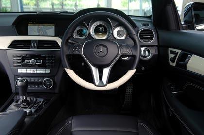 แผงหน้าปัดรถยนต์ 2 ประตูรุ่นล่าสุดคันนี้ยังคงสะท้อนสายพันธุ์สปอร์ตด้วยวัสดุที่ใช้ในการตกแต่งขั้นสูง พวงมาลัยมัลติฟังก์ชันดีไซน์สปอร์ตแบบ 3 ก้านใช้วัสดุประเภทโครเมี่ยมที่ก้านกลางในแบบที่เปิดตัวครั้งแรกบนตัวรถ CLS-Class หุ้มด้วยหนังแท้ Nappa สีทูโทน และระบบเปลี่ยนเกียร์ที่พวงมาลัย (Steering-wheel gearshift paddles) ทำให้มีการปรับเปลี่ยนอัตราทดตามมือของผู้ขับขี่ด้วยความรวดเร็วเหมือนกับการขับรถแข่งฟอร์มูลา 1 นอกจากนี้ ยังเป็นครั้งแรกของวิศวกรรมยานยนต์จากค่ายตราดาวที่มีการตกแต่งภายในด้วยลายไม้ piano lacquer สีขาวมุกแบบพอร์สเลน (porcelain) ที่แผงข้างประตู และบริเวณคอนโซลหน้า ซึ่งเป็นสีพิเศษทำมาเฉพาะรถสปอร์ตรุ่น C-Class Coupe Edition 1 เท่านั้น เบาะนั่งสไตล์สปอร์ตที่ให้ความรู้สึกนุ่มสบายกระชับตัว หุ้มด้วยหนัง ARTICO สีดำ ตกแต่งด้วยตะเข็บสีพอร์สเลน (porcelain)