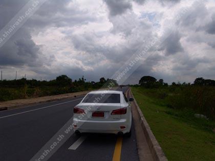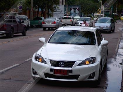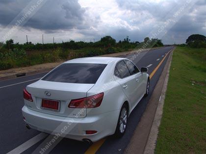 ถนนที่ใช้ขับทดสอบ IS250 ในวันนี้เป็นเส้นทางในกรุงเทพมหานครทั้งหมด เนื่องจากฟ้าฝนที่ไม่เป็นใจซึ่งตกกระหน่ำมาหลายวัน จนทำให้ถนนรอบนอกบางสาย ที่ผมตั้งใจจะไป มีน้ำท่วมขังผิวการจราจร และอาจก่อปัญหาให้กับรถทดสอบราคา 3 ล้านกว่าบาทคันนี้ก็ได้ จึงต้องล้มเลิกความตั้งใจ ที่จะขับทดสอบทางไกลไปโดยปริยาย ภายในที่หรูหราจากการคัดสรรวัสดุคุณภาพสูง ที่ยอดเยี่ยมไร้ที่ติ ตามแบบฉบับของ Lexus ที่ใส่ใจในเรื่องของคุณภาพในไลน์การประกอบ การจัดวางตำแหน่งของอุปกรณ์ต่างๆ ภายในห้องโดยสารมีความลงตัวและใช้งานได้อย่างง่ายดาย ด้วยการเรียนรู้เพียงไม่กี่ครั้ง Sunroof ไฟฟ้า ยังช่วยทำให้ Cockpit ของ IS250 สว่างขึ้นยามที่ท้องฟ้าของกรุงเทพฯ ถูกปกคลุมไปด้วยเมฆฝนหนาทึบ สิ่งที่ชอบมากที่สุดคือ ระบบเสียงจากเครื่องเสียงชั้นเยี่ยมเกรดสูงของ Mark Levinson พร้อมด้วยลำโพงทั้ง 14 ดอก ที่ให้เสียงเพลงในระดับทะลุมิติ มันมีทั้งความคมชัด พลังของเบสที่หนักแน่น และเสียงแหลมที่ใสปิ๊ง จนทำให้การขับขี่ไปตามเส้นทางต่างๆ มีสีสันมากยิ่งขึ้น ผมค่อยๆ เติมคันเร่ง เพื่อทำความคุ้นเคยกับตัวรถ ก่อนจะอัดหนักๆ บนทางตรง ที่ความเร็วต่ำแถบพหลโยธิน-ลาดปลาเค้า-นวมินทร์-สุขาภิบาล 1 เจ้า IS250 ดูสุขุมนุ่มลึก จนมีบุคลิกคล้ายกับผู้ใหญ่ที่สุภาพ มันเคลื่อนตัวไปอย่างสง่างามและมั่นคง ราวกับถูกโปรแกรมมาเพื่อการขับขี่ โดยเฉพาะระบบรองรับด้านหน้าแบบดับเบิ้ลวิชโบน บวกกับด้านหลังที่เป็นแบบมัลติลิงค์ ซึมซับรอยต่อและคอสะพานดุๆ ได้อย่างหมดจด ส่งถ่ายความรู้สึกที่หนึบแน่น ถึงแม้มันจะใช้พวงมาลัยไฟฟ้า EPS-Electronic Power Steering แต่ความรู้สึกที่ส่งตรงจากช่วงล่างมายังพวงมาลัย แทบไม่มีความแตกต่างจากระบบเพาเวอร์สายพาน แถมยังช่วยลดการใช้กำลังจากเครื่องยนต์ได้อีกด้วย