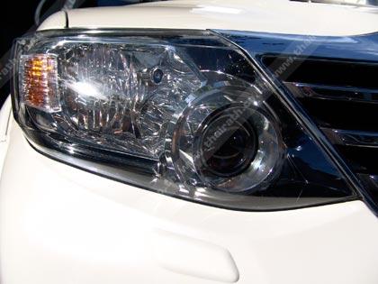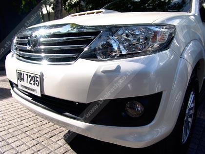 เมื่อมองดู รูปทรงด้านหน้าของ New Fortuner ก็จะพบว่าความเปลี่ยนแปลงในครั้งนี้ทำออกมาได้ดีและสมบูรณ์แบบพอสมควรเลยที เดียวจากการปรับเปลี่ยนทั้งกระจังหน้าแบบใหม่ที่เน้นเหลี่ยมคมกับความเงาของ โครเมี่ยมบนตัวกระจังทรง 5 เหลี่ยม ไฟหน้าแบบ Projector HID ยังถูกดีไซน์ให้เข้ากับรูปแบบของกระจัง ชุดไฟหน้า HID ยังทำงานด้วยการปรับมุมของลำแสงแบบอัตโนมัติเมื่อขับขี่ในตอนกลางคืนพร้อม ช่องฉีดน้ำทำความสะอาดโคมไฟยามลุยหนักมา บริเวณกลางฝากระโปรงหน้ายกสันนูนเพื่อเล่นมิติและแสงเงาให้ดูดีขึ้น สคูปดักอากาศเพื่อระบายความร้อนให้กับเทอร์โบมีขนาดโตขึ้น จัดวางตำแหน่งอยู่ในแนวกึ่งกลางของฝากระโปรงหน้า ส่วนกันชนหน้าหรือสปอยเลอร์ด้านหน้ามีความสอดรับกับกระจังและชุดไฟ ลายเส้นหน้ากระจังแบบแนวนอนผลิตจากพลาสติกสีดำที่ทำออกมาเป็นร่องยาวๆเสริม มุมมองให้ดุดันขึ้นกว่ารุ่นที่ผ่านมา ติดตั้งไฟตัดหมอกทรงกลมฝั่งละดวง โดยภาพรวมแล้ว รูปลักษณ์ด้านหน้าแบบใหม่ของเจ้า New Fortuner ดูคล้ายรถเก๋งมากขึ้นจากความจงใจในการออกแบบ