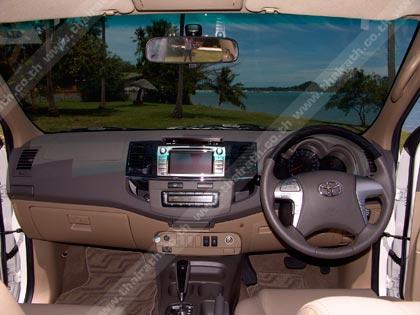 ห้องโดยสารของ New Fortuner ใส่อุปกรณ์เพิ่มเติมเพื่ออำนวยความสะดวกในการใช้งานมากกว่ารุ่นที่แล้วพอ สมควร คอนโซลยังคงรูปแบบเดิมแต่ปรับเปลี่ยนจอมัลติฟังก์ชั่นรุ่นใหม่เข้ามาแทนที่ วงพวงมาลัยแบบสี่ก้านคล้ายกับของ Toyota Camry มีสวิชท์มัลติติดมาให้เพื่อปรับชุดเครื่องเสียงและโทรศัพท์ไร้สายแบบ Bluetooth วงพวงมาลัยหุ้มหนังมีลายไม้ที่ด้านบนกับตำแหน่งของก้านควบคุมความเร็ว อัตโนมัติ Cruise Control ที่มุมขวาด้านล่างติดกับคอพวงมาลัยและก้านสวิชท์เปิด-ปิดไฟหน้าอัตโนมัติ ผ่านการทำงานของเซนเซอร์ตรวจจับแสงสว่างที่จะสั่งให้เปิดไฟหน้าทันทีที่แสง สว่างไม่พอต่อการมองเห็น ในรุ่นสูงสุดของ Toyota New Fortuner ใช้เบาะหุ้มหนังแท้ ตำแหน่งเบาะคนขับสามารถปรับตั้งความสูง-ต่ำ ใกล้-ไกลด้วยไฟฟ้า แผงประตูฝั่งคนขับมีสวิชท์ควบคุมกระจกมองข้างและสวิชท์เปิดปิดกระจกบานประตู ไฟฟ้า รวมถึงการปรับตั้งมุมของกระจกมองข้างพร้อมกลไกพับเก็บกันมอเตอร์ไซค์เฉี่ยว ชน ห้องโดยสารแบบ 7 ที่นั่งสามารถพับเบาะหลังเพื่อเพิ่มพื้นที่ในการขนสัมภาระ ที่เก็บแว่นตา ช่องวางแก้วน้ำ ตะขอแขวนสิ่งของท้ายรถ และช่องแแอร์ในบริเวณเบาะนั่งแถวที่ 2-3 พร้อมระบบปรับอากาศอัตโนมัติแบบสองตอน
