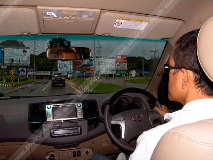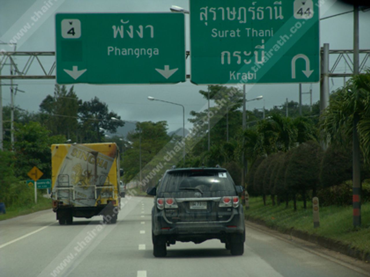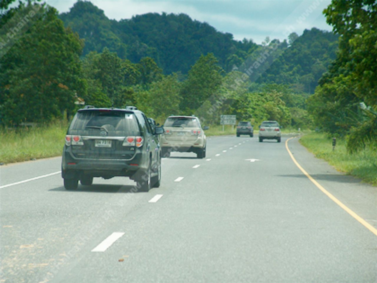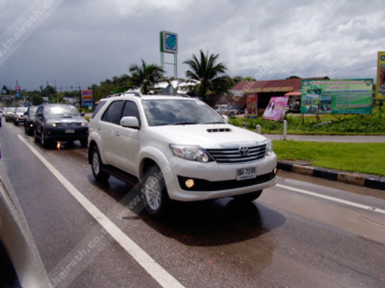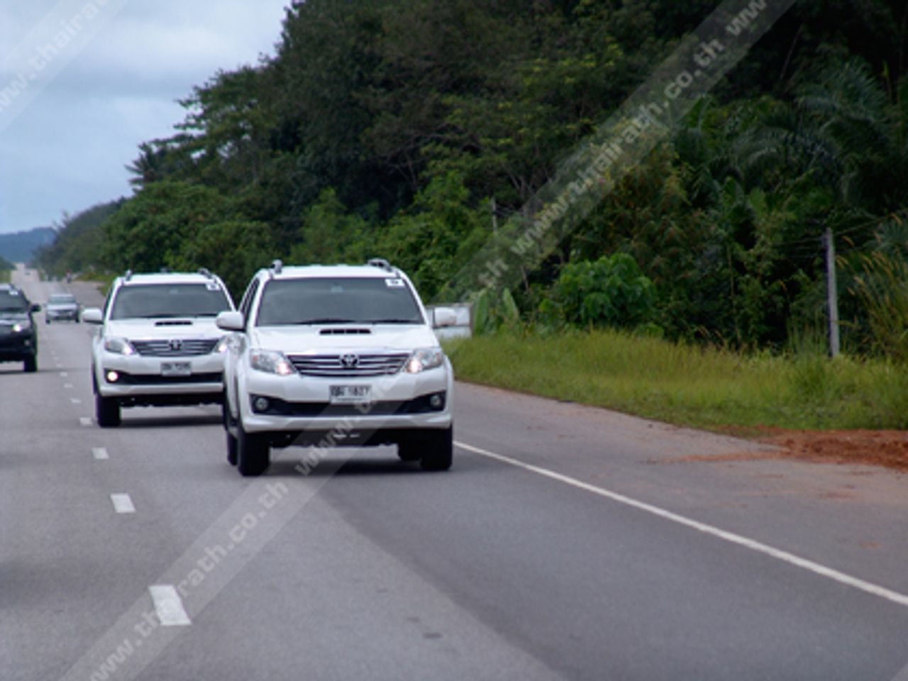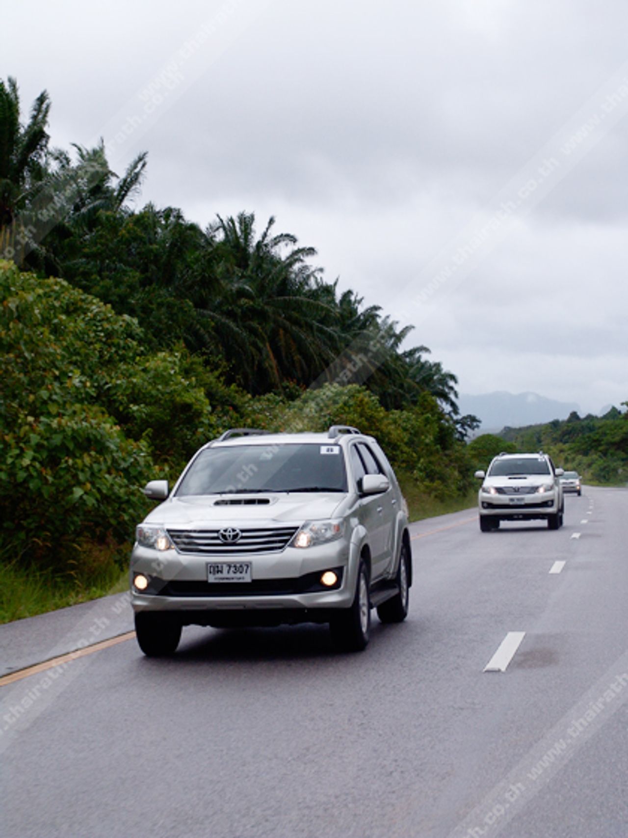 9.45 นาที เครื่องบิน Airbus A300 ของสายการบินไทยก็ร่อนลงแตะพื้นรันเวย์ของท่าอากาศยานจังหวัดกระบี่โดยใช้เวลาบินจากท่าอากาศยานนานาชาติสุวรรณภูมิประมาณ 50 นาที หลังจากนั้น สื่อมวลชนกลุ่มแรกที่จะลงทำการทดสอบตัวรถ New Fortuner ก็ร่วมกันเข้าฟังบรรยายสรุป สมรรถนะและอุปกรณ์ในตัวรถจากวิศวกรของ Toyota รวมถึงสภาพเส้นทางกับจุดแวะพักต่างๆที่จะต้องขับผ่านตาม Route ที่ทีมพีอาร์ของค่ายสามห่วงกำหนด สำหรับการทดสอบในภาคเช้า ผมจับคู่กับคุณยุทธพงษ์ ภาษี หรือพี่กุ้ง อาจารย์สอนการขับขี่รถยนต์ นักทดสอบรถและคอลัมนิสต์ของหนังสือพิมพ์กรุงเทพธุรกิจกับคมชัดลึก โดยใช้ตัวรถ Toyota New Fortuner Minor Change 3.0 A/T 2WD เกียร์อัตโนมัติ 4 สปีดสี Silky Gold Mica Metallic 5A7 ซึ่งพี่กุ้งจะรับหน้าที่ไม้แรกสุดที่เริ่มต้นสตาร์ตจากท่าอากาศยานในจังหวัด กระบี่ไปยังร้านอาหารลำพู 1 ที่ตั้งอยู่ในจังหวัดสุราษฎร์ธานี ท่ามกลางเมฆฝนที่ตั้งเค้ามาตั้งแต่เช้าและเริ่มโปรยปรายลงมาหลังจากขบวน ทดสอบ New Fortuner Minor Change ทั้ง 10 คันรวมรถเจ้าหน้าที่ทีมพีอาร์ของ Toyota อีก 4 คันวิ่งออกจากสนามบินเพียงแค่ 10 นาทีเท่านั้น