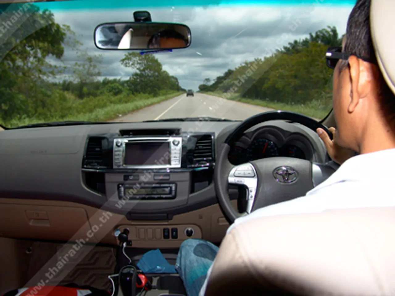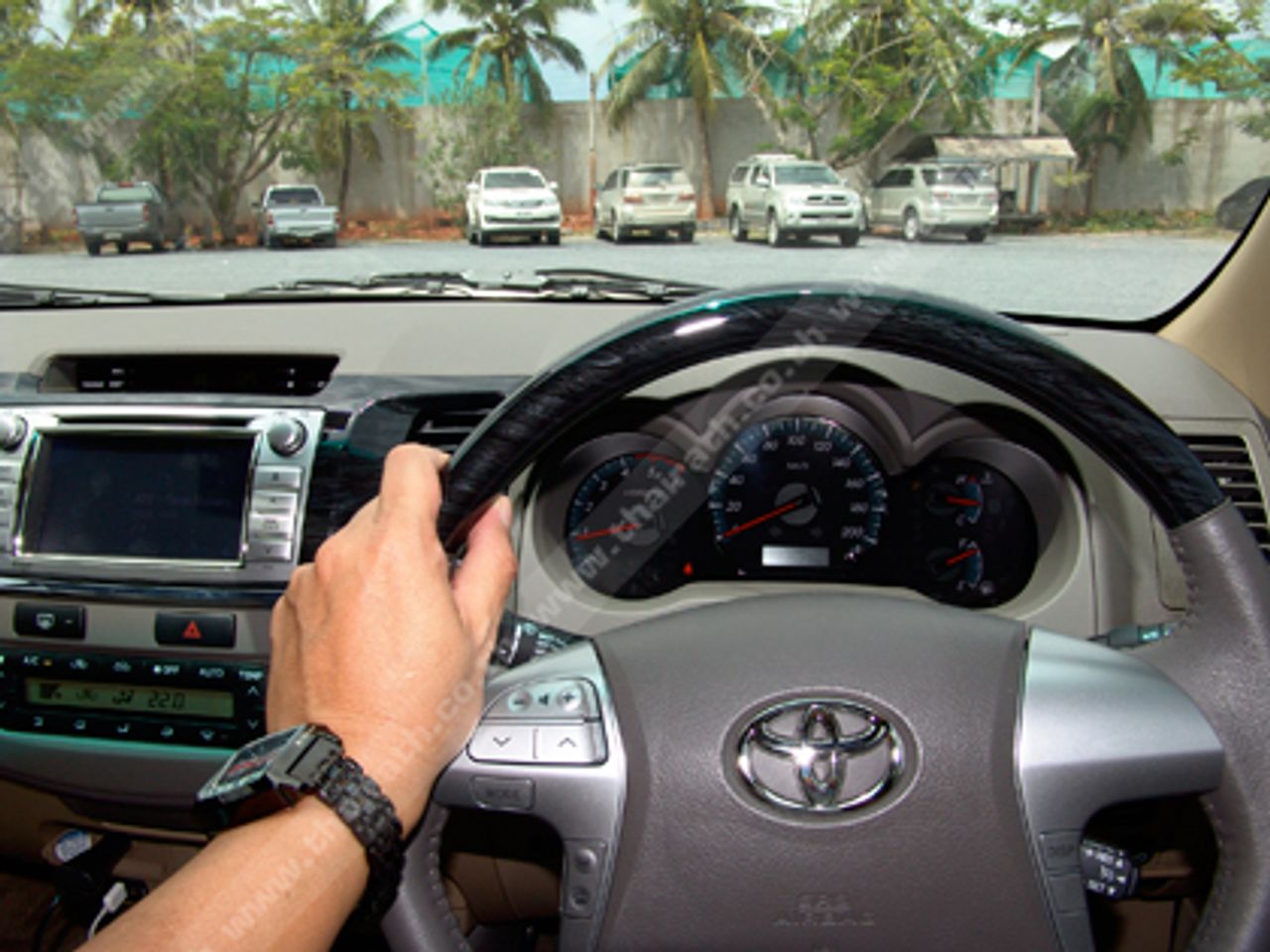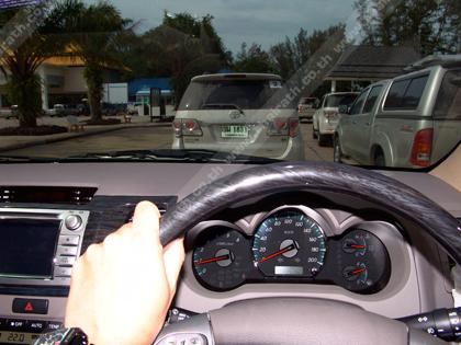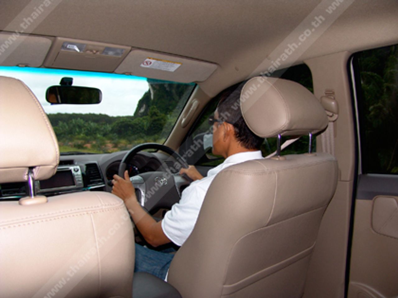 ขบวนทดสอบ New Fortuner มาถึงสามแยกไฟแดงในอำเภอปากลังแล้วเลี้ยวขวามุ่งหน้าไปยังจังหวัดพังงาบน ทางหลวงหมายเลข 4 ผมสังเกตว่าภายในห้องโดยสารของเจ้า New Fortuner Minor Change 3.0 A/T 2WD ใช้สีแบบทูโทนเทาเข้มในชุดคอนโซลบวกสีน้ำตาลอ่อนเพื่อความสบายตา รูปแบบของ Cockpit ห้องโดยสารยังคงไม่เปลี่ยนแปลงมากนัก แต่มีรูปแบบและอุปกรณ์ใหม่เข้ามาช่วยเสริมการใช้งานให้สะดวกสบายขึ้น เบาะคู่หน้าหุ้มหนังแท้สีน้ำตาลมีขนาดที่พอดีกับสรีระ ตัวเบาะคนขับปรับด้วยมอเตอร์ไฟฟ้าโดยสามารถปรับสูง-ต่ำ-เข้า-ออกได้กว้างมากยิ่งขึ้น ชุดเครื่องเสียงจอมัลติฟังก์ชั่นแบบสัมผัสกับช่องเชื่อมต่ออุปกรณ์เล่นเพลง จากภายนอกแบบ USB iPod เติมเต็มระบบให้ความบันเทิงของตัวรถ ลำโพงให้เสียงที่ชัดเจนและคม มีมิติที่ใช้ได้ ระบบปรับอากาศแบบดิจิตอลที่ขึ้นชื่อของ Toyota ให้ความเย็นทั่วทั้งห้องโดยสารและยังมีช่องแอร์บนเพดานเป่าให้กับเบาะหลัง อีกด้วย อากาศที่อบอ้าวหลังฝนตกจากภายนอกจึงไม่สร้างปัญหาให้กับการเดินทางไกลในครั้งนี้ ทัศนวิสัยมุมมองโปร่งโล่ง มองเห็นได้ดีรอบคันโดยมีเสาหลังที่อาจบดบังมุมมองอยู่บ้าง วัสดุที่ใช้ทำภายในดูดีสมราคาค่าตัว ทั้งพลาสติกคอนโซล วงพวงมาลัยหนังบวกไม้ที่หรูหรา หัวเกียร์ออโต้ ที่ชอบมากคือช่องใส่แก้วน้ำ ที่เก็บแว่นตาบนเพดานตอนหน้า พนักเท้าแขนบนงานประกอบห้องโดยสารที่มีความประณีตในระดับที่ดี