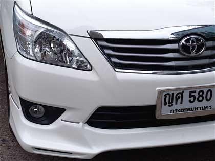 เมื่อลองสังเกตรูปทรงด้านหน้าของ Toyota Innova Minor Change จะพบกับความเปลี่ยนแปลงไปบ้างทั้งไฟหน้าที่ดูดีขึ้น กระจังหน้าคล้ายกับ Vigo และ Fortuner ใช้งานพลาสติกชุบโครเมี่ยมเงาวาว เน้นเหลี่ยมมุมคมๆ ของชุดกระจังที่เข้ากับดีไซน์ของไฟหน้าแบบใหม่ ชิ้นสปอยเลอร์หน้ากว้างขึ้น กึ่งกลางมีช่องรับอากาศเป็นพลาสติกสีดำ มุมทั้งสองข้างของสปอยเลอร์หน้าเป็นที่อยู่ของไฟตัดหมอกทรงกลม กับชิ้นงานสเกิร์ตใต้ชายล่างของสปอยเลอร์หน้าที่ทำให้มุมมองของมันดูดีขึ้น ส่วนรูปทรงด้านข้างของตัวรถเน้นความโปร่งโล่งโดยใช้กระจกบานประตูรวมถึง กระจกที่อยู่ใกล้กับเสาท้ายเพื่อเพิ่มทัศนวิสัยที่ดียามขับขี่ มือจับประตูกับคิ้วกันกระแทกใช้พลาสติกโครเมี่ยมเพิ่มเติมมุมมอง กระจกมองข้างยังมีไฟเลี้ยวอยู่ภายใน ช่วยในเรื่องของความปลอดภัยยามต้องการเปลี่ยนเส้นทาง ส่วนเสาด้านหน้าใช้การออกแบบโดยมีองศาของการเอนคล้ายกับรถเก๋งทั่วไป เพื่อส่งผลดีในเรื่องของค่าสัมประสิทธิ์แรงต้านทานของอากาศ เนื่องจากมันเป็นรถ Compact MPV ซึ่งจะมีความสูงโย่งมากกว่ารถทั่วไปเล็กน้อย
