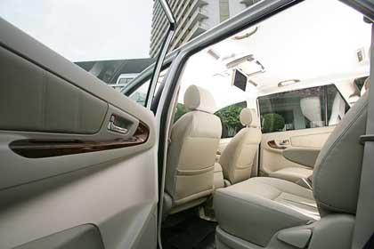 ห้องโดยสารแบบ 6 ที่นั่งใช้คอนโซลรูปแบบเดียวกันกับ Toyota Vigo และ Fortuner Minor Change การใช้วัสดุภายในร่วมกันของทั้งสามโมเดลเพื่อลดต้นทุนในไลน์การประกอบซึ่งจะส่งผลไปถึงราคาค่าตัวที่ไม่สูงจนเกินไป รูปแบบของคอนโซลใน Innova Minor Change ใช้สีทูโทนเทา-ดำเน้นมิติและมุมมองที่สวยงาม งานพลาสติกของคอนโซลกลางดูธรรมดาไปสักนิด แต่มีชุดเครื่องเสียงระบบสัมผัสหรือจอ LCD Multifunction TouchScreen ขนาด 6.1 นิ้ว รองรับการเล่นแผ่น CD-DVD-MP3 AM-FM พร้อมช่องเชื่อมต่อ USB-iPot กับระบบเชื่อมต่อโทรศัพท์แบบไร้สายหรือ Bluetooth กลางเพดานห้องโดยสารยังมีจอภาพ LCD ขนาด 10.2 นิ้วสำหรับให้ความบันเทิงกับผู้โดยสารตอนหลังแบบรถครอบครัวชั้นดี เบาะนั่งทั้ง 6 ตำแหน่งมีพนักเท้าแขนห่อหุ้มด้วยหนังแท้สีสว่างตา สามารถปรับเปลี่ยนรูปแบบของเบาะนั่งเช่นพับเก็บเพื่อเพิ่มพื้นที่ในการขนสัมภาระ รวมถึงพื้นที่เก็บของเมื่อเปิดฝาท้าย ระบบปรับอากาศแบบดิจิตอลที่คอนโซลกลางกับชุดปรับอากาศเพิ่มความเย็นสบายให้กับผู้โดยสารตอนหลัง