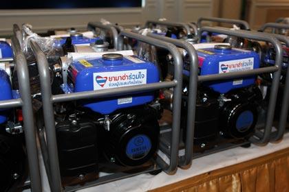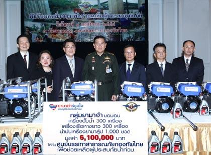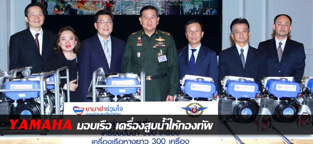 มร.ทากาอากิ คิมูระ กรรมการผู้จัดการอาวุโส บริษัท ยามาฮ่ามอเตอร์ จำกัด มร.ฟูมิอากิ นางาชิมา ประธานกรรมการบริหาร และนายประพันธ์ พลธนะวสิทธิ์ รองประธานกรรมการบริหาร บริษัท ไทยยามาฮ่ามอเตอร์ จำกัด มอบเรือหางยาว 300 เครื่อง เครื่องสูบน้ำ 300 เครื่อง และน้ำมันเครื่อง มูลค่ารวมกว่า 6.1 ล้านบาท ให้กับพลเอกธนะศักดิ์ ปฏิมาประกร (กลาง) ผู้บัญชาการทหารสูงสุด เพื่อใช้ในภารกิจบรรเทาทุกข์ผู้ประสบอุทกภัยของศูนย์บรรเทาสาธารณภัย กองทัพไทย อันเป็นส่วนหนึ่งของโครงการ “ยามาฮ่าร่วมใจช่วยผู้ประสบภัยน้ำท่วม” ที่กองบัญชาการกองทัพไทย