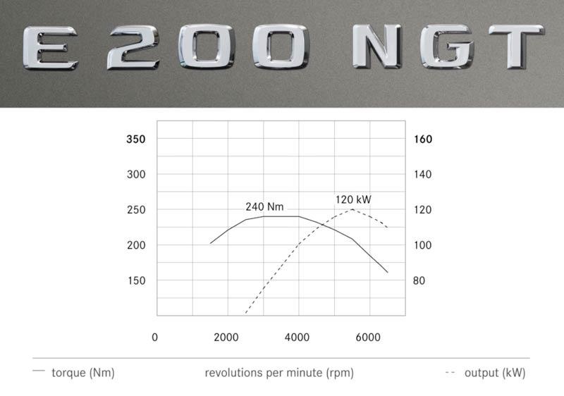 เครื่องยนต์ มีสมรรถนะที่ดีขึ้น และทำงานได้อย่างราบเรียบไร้สิ้นซึ่งอาการกระตุกกระชากระหว่างการสลับสับ เปลี่ยนจากก๊าซไปเป็นเชื้อเพลิงเบนซิน สำหรับ Mercedes Benz E200 NGT BuleEFFICIENCY ELEGANCE ได้ติดตั้งถังแก๊สที่ผลิตขึ้นจากเหล็กกล้าที่มีความแข็งแกร่งทนทานเป็นพิเศษ จำนวน 3 ถัง (ลดลงจากรุ่นที่แล้วซึ่งมี 4 ถัง) มีความจุรวม 19.5 กิโลกรัม และสามารถวิ่งได้ระยะทางประมาณ 300 กิโลเมตร ซึ่งเมื่อรวมน้ำมันเชื้อเพลิงเต็มถังอีก 80 ลิตร E200 NGT BuleEFFICIENCY ELEGANCE จะวิ่งได้ระยะทางมากถึง 1,000 กิโลเมตร นอกจากนั้นเครื่องยนต์ตัวนี้ยังสามารถเติมเชื้อเพลิงแบบ E20 ได้อีกด้วย โดยระบบจะสลับโหมดการใช้ก๊าซและน้ำมันด้วยตัวเองแบบอัตโนมัติในกรณีที่เชื้อเพลิงอย่างใดอย่างหนึ่งหมดลงก่อน