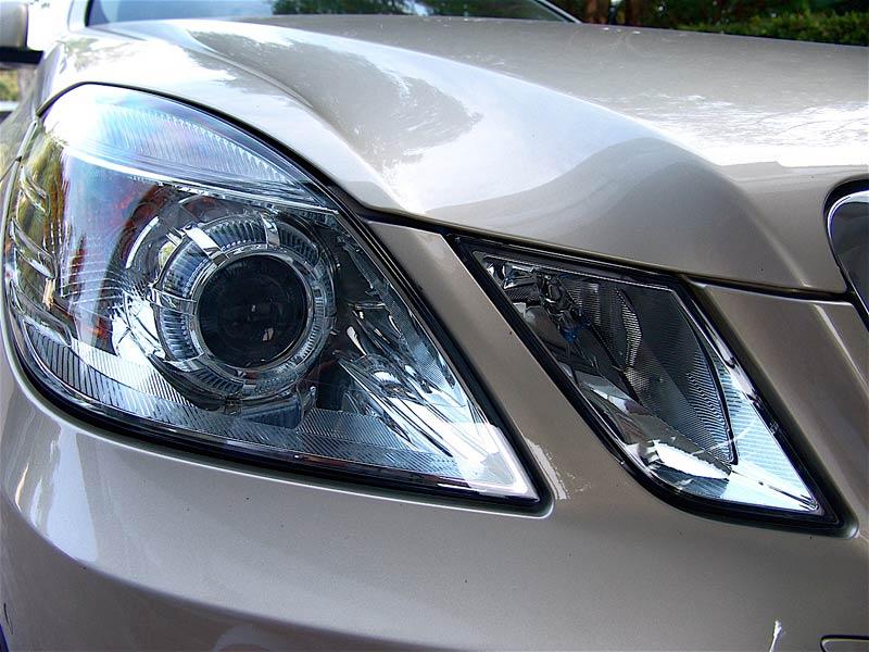 Mercedes Benz E200 NGT BlueEFFICINECY ELEGANCE ยนตรกรรมหรูหราที่ผ่านการขัดเกลาในโมเดล E-Class มายาวนานมากกว่า 50 ปีแล้ว นับจากโมเดลแรกสุดจนถึงปัจจุบันรหัส W212 รูปลักษณ์ที่ปราดเปรียวสง่างามเกิดจากขั้นตอนการออกแบบที่มุ่งเน้นไปที่ความสะดวกสบายในการใช้งานเป็นสำคัญ เมื่อมองจากด้านหน้าจะพบว่ากระจังหน้าและไฟหน้าแบบแยกชิ้นมีความกลมกลืนของเส้นสายที่ตัดกันอย่างลงตัว กระจังหน้าโครเมี่ยมทรงห้าเหลี่ยม ไฟหน้าแบบแยกชิ้นซึ่งภายในกรอบไฟหน้าแบบโพลิเมอร์ใสมีไฟโปรเจกเตอร์ ชุดสปอยเลอร์ชิ้นใหญ่คลุมไปจนถึงแนวของฝากระโปรงหน้า ส่วนไฟตัดหมอกเปลี่ยนจากไฟ LED Daylight Runing มาเป็นไฟตัดหมอกทรงกลมข้างละสองดวงรวมเป็นสี่ดวงซึ่งคล้ายกับไฟตัดหมอกที่เป็นชุดแต่งของ Carlson ใต้กระจังหน้ามีตะแกรงพลาสติกสีดำ ทำหน้าที่รับอากาศเข้าไประบายความร้อนร่วมกับกระจังหน้าทรงห้าเหลี่ยมให้กับเครื่องยนต์ ฝากระโปรงมีแนวโค้งที่สอดประสานไปกับชุดไฟหน้าได้อย่างกลมกลืนโดยยกแนวสันนูนขึ้นเล็กน้อยบริเวณกึ่งกลางเพื่อเน้นมิติของแสงเงา