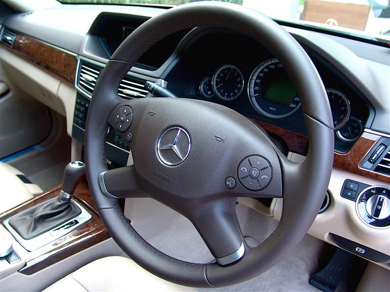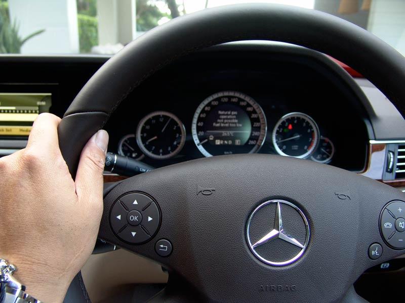 วงพวงมาลัยแบบสี่ก้าน หุ้มหนังแท้จับได้อย่างกระชับมือ มีสวิตช์มัลติฟังก์ชั่นมาให้ปรับแต่งเครื่องเสียง รับหรือวางโทรศัพท์ไร้สายแบบ Bluetooth ส่วนการปรับตั้งระบบตั้งความเร็วแบบอัตโนมัติหรือ Cruise Control หน้าปัดวัดความเร็วถูกออกแบบให้อยู่ในตำแหน่งใจกลางเพื่อให้อ่านค่าได้ง่าย มีตัวเลขความเร็วถึง 260 กิโลเมตรต่อชั่วโมง แต่วิ่งจริงคงไม่ถึง ส่วนหน้าปัดวัดรอบเครื่องยนต์อยู่ทางขวามือ มีตัวเลขให้มาถึง 8,000 รอบต่อนาที หน้าปัดด้านซ้ายมือเป็นนาฬิกาแบบดิจิตอลแต่ใช้รูปแบบเป็นเข็มเพื่อความคลาสสิก ผ้าหุ้มหลังคาโทนสีน้ำตาลอ่อนซึ่งเป็นสีเดียวกันกับตัวเบาะในรถคันทดสอบช่วยทำให้แสงและเงาของห้องโดยสารเจ้า New E-Class NGT มีความนุ่มละมุนมากขึ้นจากการเลือกใช้เฉดสีและวัสดุอุปกรณ์ภายในที่มีความเชื่อมโยงกันอย่างกลมกลืนมากที่สุดแล้ว