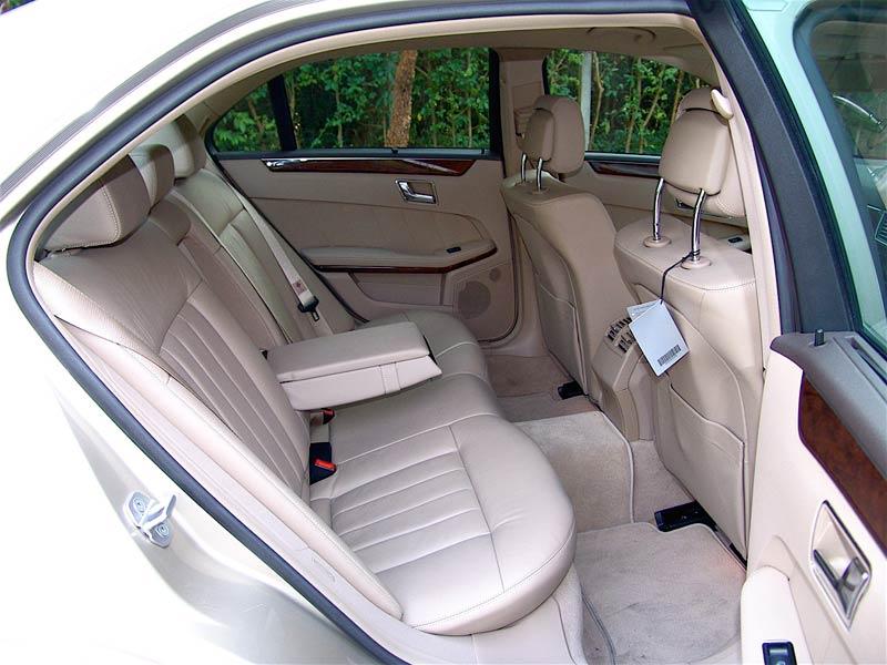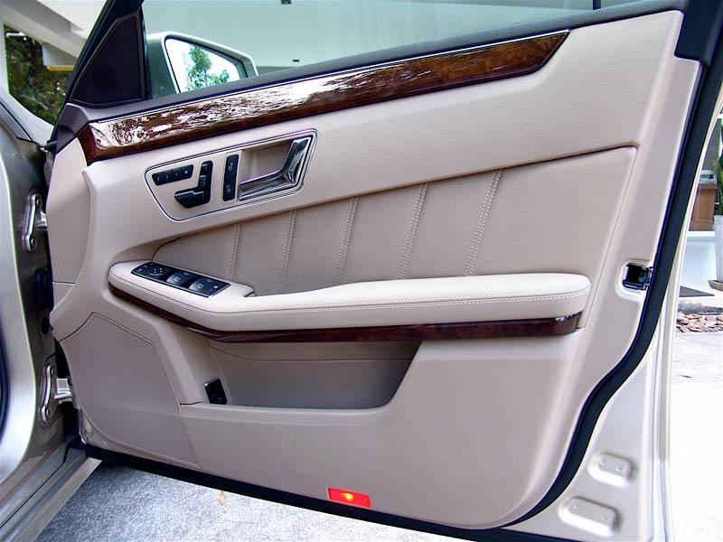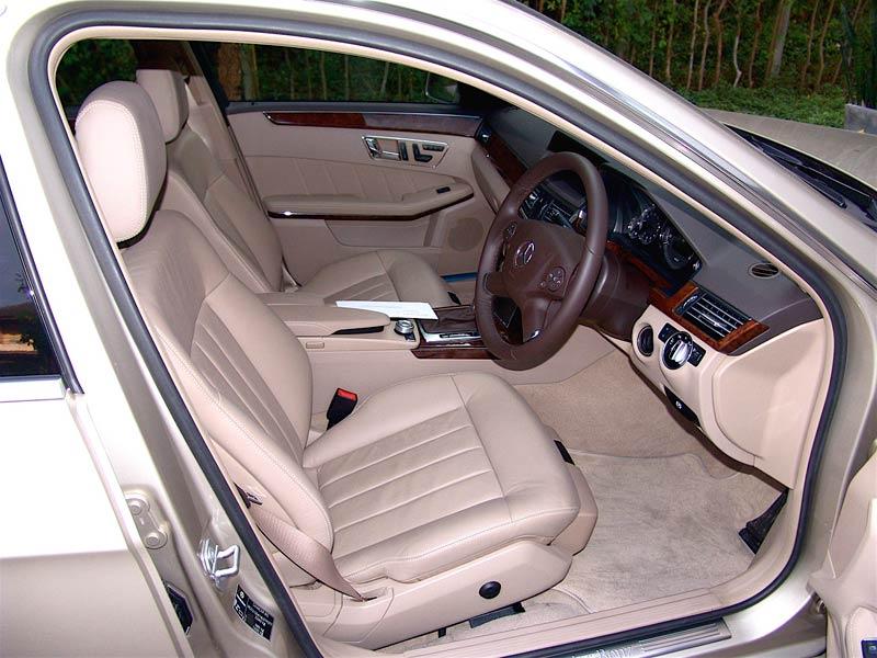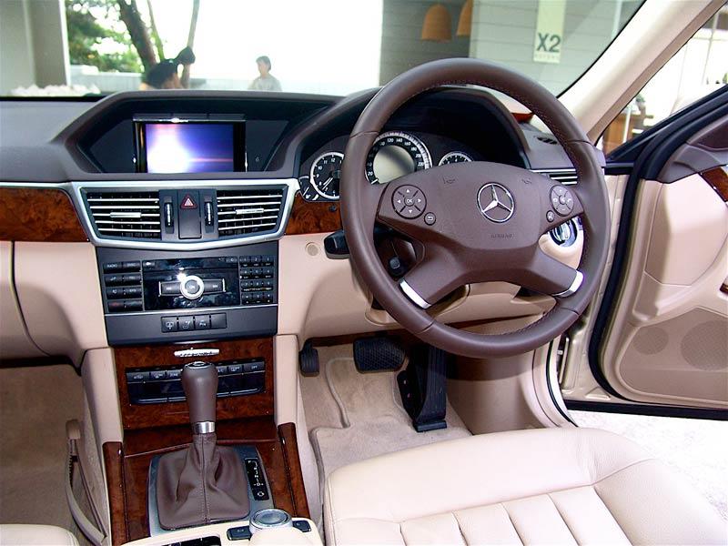 ภายในห้องโดยสารของ E200 NGT BlueEFFICINECY ELEGANCE มีสิ่งที่โดดเด่นมากที่สุด นั่นก็คือตำแหน่งของการนั่งขับขี่ควบคุมซึ่งถูกแผนกออกแบบของ Mercedes Benz บรรจงใส่อุปกรณ์อำนวยความสะดวกโดยมุ่งเน้นไปที่คนขับเป็นพิเศษ เบาะนั่งทุกตำแหน่งหุ้มด้วยหนังแท้คุณภาพสูง ตัดเย็บด้วยงานฝีมือในระดับที่ประณีตสูงสุด เบาะคู่หน้าปรับตั้งท่าทางด้วยมอเตอร์ไฟฟ้า พร้อมบันทึกตำแหน่งท่านั่งได้สามระดับ ส่วนเบาะของผู้โดยสารตอนหลังมีสามที่นั่ง พร้อมเข็มขัดนิรภัยแบบดึงกลับอัตโนมัติในทุกตำแหน่ง ใต้เบาะคู่หน้ายังมีช่องเก็บของกระจุกกระจิก โทนสีภายในของ Mercedes Benz E200 NGT เน้นไปที่ความสุขุมนุ่มลึกโดยใช้คอนโซลสีดำเพื่อลดแสงสะท้อนยามต้องขับขี่ ท่ามกลางแสงแดด ส่วนตัวเบาะและแผงประตูในรถคันทดสอบใช้สีน้ำตาลอ่อน บวกกับลายไม้สีเข้มที่คาดกลางชุดคอนโซล แผงประตูก็ยังมีงานลายไม้คาดกลางกับมือจับประตูที่หุ้มหนังแท้โดยโชว์การเย็บด้วยตะเข็บด้ายสีขาวเช่นเดียวกับเบาะนั่งทุกตำแหน่ง