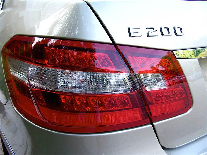 บั้นท้ายใน โมเดล W212 ของ E-Class ตัวใหม่ล่าสุดถูกปรับเปลี่ยนไฟท้ายใหม่หมด โดยหันไปใช้ไฟท้ายทรงยาวแทนที่ไฟท้ายทรงสามเหลี่ยมจากที่เคยใช้กันมานานหลาย รุ่นก่อนหน้านี้ ไฟท้ายทรงยาวของ New E-Class ถูกออกแบบมาเพื่อให้เข้ากับฝาท้ายที่มีแนวสันนูนตรงกลาง เหนือตำแหน่งติดตั้งแผ่นป้ายทะเบียนมีชิ้นงานพลาสติกโครเมี่ยมคาดกลาง สปอยเลอร์หลังแบบเรียบๆ พร้อมกับท่อระบายไอเสียสเตนเลสทรงกลมเดี่ยวๆ วางตำแหน่งอยู่ใต้ชายล่างของชุดสปอยเลอร์หลัง ส่วนไฟเบรกดวงที่สามติดตั้งอยู่ด้านในของกระจกบานหลังในตำแหน่งกึ่งกลางโดย ใช้หลอด LED อยู่ในกรอบพลาสิกสีแดงซึ่งออกแบบให้เห็นได้อย่างชัดเจนเพื่อความปลอดภัย