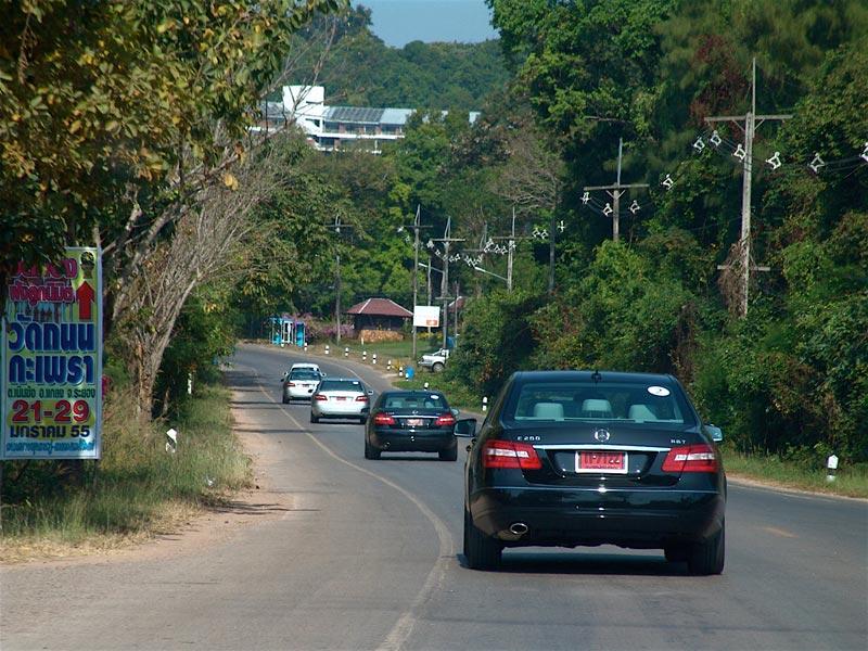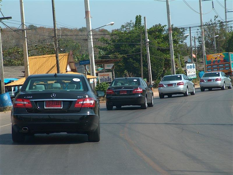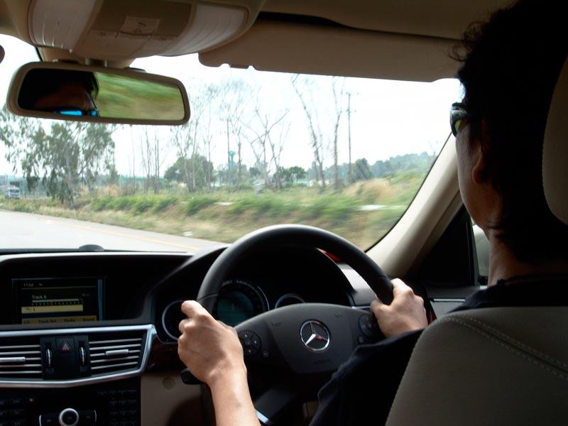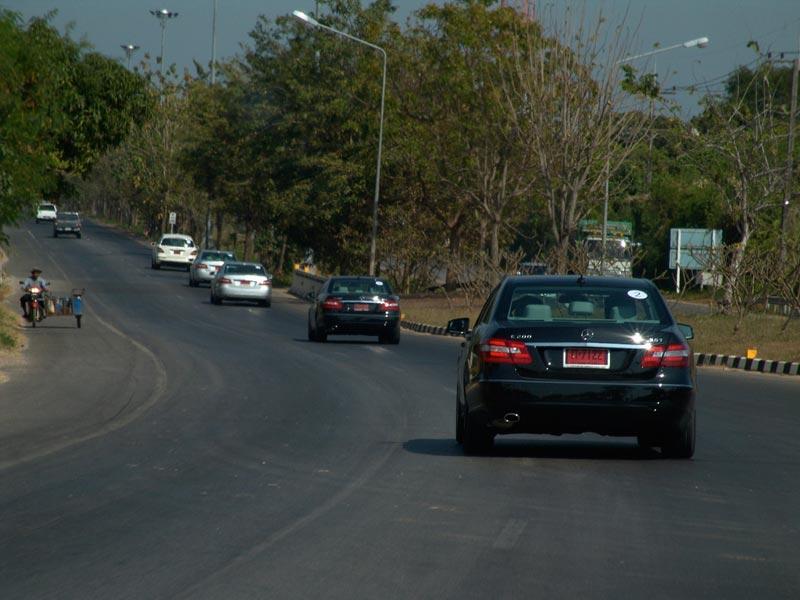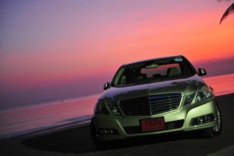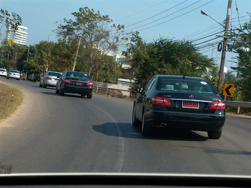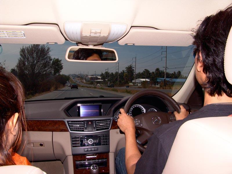 ผมจับคู่กับ Kingsley ผู้สื่อข่าวของหนังสือพิมพ์ The Nation เหมือนเช่นเคย หลังจากเดินทางไปชมงานโตเกียวมอเตอร์โชว์ด้วยกันเมื่อช่วงต้นเดือนธันวาคม 2554 ไม้แรกจึงเป็นหน้าที่ของเพื่อนเลิฟ Kingsley เข้ามารับหน้าที่ขับตั้งแต่ออกจากโชว์รูม Benz TTC ไปจนถึงเขตจังหวัดระยอง โดยมีผมนั่งในเบาะผู้โดยสารตอนหลังเพื่อจับอาการของตัวรถเหมือนเคย รถยนต์ซีดานในโมเดล E-Class W212 เพียบพร้อมไปด้วยอุปกรณ์อำนวยความสะดวกมากมาย เบาะนั่งตอนหลังถูกออกแบบให้นั่งได้ 3 คน (ผู้ใหญ่ 2 + เด็ก 1 คน) ตำแหน่งกลางเบาะหลังยังสามารถดึงพนักเท้าแขนเพื่อเพิ่มเติมความสบายยามเดินทางไกล ใต้พนักเท้าแขนยังมีแผ่นพลาสติกสีดำที่สามารถดึงออกมาเป็นที่ีวางแก้วน้ำได้อีกด้วย เบาะหลังที่นั่งสบายบวกกับช่วงล่างนุ่มๆ ในโมเดลซีดานขนาดกลางของ Mercedes Benz คันนี้จะทำให้คนนั่งรู้สึกผ่อนคลาย เหมาะมากกับท่านที่ไม่นิยมขับรถด้วยตัวเองรวมถึงผู้บริหารระดับสูงที่ต้องเดินทางไปประกอบธุรกิจตลอดเวลา