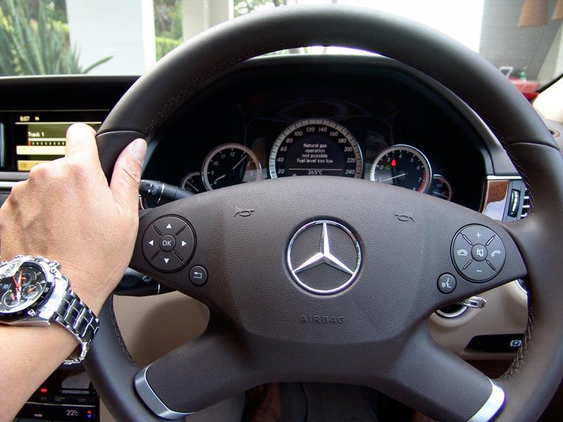 เมื่อขบวนรถทดสอบ ของ Mercedes Benz วิ่งเข้าสู่เส้นทางบ้านบึง แกลง ซึ่งเป็นทางหลวงสายหลักที่เชื่อมต่อระหว่างจังหวัดชลบุรีกับจังหวัดระยอง รถบนถนนหนทางในช่วงนี้เริ่มน้อยลงเนื่องจากเป็นวันอังคาร Kingsley ผู้สื่อข่าวของหนังสือพิมพ์ The Nation ลองทดสอบหาอัตราเร่งและความเร็วในระดับเดินทางไกลรวมถึงการทรงตัวยามหักพวงมาลัยเพื่อเปลี่ยนทิศทางรถ Mercedes Benz E 200 NGT BlueEFFICIENCY ELEGANCE สีทองแบบอาเสี่ยเยาวราชคันนี้มีระบบบริหารเชื้อเพลิงสองรูปแบบ โดยสมองกล ECU ซึ่งเป็นกล่องควบคุมจะทำการปรับการใช้เชื้อเพลิงแบบแก๊ส NGV และจะใช้ไปจนกว่าปริมาณแก๊สในถังใกล้หมดลง ระบบจะตัดไปใช้เชื้อเพลิงซึ่งเป็นน้ำมันเบนซินโซฮอล์ 95 เพื่อการใช้เชื้อเพลิงทั้งสองแบบอย่างคุ้มค่า โหมดการปรับจะอยู่ที่ชุดเซนเซอร์ของตัวรถ ซึ่งจะทำการปรับเปลี่ยนแบบอัตโนมัติและสามารถแสดงผลบนจอใจกลางหน้าปัด เพื่อแจ้งให้ผู้ขับขี่รับรู้ถึงปริมาตรของเชื้อเพลิงทั้งสองแบบ คำนวณระยะทางการวิ่งทั้งจากแก๊ส และน้ำมันเชื้อเพลิง จึงสามารถวิ่งใช้งานทางไกลด้วยความมั่นใจว่า เชื้อเพลิงทั้งสองแบบจะช่วยเพิ่มระยะทางของการวิ่งทางยาวๆ ได้เกือบ 1,000 กิโลเมตรเลยทีเดียว