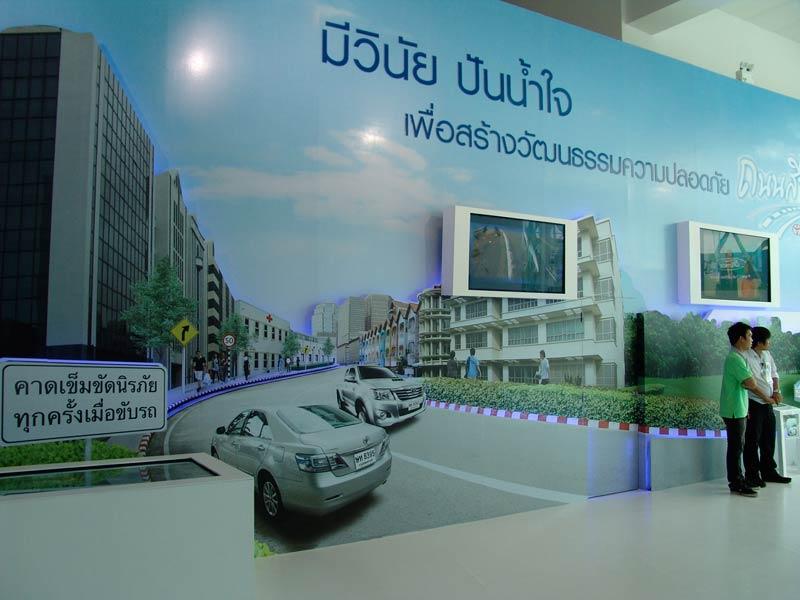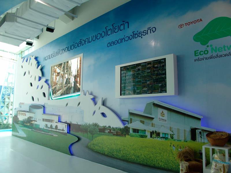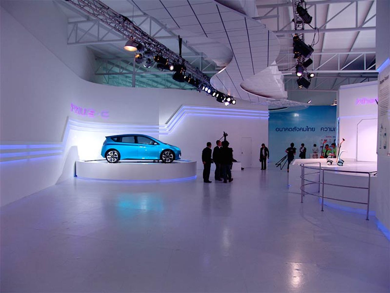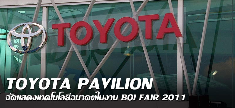 บริษัท Toyota Motor Thailand Co.ltd เข้าร่วมจัดแสดงในงาน BOI Fair เป็นครั้งที่ 3 โดยในครั้งนี้จัดแสดงบนพื้นที่ขนาด 2,000 ตารางเมตร ริมทะเลสาบเมืองทองธานี ระหว่างวันที่ 5 – 20 มกราคม 2555 ภายใต้แนวคิด “Toyota Leads The Way Towards Better Sustainable Mobility Society” เพื่อต้องการสื่อถึงการสร้างสมดุลระหว่างมนุษย์ เทคโนโลยี และสิ่งแวดล้อมอย่างกลมกลืน และก่อให้เกิดสังคมแห่งความยั่งยืน ที่ได้รับการออกแบบโดยคำนึงถึงการใช้พลังงานอย่างคุ้มค่า ควบคู่กับความล้ำสมัย เริ่มจากรูปลักษณ์ภายนอกของ Pavilion ที่ได้แรงบันดาลใจมาจากการผสมผสานระหว่างธรรมชาติและความทันสมัยเข้าไว้ด้วยกัน ให้ความรู้สึกที่กลมกลืนของเทคโนโลยีและสิ่งแวดล้อมที่อยู่เคียงคู่กัน สะท้อนถึงความทันสมัยควบคู่ไปกับการอนุรักษ์พลังงานด้วยผนังลายฉลุรอบอาคาร เพื่อปกป้องความร้อนจากแสงอาทิตย์ พร้อมกระจกม่านน้ำขนาดใหญ่ด้านหน้าอาคาร ที่มีคุณสมบัติทั้งสามารถช่วยลดปริมาณความร้อนและลดการใช้พลังงาน พร้อมพื้นที่เพื่อการพักผ่อนด้วยสวนสีเขียว เพิ่มความร่มรื่นท่ามกลางนวัตกรรมอันทันสมัยใน Toyota Pavilion ทั้งนี้ผู้เข้าร่วมชม Toyota Pavilion จะได้พบกับเรื่องราวจากปัจจุบันสู่อนาคต กับเทคโนโลยีของ Toyota โดยแบ่งออกเป็น 3 โซน คือ