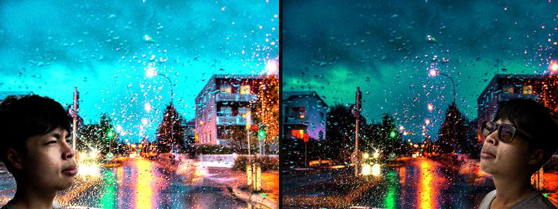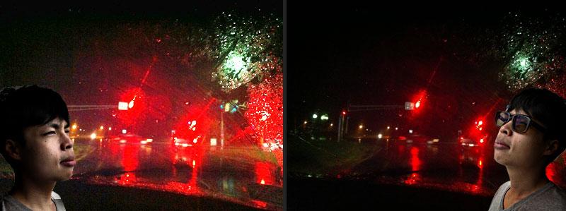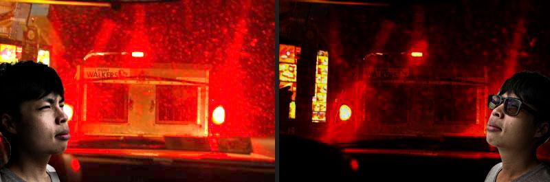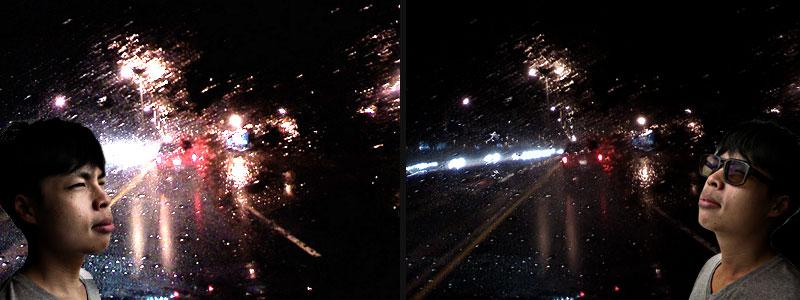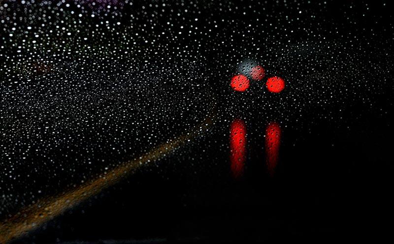 แสงไฟจากหน้ารถคันที่สวนมา กับไฟถนนที่ปรารถนาดีคอยส่องสว่าง แต่ในยามฝนตก แหล่งกำเนิดแสงเหล่านี้นั่นแหละตัวดี!! แสงที่เกิดจากต้นตอเหล่านั้นเมื่อสะท้อนกับหยดน้ำบนหน้ากระจกบวกกันลานน้ำพุที่กระโปรงหน้า ทำให้เกิดการหักเหของแสงและประกายแวววับแทบจะบดบังการมองให้หมดสิ้นไป