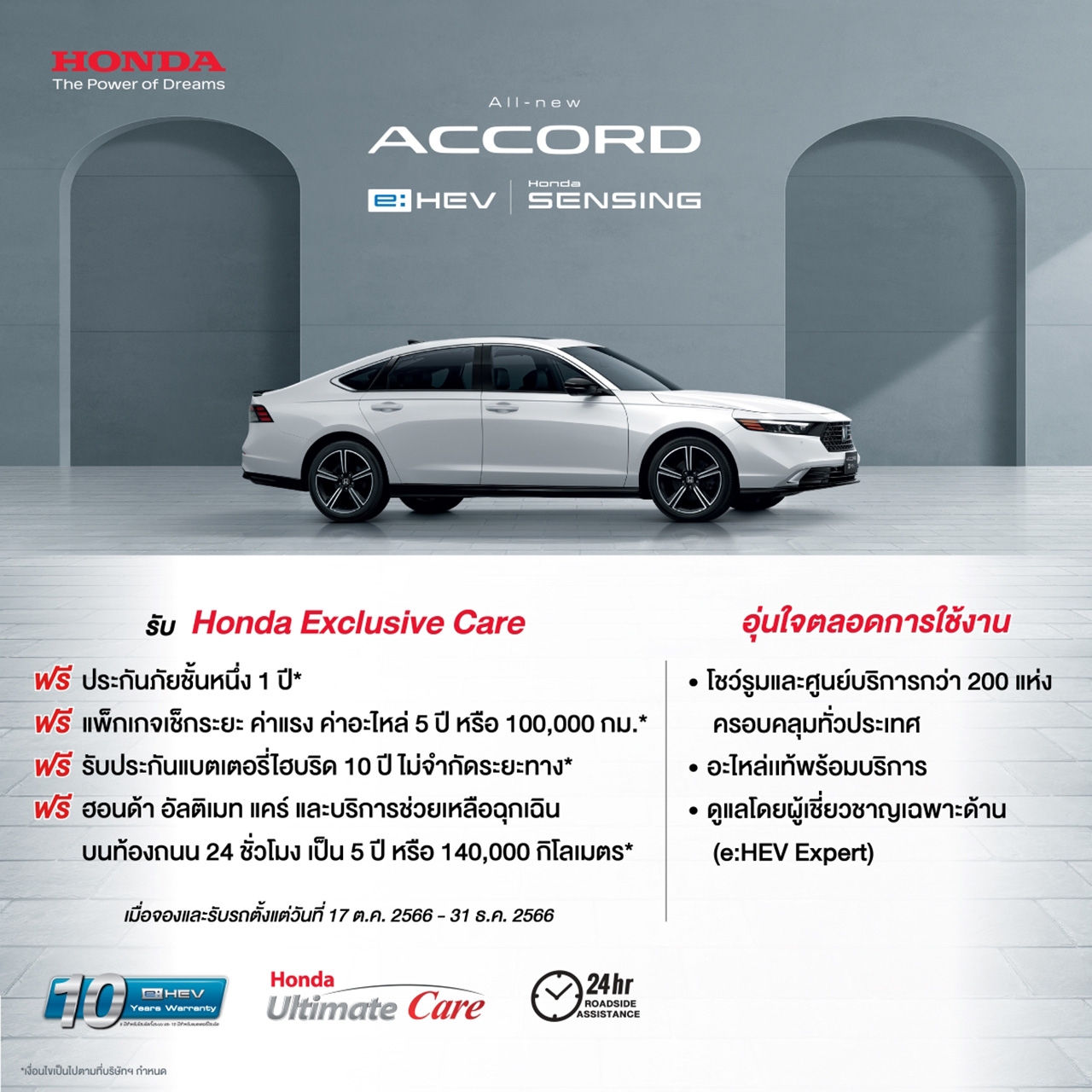 โปรโมชันพิเศษ! หากจอง ฮอนด้า แอคคอร์ด อี:เอชอีวี ใหม่ รับ Honda Exclusive Care