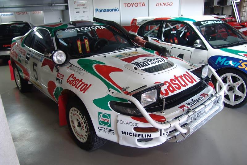 ข้างๆ กับเจ้าอสูรสีขาวมีรถแรลลี่ของค่ายสามห่วงจอดสงบนิ่งอยู่อีกเพียบ ปี 1992 แผนกมอเตอร์สปอร์ตของ Toyota ส่งถ่ายสายพันธ์ุแห่งความแรงบนทางฝุ่นด้วย Celica ST185 4WD รุ่นไฟ pop-up ตัวแข่งจอมโหดที่กวาดชัยชนะไปทั่วโลก รถ Celica ST185 4WD Turbo group A (1992) วางเครื่องยนต์แห่งตำนาน มันใช้เครื่องยนต์ 4 สูบ รหัส 3S-GTE สุดแรง พร้อมกลไกขับเคลื่อน 4 ล้อ เครื่องยนต์มีความจุรวม 1,998 ซีซี 16 วาวล์ 4 สูบเบนซิน กระบอกสูบคูณช่วงชักมีตัวเลขที่สมมาตร 86.0 mm x 86.0 mm อัดอากาศด้วยเทอร์โบ Toyota CT26 turbocharger ขนาดโข่ง 38 มิลลิเมตร ลดอุณหภูมิของอากาศก่อนประจุเข้าสู่ท่อร่วมไอดีด้วย Intercooler ระบบจ่ายเชื้อเพลิงรุ่นก้าวหน้า (ในยุค 90') ด้วยระบบอิเล็กทรอนิกส์ของ Bosch L-jetronic แบบ Multi-point ให้กำลังสุงสุด 300 แรงม้า กับแรงบิดระดับทะลุมิติที่ 46.7 กิโลกรัมเมตร บนน้ำหนักตัว 1.1 ตัน ช่วงล่างด้านหน้าและด้านหลังใช้รูปแบบ Macpherson "super" strut กับ lower control arm พร้อม coil springs แบบ telescopic ส่วนโช้คอัพเป็นแบบ gas shock absorbers และ anti-roll bar นับเป็นรถแข่งอีกรุ่นที่สร้างประวัติศาสตร์ไว้อย่างมากมายจากประสิทธิภาพอันยอดเยี่ยมของมัน นักขับชื่อดังที่เคยควบรถรุ่นนี้เข้าเส้นชัยในอันดับที่หนึ่งมีทั้ง Carlos Sainz / Markku Alén / Armin Schwarz / Mikael Ericsson / Marcus Grönholm ซึ่งเป็นมือขับระดับพระกาฬในวงการแข่งรถแทบทั้งสิ้น