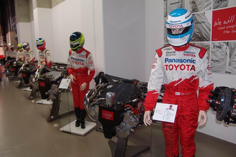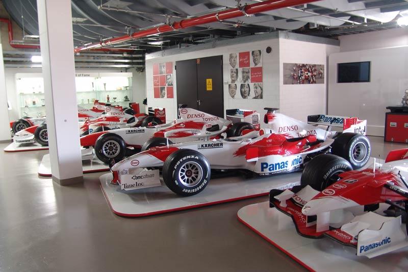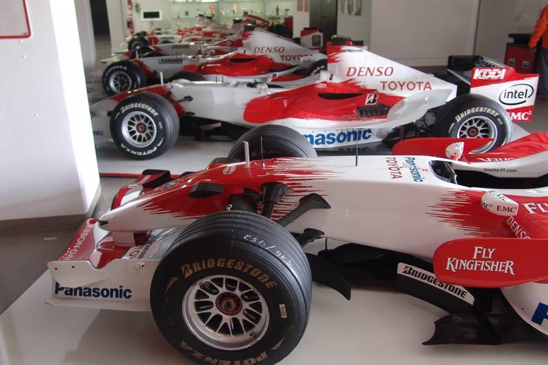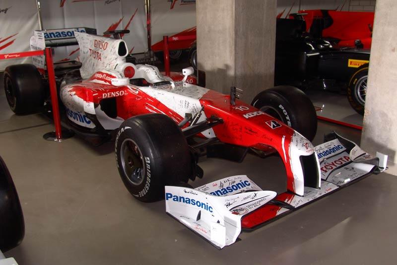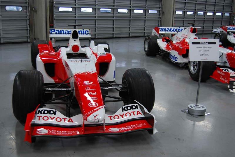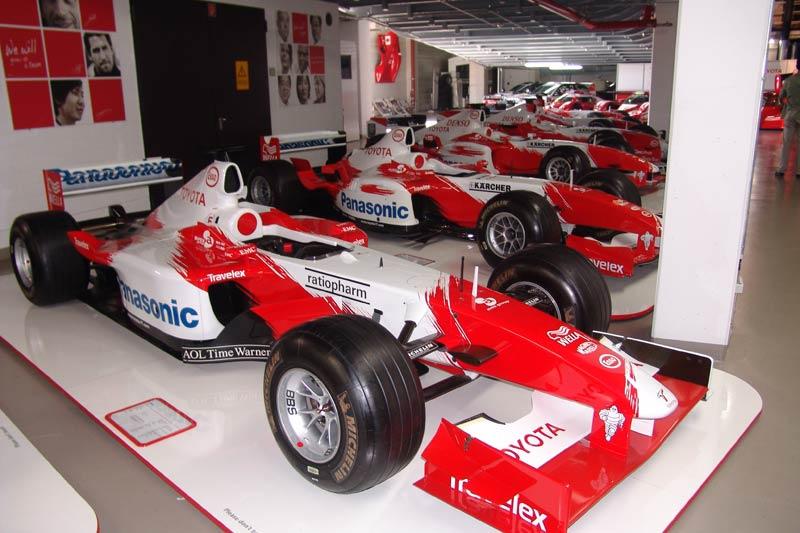โรงเก็บรถแข่งหรือพิพิธภัณฑ์ของ TMG คือสถานที่เก็บประวัติศาสตร์ซึ่งมีทั้งยุครุ่งเรืองและขมขื่น มุมด้านขวาของห้องจัดแสดงเต็มไปด้วยเรื่องราวอันน่าติดตามของรถแข่ง F1 ในตระกูล TF จอดเรียงรายนับสิบคัน ไล่เรียงมาตั้งแต่รถ TF 102 ไปจนถึง TF 109 ตู้ตั้งแสดงถ้วยรางวัลชนะเลิศในรายการต่างๆ เครื่องยนต์ แผงวงจรระบบไฟฟ้าของรถแข่ง ย้อนกลับไปในช่วงทศวรรษที่ผ่านมา Toyota Motor Sport GmbH ทำการเปิดตัวทีมแข่งรถสูตรหนึ่งในปี 2002 นักขับคู่แรกคือ Allan McNish และ Mika Salo กับรถแข่ง TF102 ซึ่งออกแบบโดย Gustav Brunner ฤดูกาลแรกของการเข้าร่วมแข่งขัน Formula 1 ไม่ประสบความสำเร็จเท่าที่ควร อุบัติเหตุบนสนามแข่งกับความบกพร่องของรถแข่ง Toyota F1 ในช่วงปีแรกนั้น นำมาซึ่งความผิดหวังให้กับผู้บริหารที่ต้องควักเงินจำนวนมหาศาลสำหรับการพัฒนารถแข่ง สำหรับฤดูกาล 2003 Toyota F1 Team เปลี่ยนตัวนักขับมาเป็น Cristiano da Matta และ Olivier Panis ซึ่งทำได้ดีที่สุดเพียงอันดับ 5 ที่เยอรมนี โดยมีคะแนนสะสมทั้งฤดูกาลอยู่ในอันดับที่ 8 ปี 2004 เริ่มต้นฤดูกาลไม่ค่อยดีนักกับรถแข่ง Toyota Williams F1 ในช่วงปลายฤดูกาลแข่งของปี 2004 รถ Williams F1 ของ Toyota โดนคณะกรรมการจัดการแข่งขันตรวจสอบแล้วพบว่าผิดกฎข้อบังคับของ FIA ทำให้ถูกตัดสิทธิ์ออกจากการแข่งขันที่ Canadian Grand Prix ตามมาด้วยการลาออกของนักขับฝีมือดี Cristiano da Matta โดย Toyota Williams F1 ได้ตัว Ricardo Zonta เข้ามารับหน้าที่แทนรวมถึง Jarno Trulli นักขับชาวอิตาเลียน
