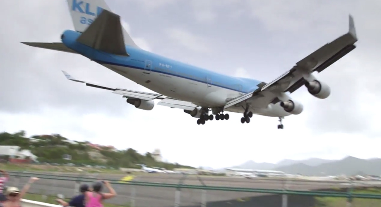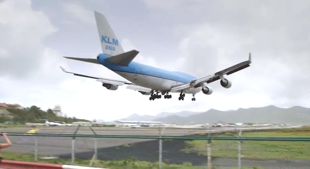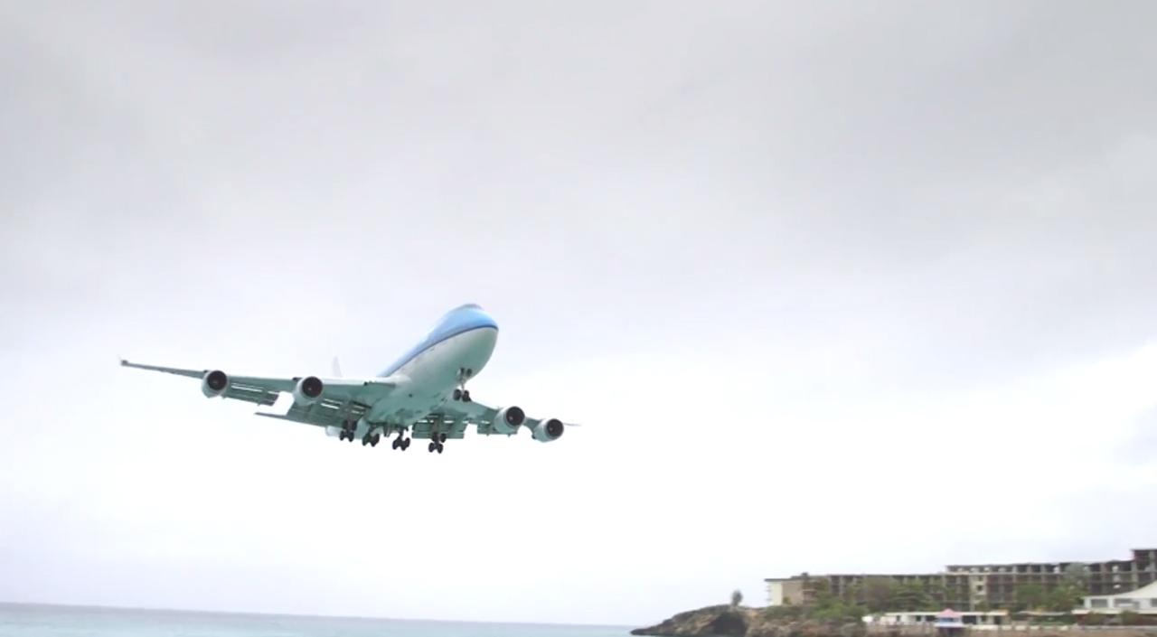 ในคราวนี้สายการบินแห่งชาติของเนเธอร์แลนด์ หรือ เคแอลเอ็ม (KLM) ได้ทำวิดีโอคลิปสารคดีเรื่องราวในค็อคพิทนักบิน เมื่อต้องนำเครื่องบินจัมโบเจ็ต โบอิ้ง 747-400 ลำโตลงจอดบนรันเวย์ที่ยาวประมาณ 2.3 กิโลเมตร ในเที่ยวบินจากสนามบิน สคิปโฮล กรุงอัมสเตอร์ดัม-สนามบินปริ๊นเซส จูเลียนา เกาะเซนต์มาเท่น ของหมู่เกาะแคริบเบียน ที่มีหาดมาโฮที่สวยงามอยู่ด้านหน้า และเป็นจุดที่ใช้สังเกตและดูเครื่องบินได้แบบใกล้ชิดมากที่สุดในโลก เรียกได้ว่าล้อเครื่องบินเฉียดหัวกันเลยทีเดียว