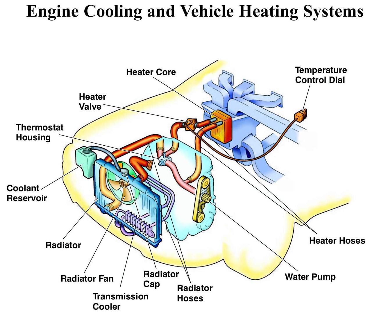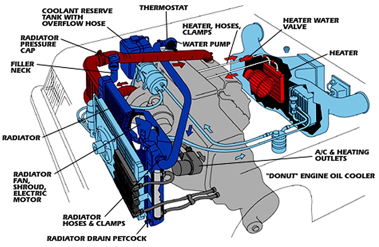 ระบบระบายความร้อนของรถยนต์ประกอบด้วย ปั๊มน้ำ (Water pump) วาล์วน้ำ (Thermostat) ท่อยางหม้อน้ำ (Radiator hoses), หม้อน้ำ (Radiator) พัดลมระบายความร้อน (Fan) ทำงานร่วมกันนับตั้งแต่เริ่มสตาร์ตเครื่องยนต์ ตัวปั๊มน้ำก็จะทำงานโดยได้รับแรงหมุนจากสายพาน ซึ่งต่อมาจากการหมุนพูเล่ย์ ของแกนเพลาข้อเหวี่ยง การที่ปั๊มน้ำทำงาน เป็นผลทำให้มีน้ำไหลเวียนอยู่ในโพรงผนังของเสื้อสูบ และบริเวณที่มีความร้อน