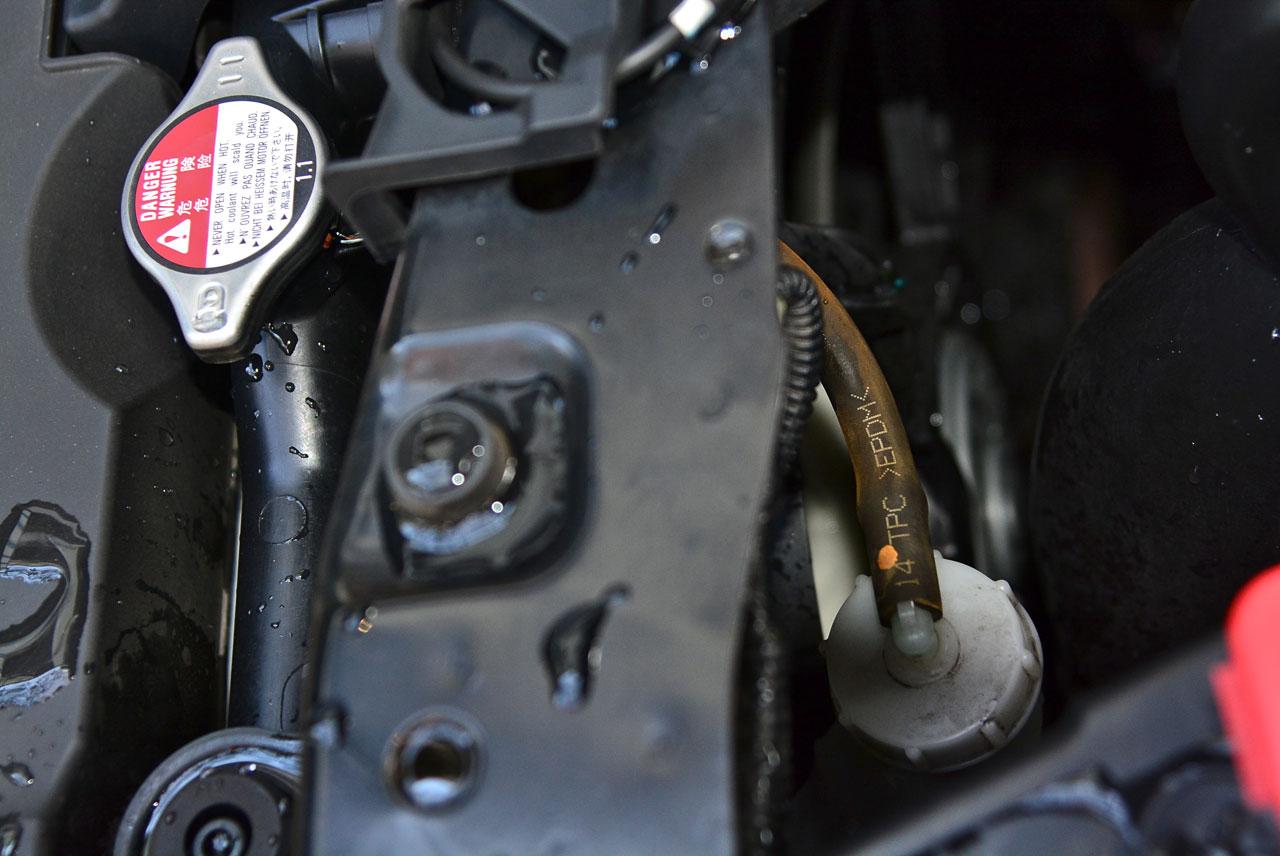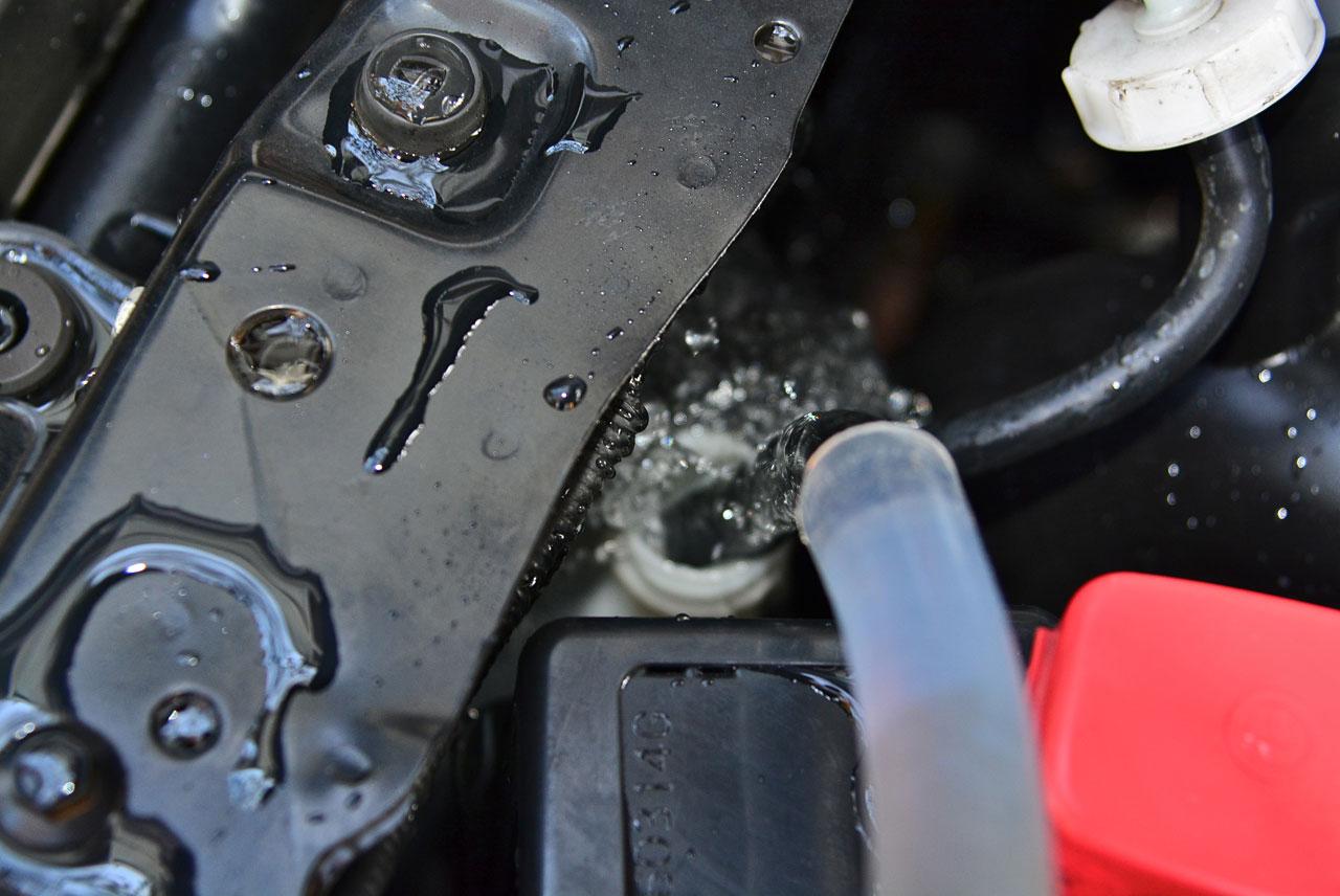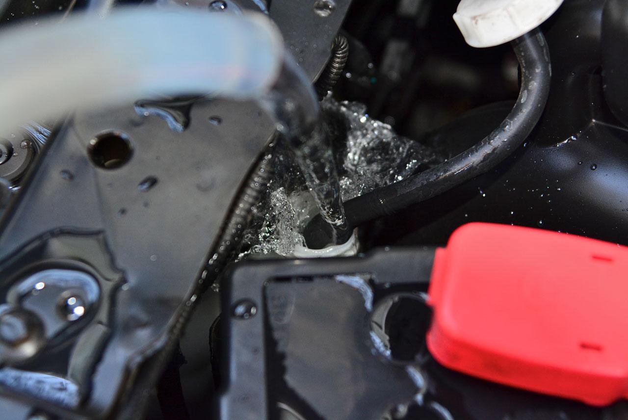 2- เติมแต่น้ำสะอาดลงไปในหม้อน้ำเท่านั้น เพื่อป้องกันไม่ให้หม้อน้ำหรือทางเดินของหลอดรังผึ้งหม้อน้ำเกิดการอุดตัน ถ้าเป็นไปได้ น้ำที่ใช้ดื่มหรือน้ำประปา ตรวจดูรอยรั่วตามที่จุดต่างๆ อย่างเช่น ท่อยางหม้อน้ำ ครีบรังผึ้ง ปั๊มน้ำ ฯลฯ หากพบรอยรั่วซึม ควรทำการซ่อม หรือเข้าศูนย์บริการฯ ครีบรังผึ้งของหม้อน้ำไม่ควรมีอะไรไปกระแทกจนพับงอทำให้ปิดช่องทางผ่านของลม ไม่ควรให้แผงรังผึ้งของหม้อน้ำเลอะดินโคลนคราบน้ำมัน เนื่องจากจะทำให้ระบายความร้อนได้ไม่ดี แวะร้านยางพอเติมลมเสร็จอาจขอให้เอาลมเป่ารังผึ้งหม้อน้ำ เพื่อทำความสะอาดขจัดฝุ่นผงที่อุดตัน
