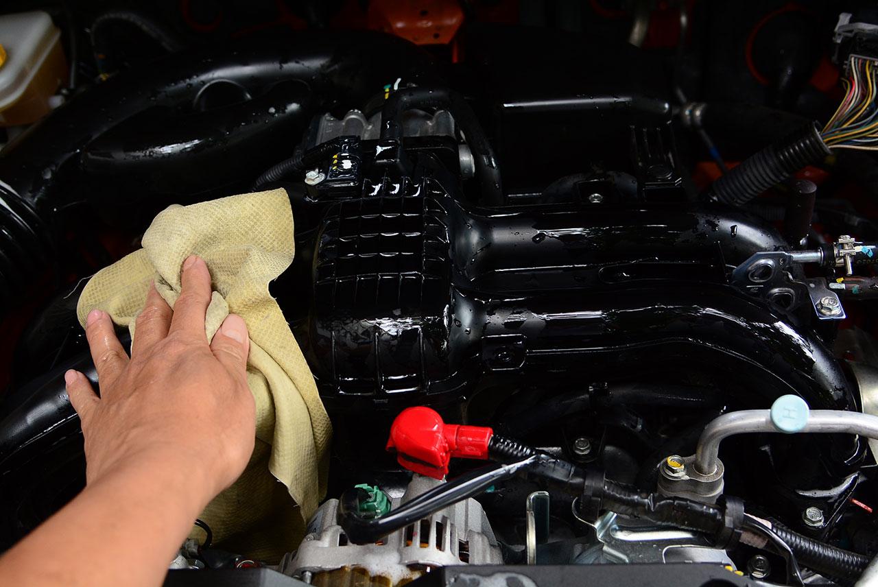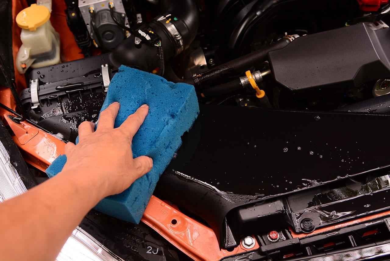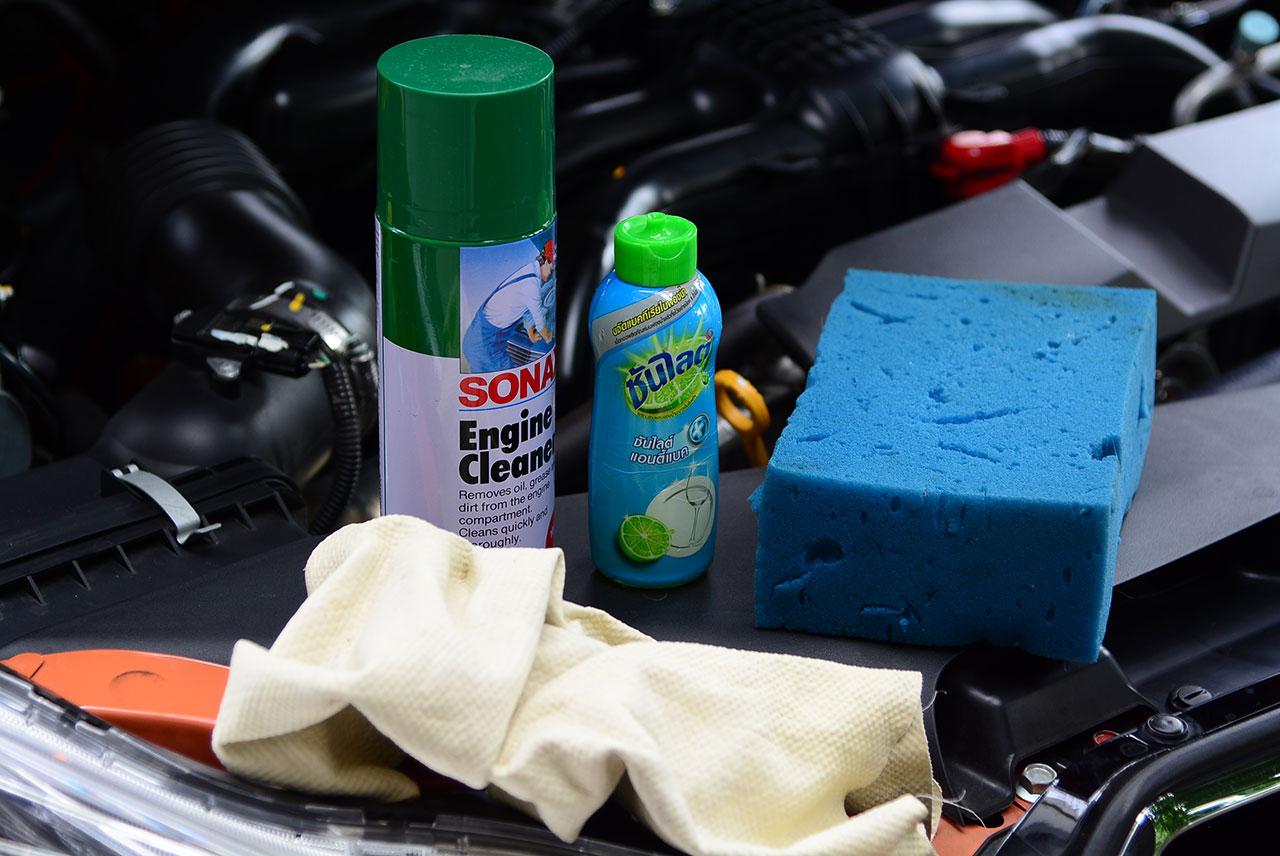 ห้องเครื่องยนต์คือจุดที่ได้รับการทำความสะอาดน้อยกว่าบริเวณผิวตัวถังเนื่องจากอยู่ใต้ฝากระโปรง เมื่อใช้งานไปได้สักระยะจะมีคราบสกปรก ฝุ่นลูกรังจากการขับลุยทางวิบาก คราบน้ำมันเครื่องที่เกาะติดกับเครื่องยนต์ตามขอบประเกน การทำความสะอาดห้องเครื่องยนต์บ่อยครั้งถือเป็นการตรวจเช็กชิ้นส่วนและอุปกรณ์ต่างๆ ไปในตัว การล้างทำความสะอาดเครื่องยนต์และชิ้นส่วนต่างๆ จึงมีความสัมพันธ์ที่เชื่อมโยงกับการใช้งานที่ถูกต้อง อุปกรณ์ในการล้างทำความสะอาดห้องเครื่องยนต์ก็ไม่มีอะไรมาก แค่ฟองน้ำล้างรถ ผ้าเช็ดรถกับน้ำยาล้างจานและสเปย์ทำความสะอาดเครื่องยนต์สำหรับห้องเครื่องที่ห่างเหินจากการดูแลมานานแสนนานซึ่งมีคราบน้ำมันเหนียวๆ ดำๆ เกาะติดอยู่เต็มไปหมด