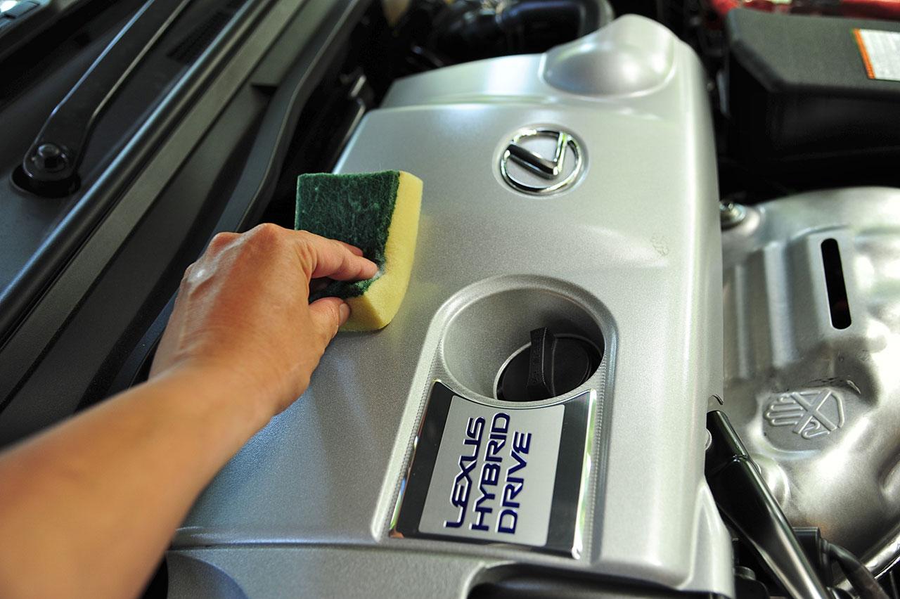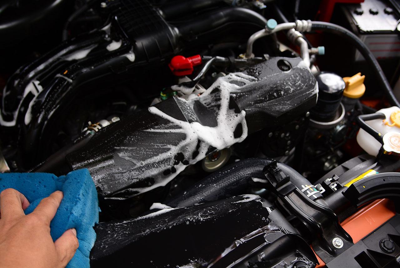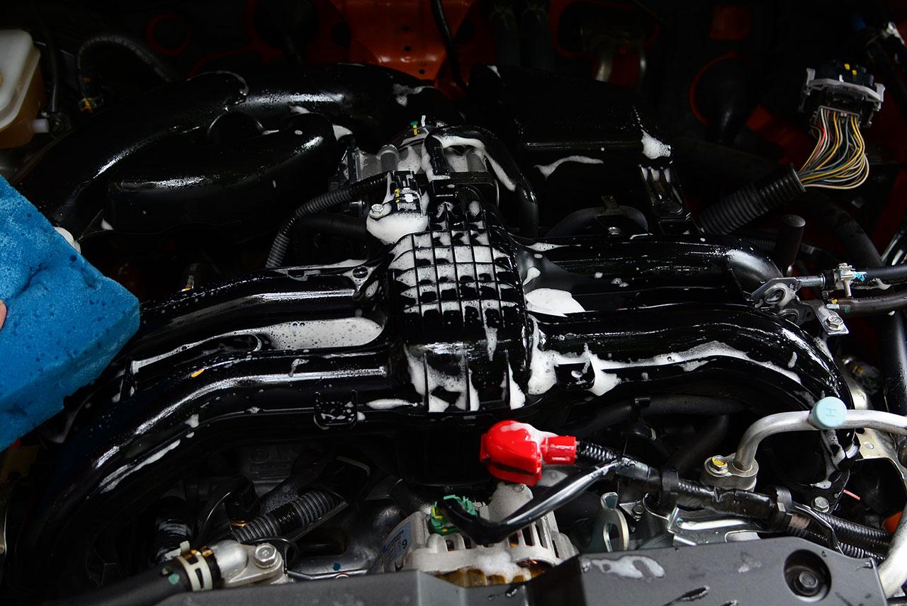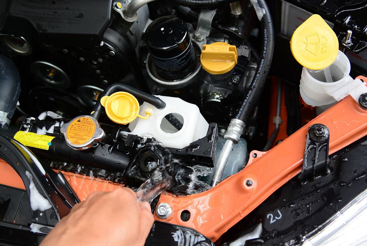 ห้องเครื่องยนต์คือจุดที่ได้รับการทำความสะอาดน้อยกว่าบริเวณผิวตัวถังเนื่องจากอยู่ใต้ฝากระโปรง เมื่อใช้งานไปได้สักระยะจะมีคราบสกปรก ฝุ่นลูกรังจากการขับลุยทางวิบาก คราบน้ำมันเครื่องที่เกาะติดกับเครื่องยนต์ตามขอบประเกน การทำความสะอาดห้องเครื่องยนต์บ่อยครั้งถือเป็นการตรวจเช็กชิ้นส่วนและอุปกรณ์ต่างๆ ไปในตัว การล้างทำความสะอาดเครื่องยนต์และชิ้นส่วนต่างๆ จึงมีความสัมพันธ์ที่เชื่อมโยงกับการใช้งานที่ถูกต้อง อุปกรณ์ในการล้างทำความสะอาดห้องเครื่องยนต์ก็ไม่มีอะไรมาก แค่ฟองน้ำล้างรถ ผ้าเช็ดรถกับน้ำยาล้างจานและสเปย์ทำความสะอาดเครื่องยนต์สำหรับห้องเครื่องที่ห่างเหินจากการดูแลมานานแสนนานซึ่งมีคราบน้ำมันเหนียวๆ ดำๆ เกาะติดอยู่เต็มไปหมด