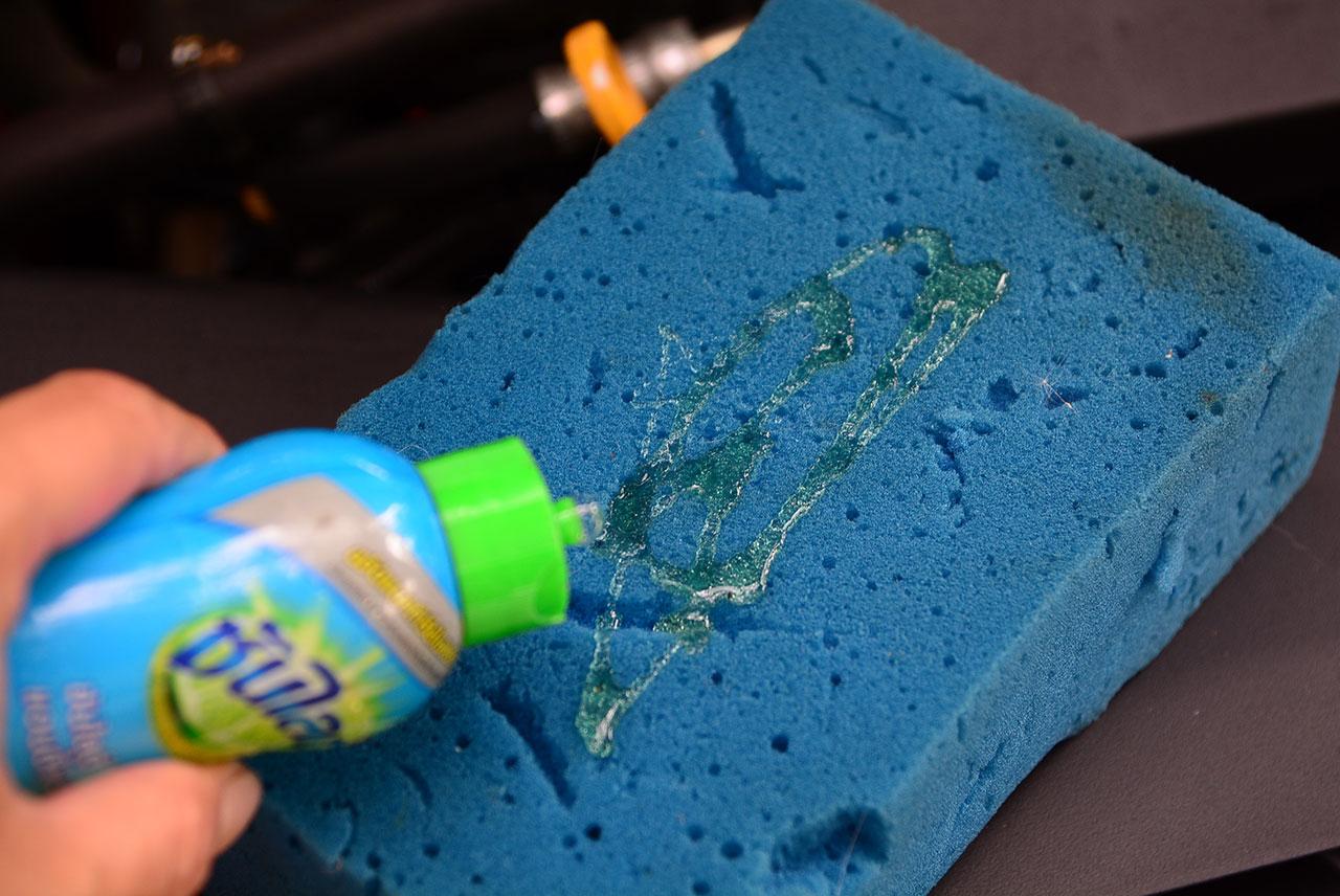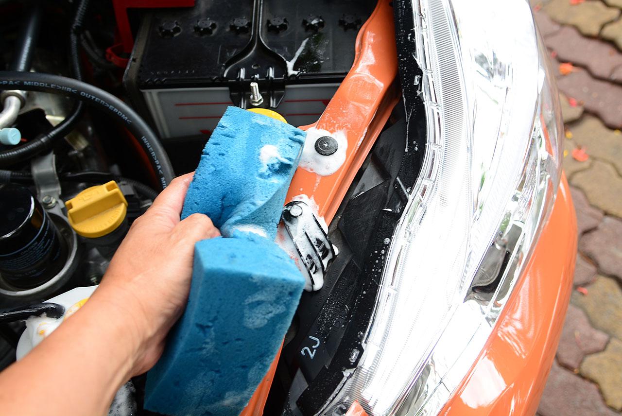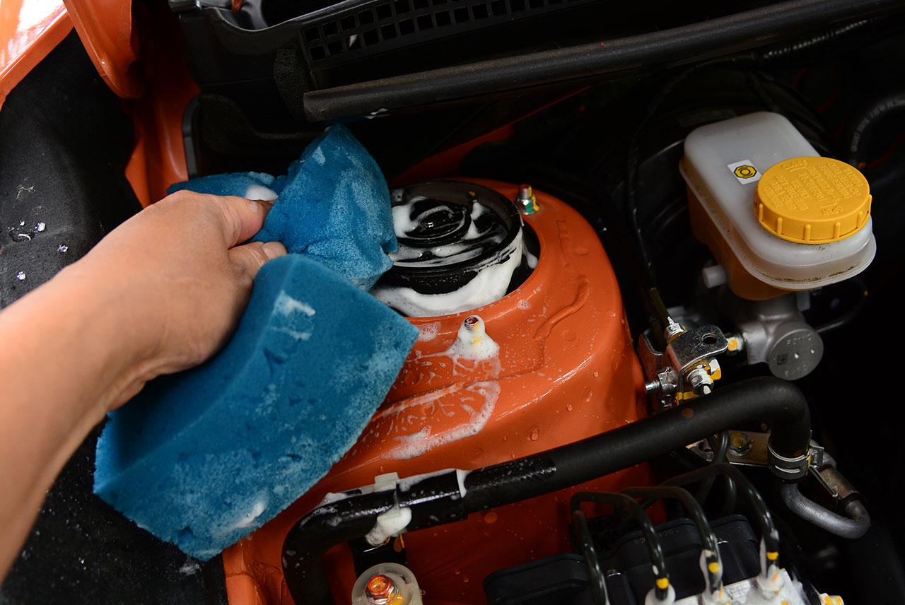 เบ้าโช้คอัพก็ชอบมีฝุ่นเกาะรวมถึงแถบช่องน้ำบริเวณแก้มข้างที่มักอุดมไปด้วยฝุ่นและเศษใบไม้ ใช้ฟองน้ำชุบซันไลน์ให้มากหน่อยค่อยๆ ชโลมลูบให้ทั่ว เบ้าโช้คอัพไม่มีจุดเชื่อมต่อกับสายไฟก็สามารถเอาสายยางมาราดน้ำทำความสะอาดตามได้เลยแต่ระวังอย่าให้น้ำไปโดนกล่องฟิวส์หรือไดชาร์จเป็นใช้ได้