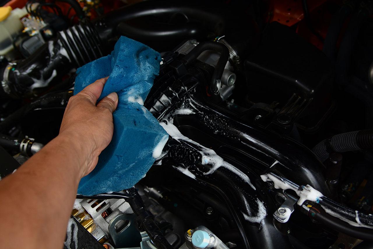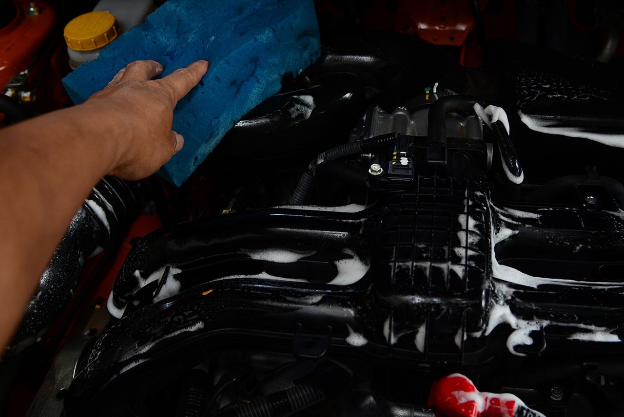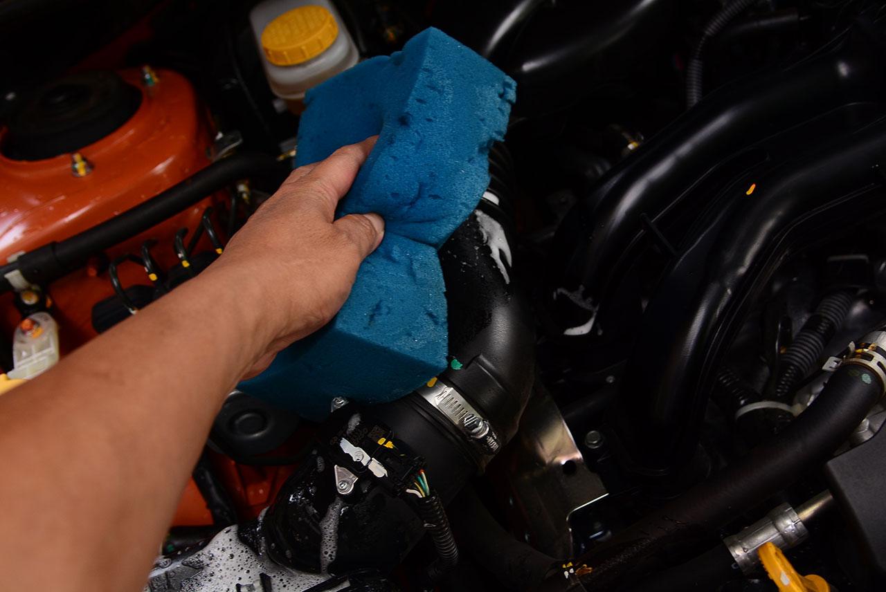 ท่อไอดีพลาสติกสีดำชอบมีทั้งคราบน้ำมันและคราบฝุ่นเกาะกันแน่นตึบ ลูบด้วยฟองน้ำหมาดๆ ไม่ควรให้น้ำชุ่มฟองน้ำมากจนเกินไป ค่อยๆ เช็ดไปเรื่อยๆ อย่าใจร้อน สำหรับรถที่ไม่เคยเจอน้ำจะมีห้องเครื่องที่เน่ามากเป็นพิเศษ ใช้เวลาเช็ดมากหน่อยดีกว่าปล่อยเอาไว้แบบนั้น