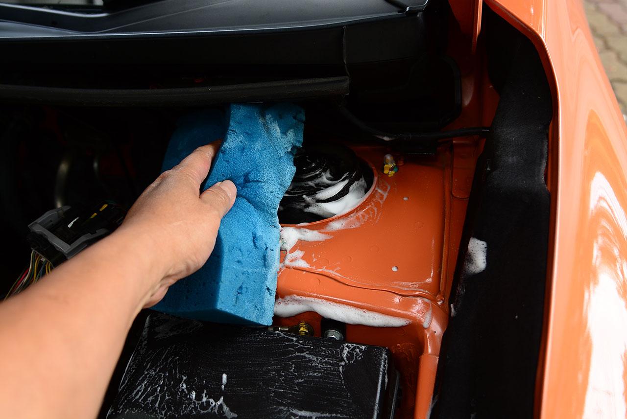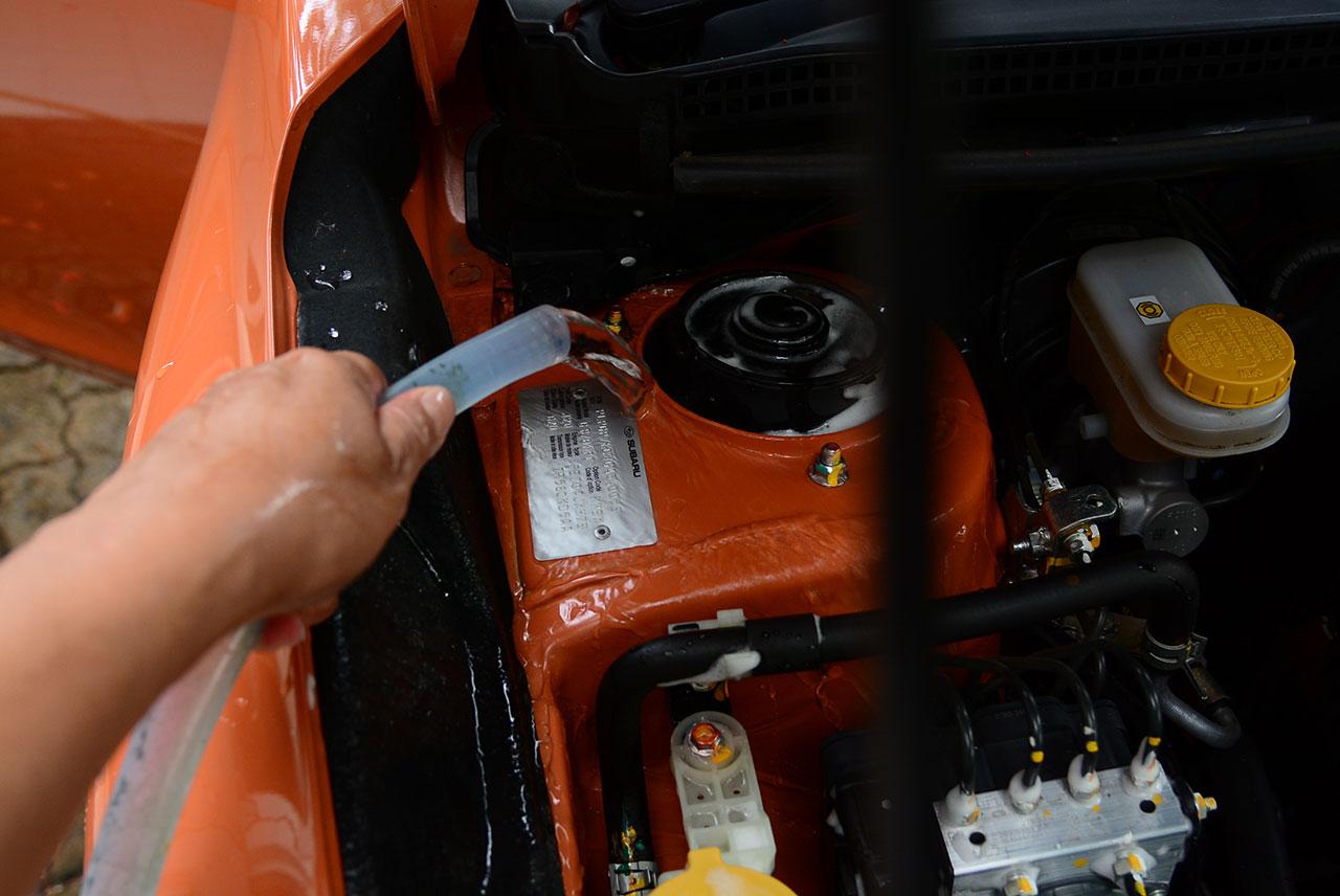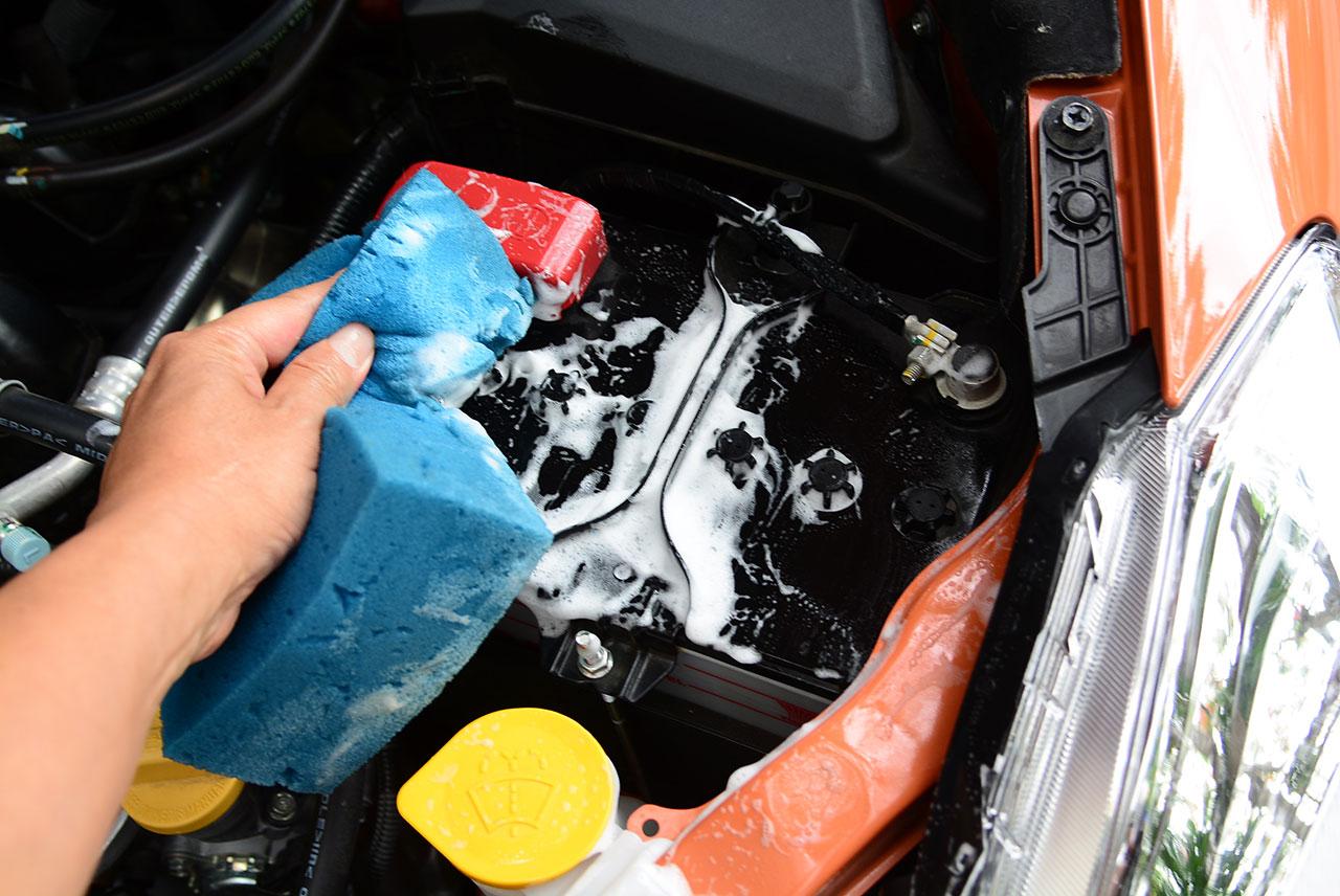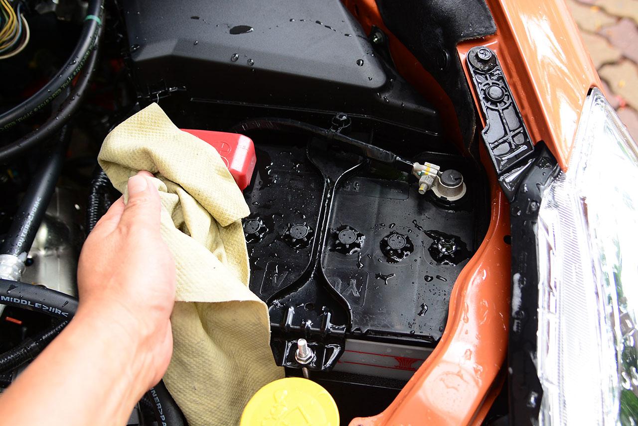 ตำแหน่งที่ต้องทำความสะอาดอีกอย่างก็คือกล่องที่ใส่แบตเตอรี่ซึ่งมีฝุ่นผงจำนวนไม่น้อย ใช้ฟองน้ำชุบน้ำยาล้างจานลูบไล้ไปเรื่อยๆ จนกว่าจะหมดฝุ่น ไม่ควรเอาสายยางมาราดน้ำลงไปตรงๆ แค่เช็ดให้มากหน่อยแบตเตอรี่ก็จะกลับมาเอี่ยมเหมือนเดิม ไหนๆ ก็เปิดฝากระโปรงแล้วถือโอกาสเช็กน้ำกลั่นแบตเตอรี่ไปด้วยเลย เห็นว่าน้ำกลั่นพร่องจากระดับที่กำหนดก็หามาเติมซะให้เรียบร้อยป้องกันน้ำกลั่นแห้งจนประจุไฟหมดแบตฯ