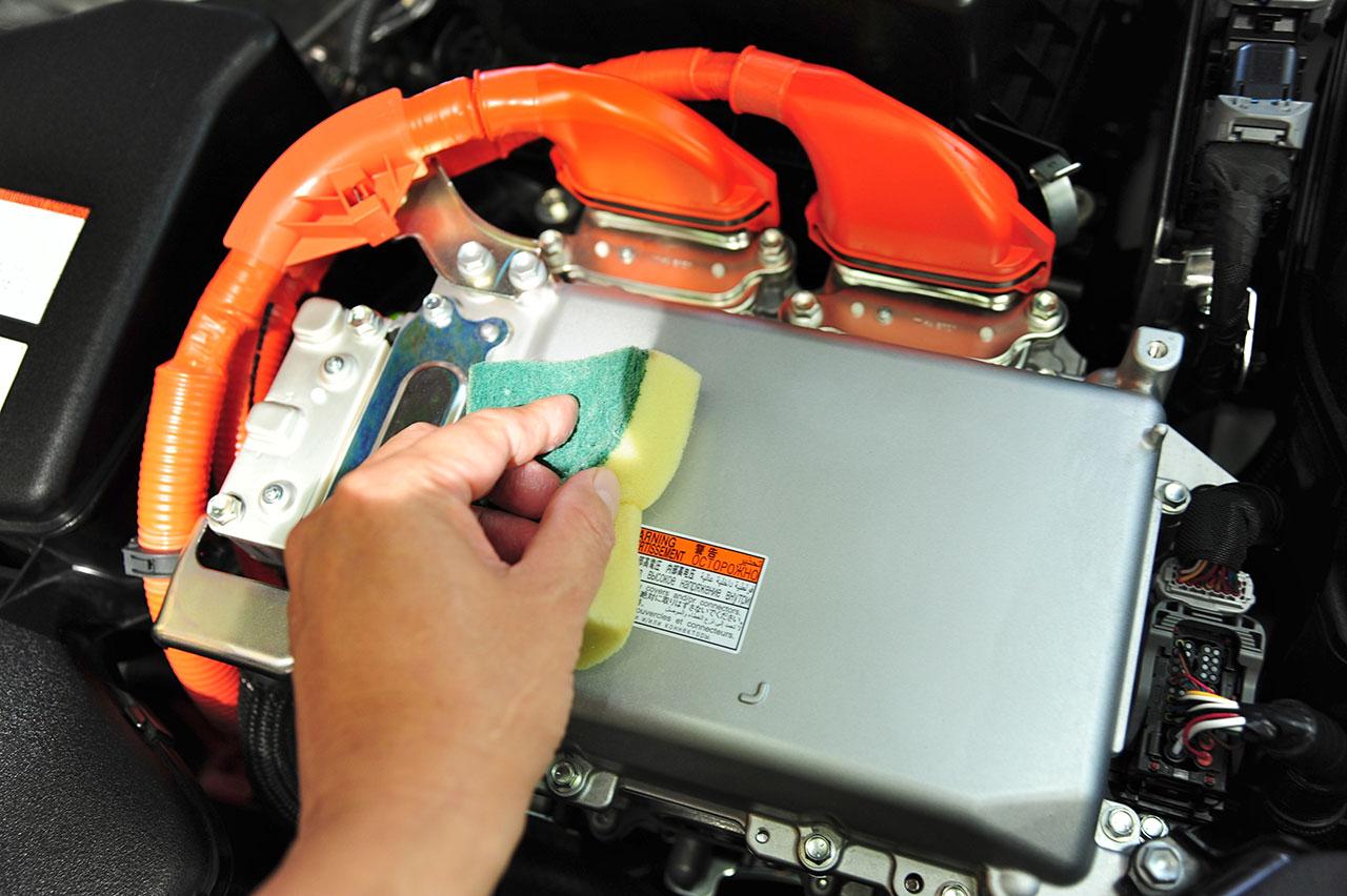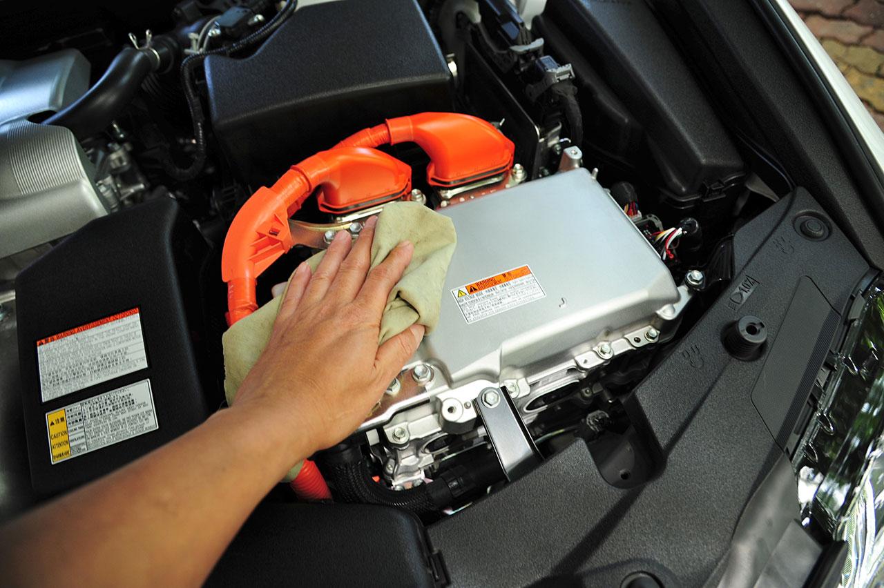 ท่านที่ใช้รถ Hybrid ซึ่งมีการเสริมกำลังทั้งเครื่องยนต์และมอเตอร์ไฟฟ้าตลอดจนเจนเนอร์เรเตอร์และตัวแปลงกระแสไฟ ห้ามเอาน้ำราดอย่างเด็ดขาดเนื่องจากเครื่องยนต์ Hybrid อุดมไปด้วยจุดต่อเชื่อมของระบบไฟฟ้าที่ไม่ถูกกับความชื้น ใช้ผ้าชุบน้ำหรือฟองน้ำชุบน้ำหมาดๆ เช็ดจนสะอาดเท่านั้น ระบบ Hybrid นั้นมีมอเตอร์ไฟฟ้าที่อยู่ภายในเกียร์ รวมถึงเจนเนอเรเตอร์ที่ใช้สตาร์ตหรือดับเครื่องยนต์ชั่วขณะพร้อมระบบการชาร์จไฟให้กับแบตเตอรี่ที่อยู่ด้านหลัง กับอุปกรณ์จ่ายไฟที่จำเป็นสำหรับระบบ Hybrid และอุปกรณ์แยกกำลังหรือ Power Split Device ทำหน้าที่ผสานกำลังของเครื่องยนต์ มอเตอร์ไฟฟ้า และเครื่องกำเนิดไฟฟ้าที่ไม่ถูกโรคกับน้ำเป็นอย่างยิ่ง ห้ามใช้น้ำราดเด็ดขาดแค่เช็ดแห้งเท่านั้น