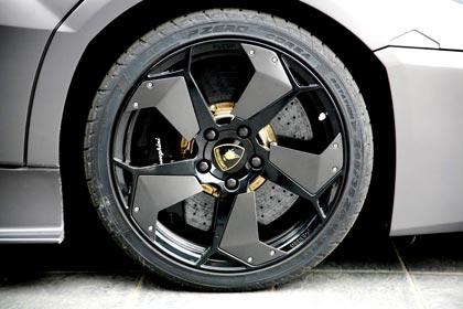 ล้อแม็กลายโหดของ Reventon มีลวดลายคล้ายกับกงจักรที่กำลังหมุน ซึ่ง Lamborghini ออกแบบได้อย่างสวยงามเข้ากับสีของรถได้ดี ก้านและขอบสีดำห่อหุ้มก้านทั้งห้าด้วยแผ่นคาร์บอนไฟเบอร์ ใจกลางยึดด้วยน็อตทั้งห้าตำแหน่ง พร้อมด้วยยางสมรรถนะสูง ล้อคู่หน้าขนาด 18 นิ้ว ใช้ยางซิ่งจากอิตาลียี่ห้อ Pirelli P-Zero Corsa ขนาด 245/35/ZR18 ส่วนล้อคู่หลังก็มีขนาด 18 นิ้วเท่ากัน แต่รัดเอาไว้ด้วยยางไซค์ยักษ์ 335/30/Zr18 Pirelli P-Zero Corsa ยางมาตรฐานที่รองรับความเร็วทะลุย่าน 300 กิโลเมตรต่อชั่วโมงได้อย่างสบายๆ