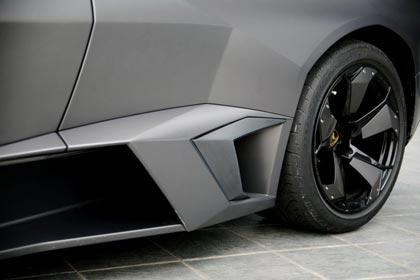 ตัวถังทั้งหมดของรถ Reventon ถูกขึ้นรูปด้วยคาร์บอนไฟเบอร์ทั้งหมด ยกเว้นเพียงส่วนที่ต้องการความแข็งแกร่งอย่างหลังคาและประตู ที่ยังคงใช้เหล็กกล้าเนื้อดี ด้านหน้ามีมุมมองที่คล้ายกับลูกธูน ตามลักษณะของการออกแบบให้ใช้กระแสลมจากสปอยเลอร์หน้า มาช่วยสร้างทั้งแรงกด และการระบายความร้อน โพรงขนาดใหญ่บริเวณสองข้างที่อยู่ใกล้กับมุมด้านข้างของสปอยเลอร์หน้า ทำหน้าที่เหนี่ยวนำเอาอากาศไปเป่าระบายให้กับจานดิสเบรค์แบบ 6 สไลส์ลูกสูบ โทนสีของตัวรถทั้งคัน เป็นสีเทา-ดำ ที่มีเนื้อสีแบบด้าน และกลายเป็นต้นตำรับของการใช้สติกเกอร์สีดำด้านที่กำลังฮิตมากๆ ในขณะนี้