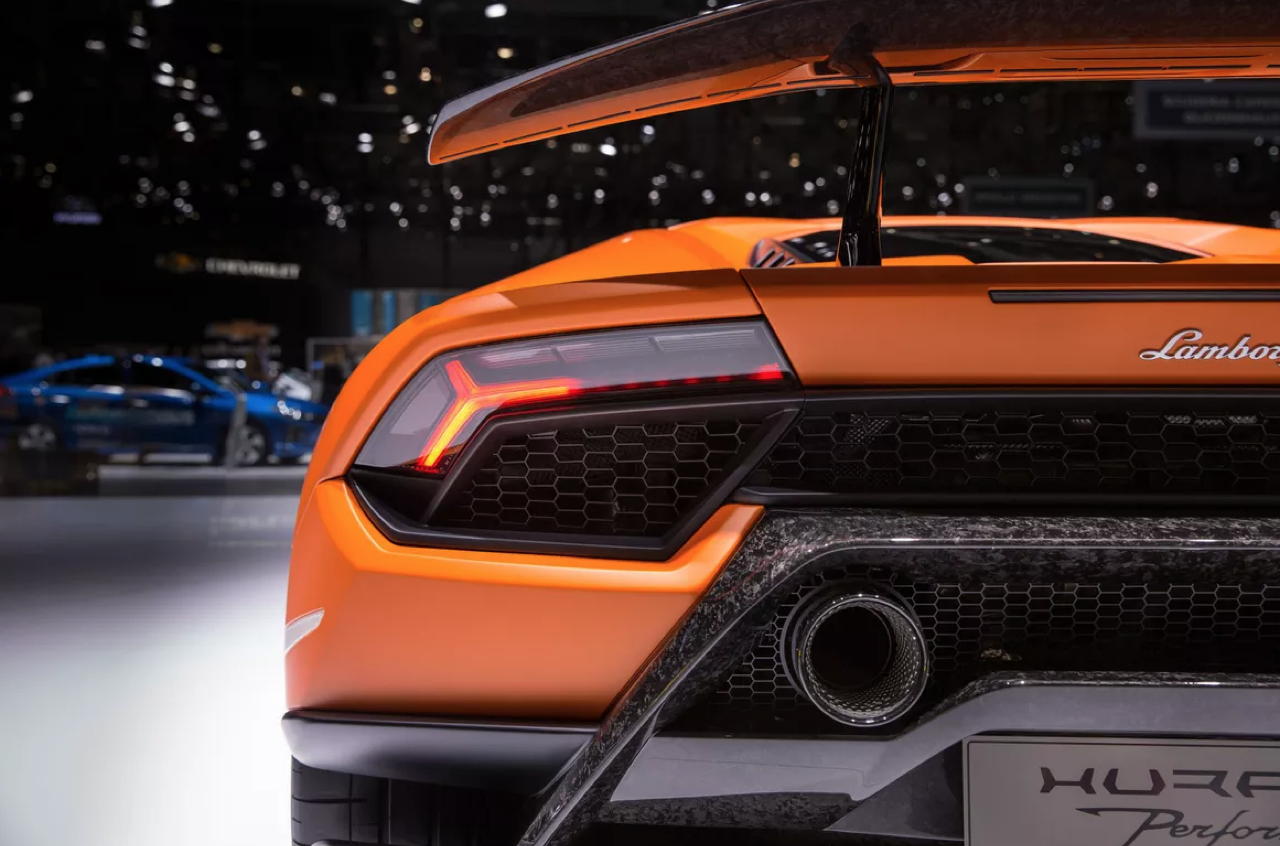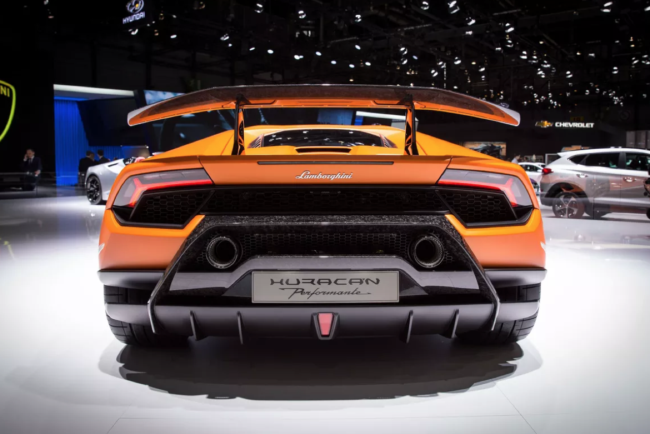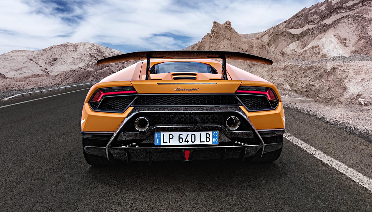 ท่อไอเสียแบบยกสูงของ Huracan Performante ช่วยเสริมลุคแบบสปอร์ตที่มอบความปราดเปรียวเช่นเดียวกับมอเตอร์ไซค์สปอร์ตที่พุ่งทะยานในสนามแข่ง ทั้งยังมีความสอดคล้องกับการวางตำแหน่งเครื่องยนต์ได้เป็นอย่างดี ดิฟฟิวเซอร์หลังเป็นผิวสีดำด้าน ซึ่งได้รับแรงบันดาลใจจากรถแข่ง Lamborghini Super Trofeo ทั้งในด้านรูปลักษณ์และการทำงาน แนวเส้นรูปสี่เหลี่ยมคางหมูจากด้านล่างของดิฟฟิวเซอร์ ซึ่งเป็นวัสดุหล่อคอมโพสิต ช่วยให้ส่วนท้ายของรถดูขยายใหญ่ ซึ่งมีประโยชน์ทั้งในเชิงเทคนิคยานยนต์และมอบรูปทรงแนวสปอร์ตที่เด่นสะดุดตา