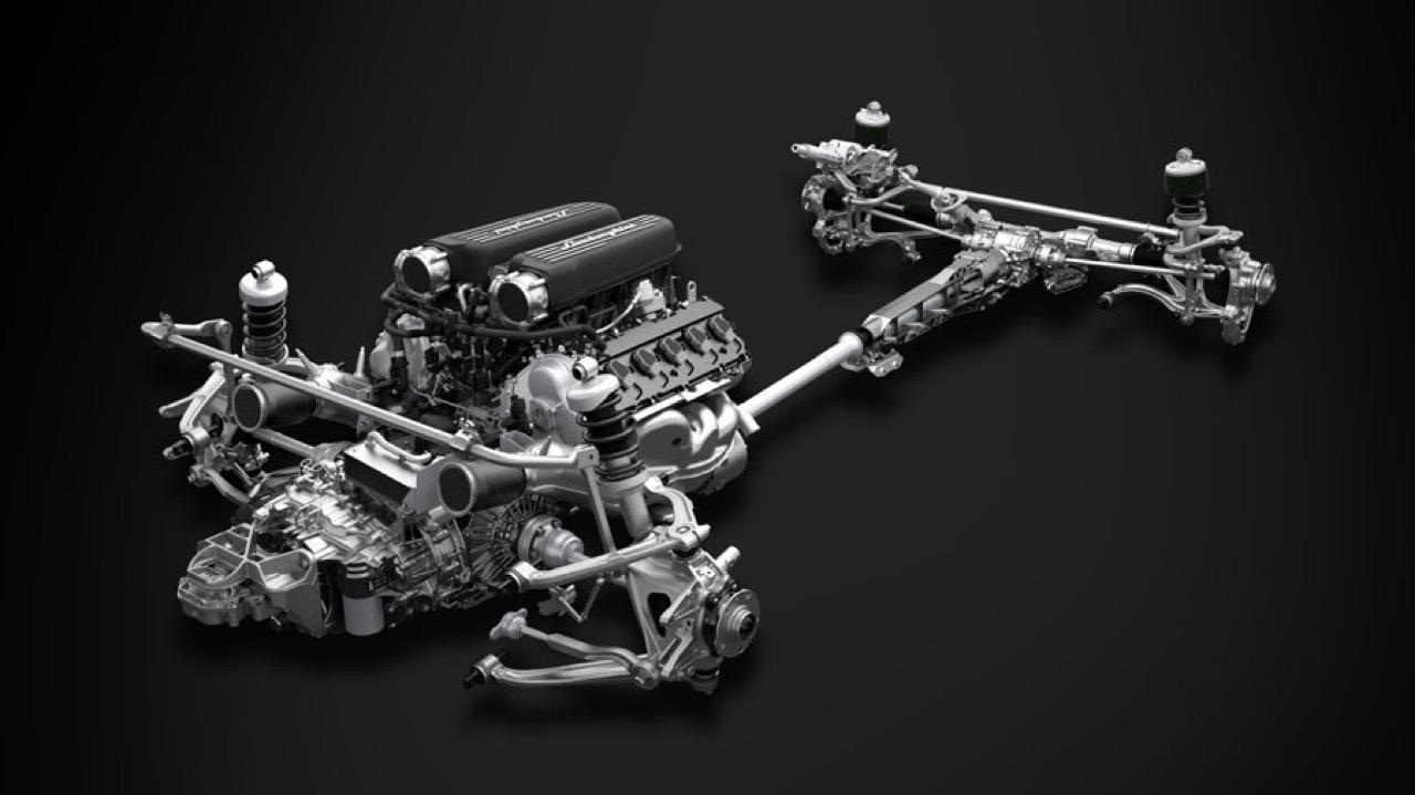 ระบบท่อไอเสียถูกออกแบบใหม่เพื่อลดภาระน้ำหนักและลดแรงกดที่ส่วนท้ายของรถยนต์ โดยท่อไอเสียทั้งหมดถูกวางตำแหน่งให้สูงขึ้นและอยู่ตรงกลางตัวรถมากขึ้น เพื่อมอบเสียงที่กระหึ่มยิ่งกว่าเมื่อขับเคลื่อนด้วยความเร็วสูงเพื่อให้ก้องกังวานไปทั่วสนามแข่ง เครื่องยนต์อันทรงพลังเพิ่มแรงบิดให้สูงสุดมากกว่าเดิม 70% ของแรงบิดที่ 1,000 รอบ/นาที ติดตั้งมาพร้อมกับระบบส่งกำลังคลัทช์คู่แบบ 7 สปีดของ Lamborghini เพื่อให้เหมาะสมกับยานยนต์สมรรถนะสูง