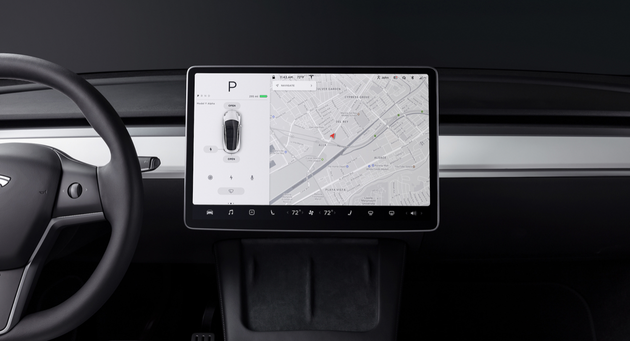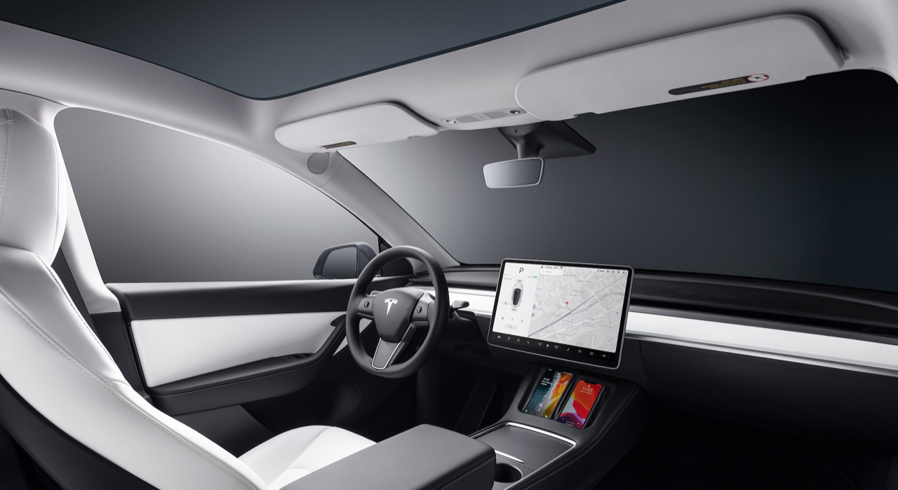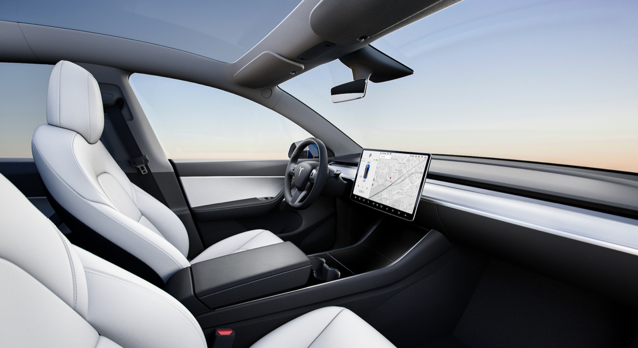 Model Y มีห้องโดยสารกว้างขวางพอที่จะบรรทุกผู้ใหญ่ 5 คนและเด็กอีกสองคน พร้อมอุปกรณ์พวกกระเป๋าเดินทาง เป็น SUV ไฟฟ้าที่มีหลังคากระจกแบบพาโนรามิก ในขณะที่ห้องโดยสารดูเหมือนจะแชร์ชิ้นส่วนกับ Model S จอภาพมอนิเตอร์คล้ายจอทีวีที่ทำงานเนื่องจากขนาดความใหญ่ของหน้าจอระบบสัมผัสที่เน้นความชัดและความง่ายในการปรับตั้งค่าต่างๆ