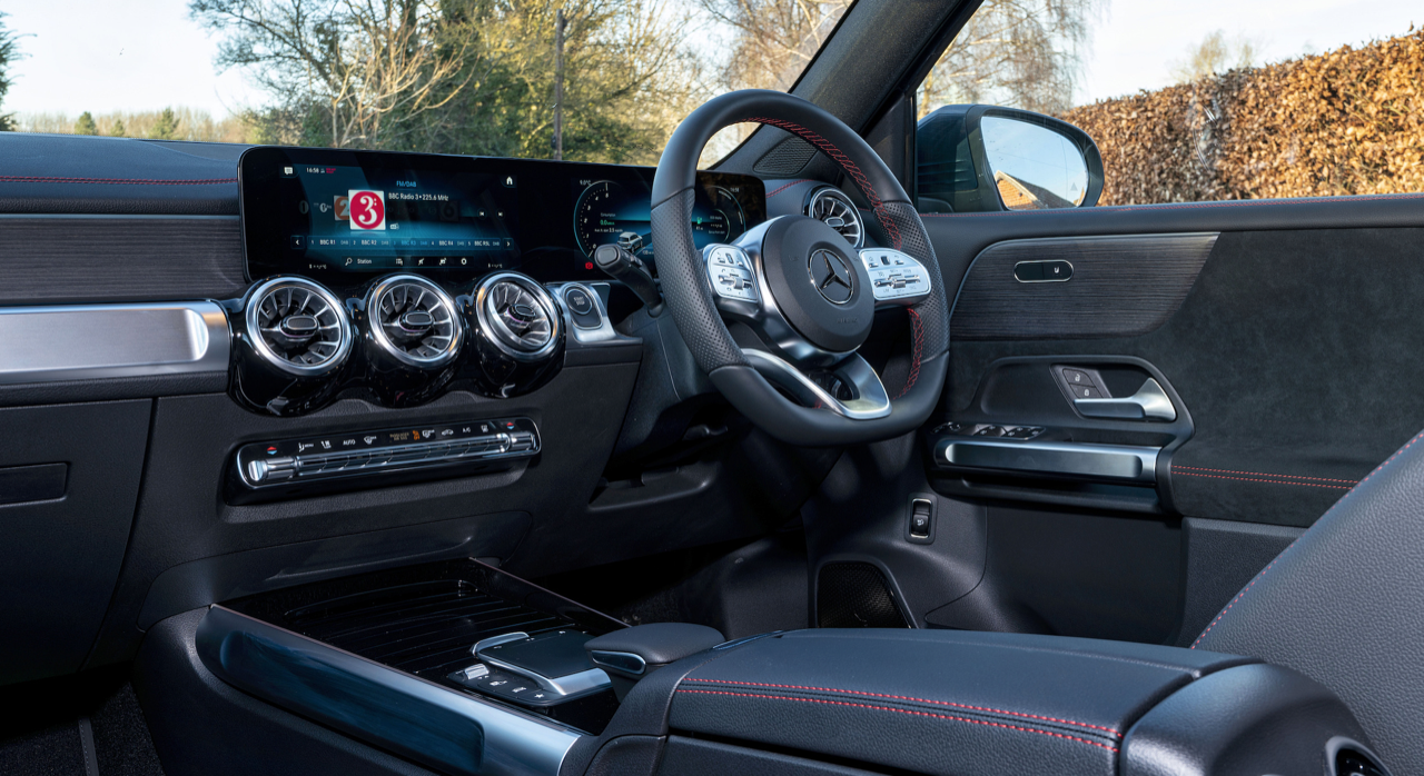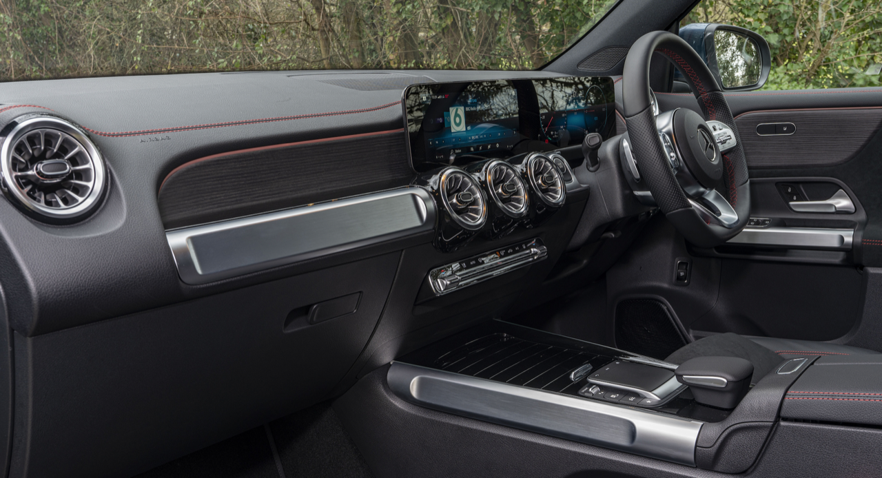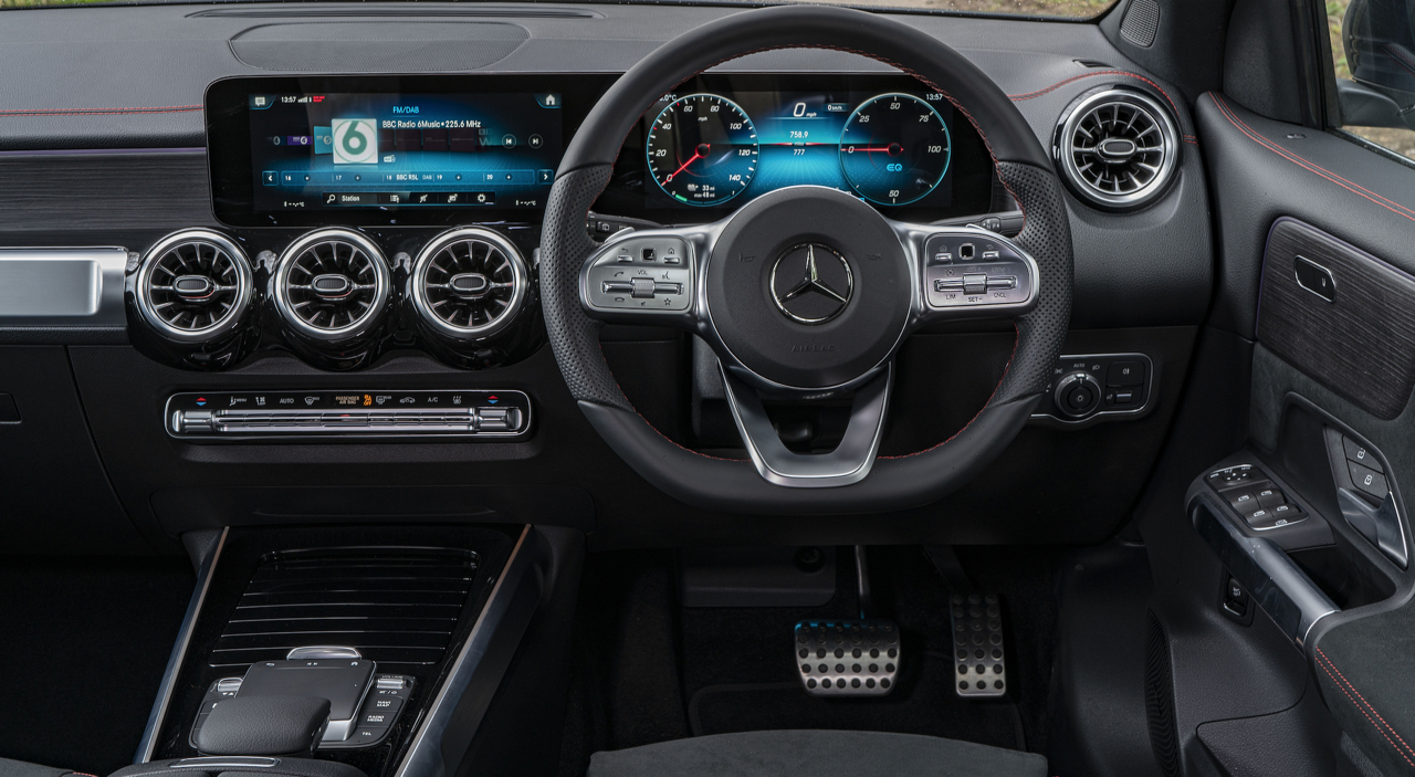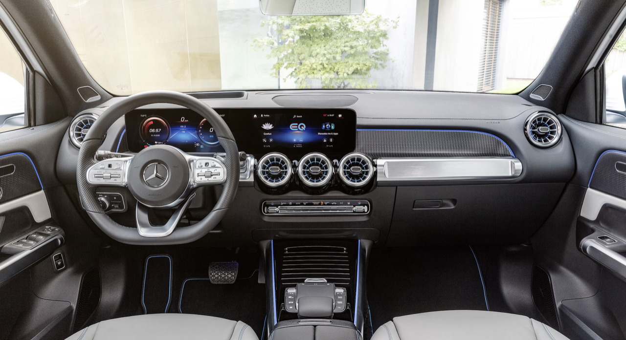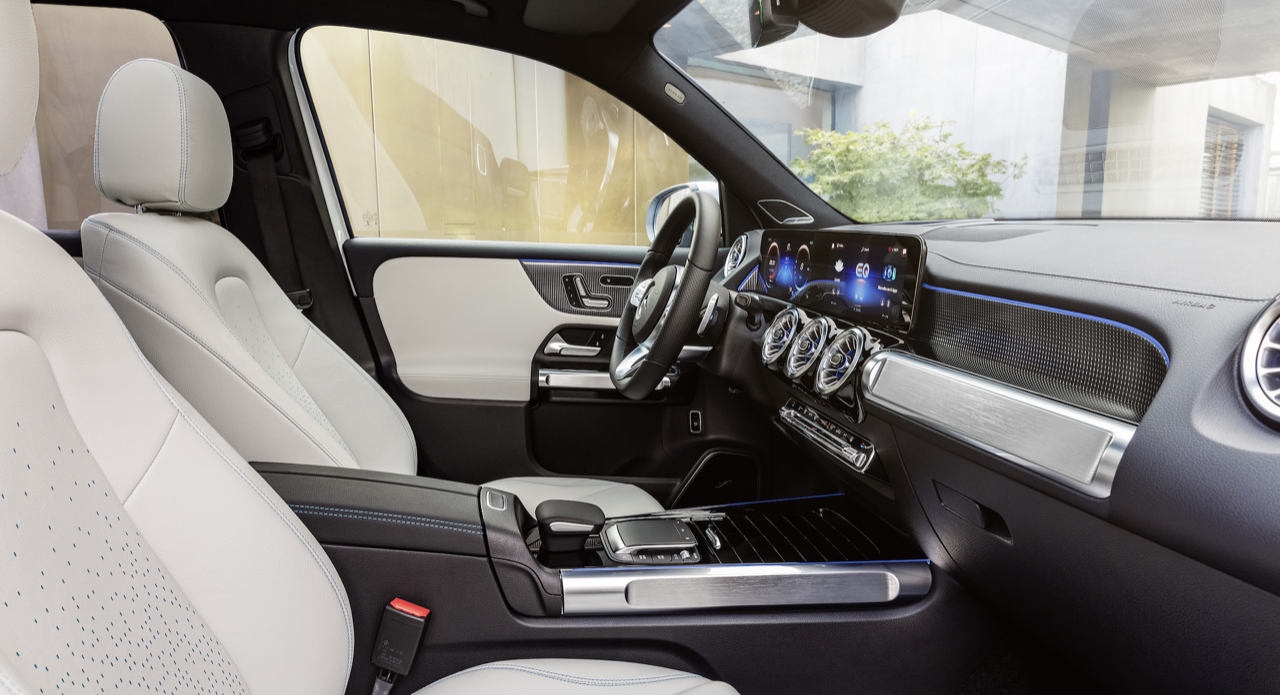 ระบบอินโฟเทนเมนท์ MBUX ของ Mercedes-Benz ติดตั้งอยู่ภายในจอภาพของ EQB โดยมีหน้าจอสั่งงานด้วยระบบสัมผัส หรือสั่งงานด้วยเสียง และควบคุมผ่านปุ่มเล็กๆ บนพวงมาลัย สำหรับเครื่องเสียง ระบบนำทาง และฟังก์ชันอื่นๆ อินเทอร์เฟซแบบใหม่ ออกแบบให้ใช้งานได้ง่าย โดยเฉพาะอย่างยิ่งระบบปัญญาประดิษฐ์ หรือผู้ช่วยสั่งงานด้วยเสียงที่กระตือรือร้นมากเกินไป ซึ่งจะปรากฏตัวขึ้นทุกครั้งที่คุณพูดคำว่า "Mercedes" ระบบนำทางมีคุณสมบัติที่ช่วยให้ผู้ขับค้นหาสถานีชาร์จ EV ได้ง่ายขึ้น พร้อมกราฟิกใหม่ที่ทำให้รู้สึกทันสมัย
