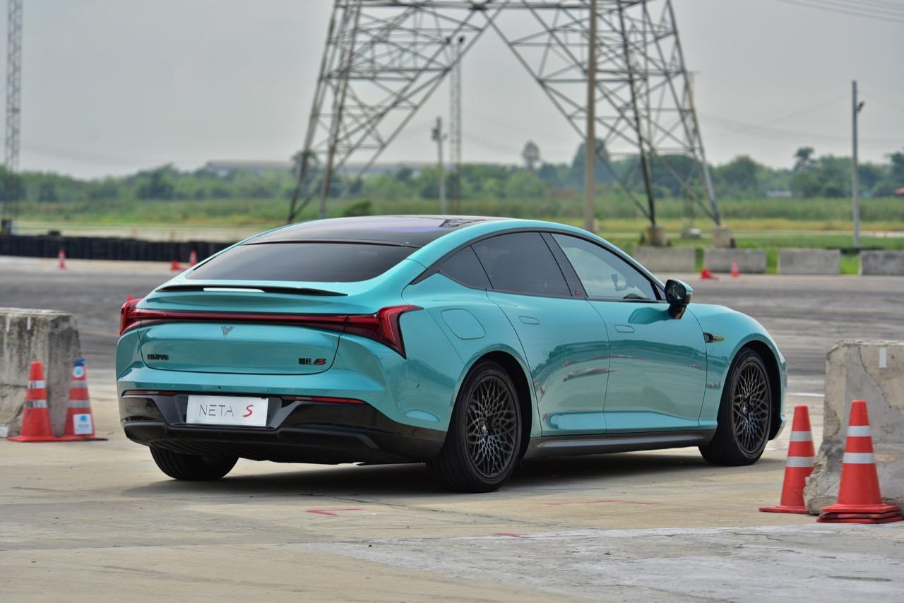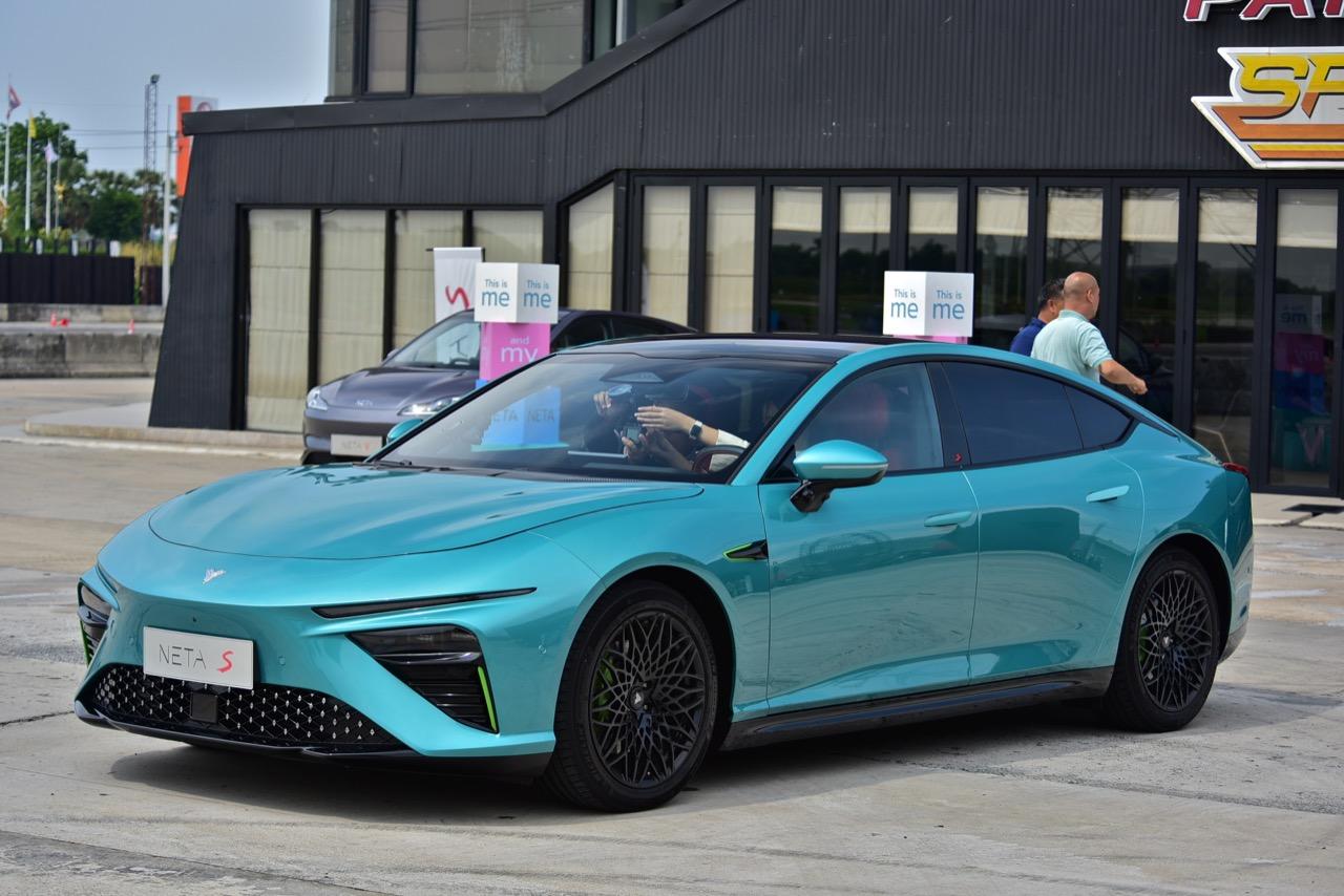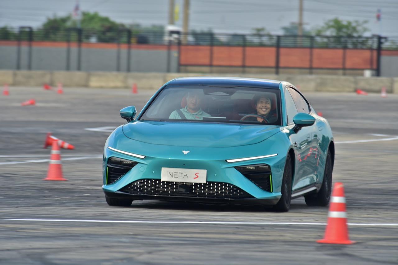 NETA Thailand จัดรถทดสอบ NETA S สปอร์ตซีดานไฟฟ้าให้สื่อมวลชนขับทดสอบสั้นๆ ที่สนามปทุมธานีสปีดเวย์ ช่วงหลังๆ มานี้ สนามดริฟต์แห่งนี้ได้รับความนิยมในการใช้เป็นสนามทดสอบประสิทธิภาพของรถยนต์รุ่นใหม่ โดยมีการจัดวางผังสนาม เพื่อเน้นไปที่การทดสอบอัตราเร่ง 0-100 ความคล่องตัวของแชสซีและการตอบสนองของพวงมาลัย และสุดท้ายกับการทดสอบประสิทธิภาพของระบบเบรก NETA S สีเขียวสว่างสดใส มีภายในที่สวยงามราวกับรถยุโรปราคาแพง ตำแหน่งท่านั่ง ปรับตั้งเบาะไฟฟ้าผ่านจอภาพระบบสัมผัสโดยไม่มีปุ่มปรับระดับของเบาะนั่งคู่หน้า แม้แต่เบาะหลังก็ยังปรับไฟฟ้าให้พนักพิงหลังเอนลงไปทางด้านหลังเพื่อท่านั่งที่ผ่อนคลาย พวงมาลัยหุ้มหนังแท้สีดำสลับสีส้ม คันเกียร์อัตโนมัติ เหมือนกับ Mercedes-Benz เป็นก้านเล็กๆ ทางด้านขวามือของพวงมาลัย ใช้งานง่าย ดันลงล่างก็เข้าตำแหน่ง D ดันขึ้นมาตรงกลางเป็นตำแหน่งเกียร์ว่างหรือ N และดันขึ้นบนสุดเป็นตำแหน่งเกียร์ถอยหลังหรือ R สวิตช์เล็กๆ บนก้านเกียร์คือตำแหน่ง P เอาไว้จอดแบบไม่ต้องเข็น