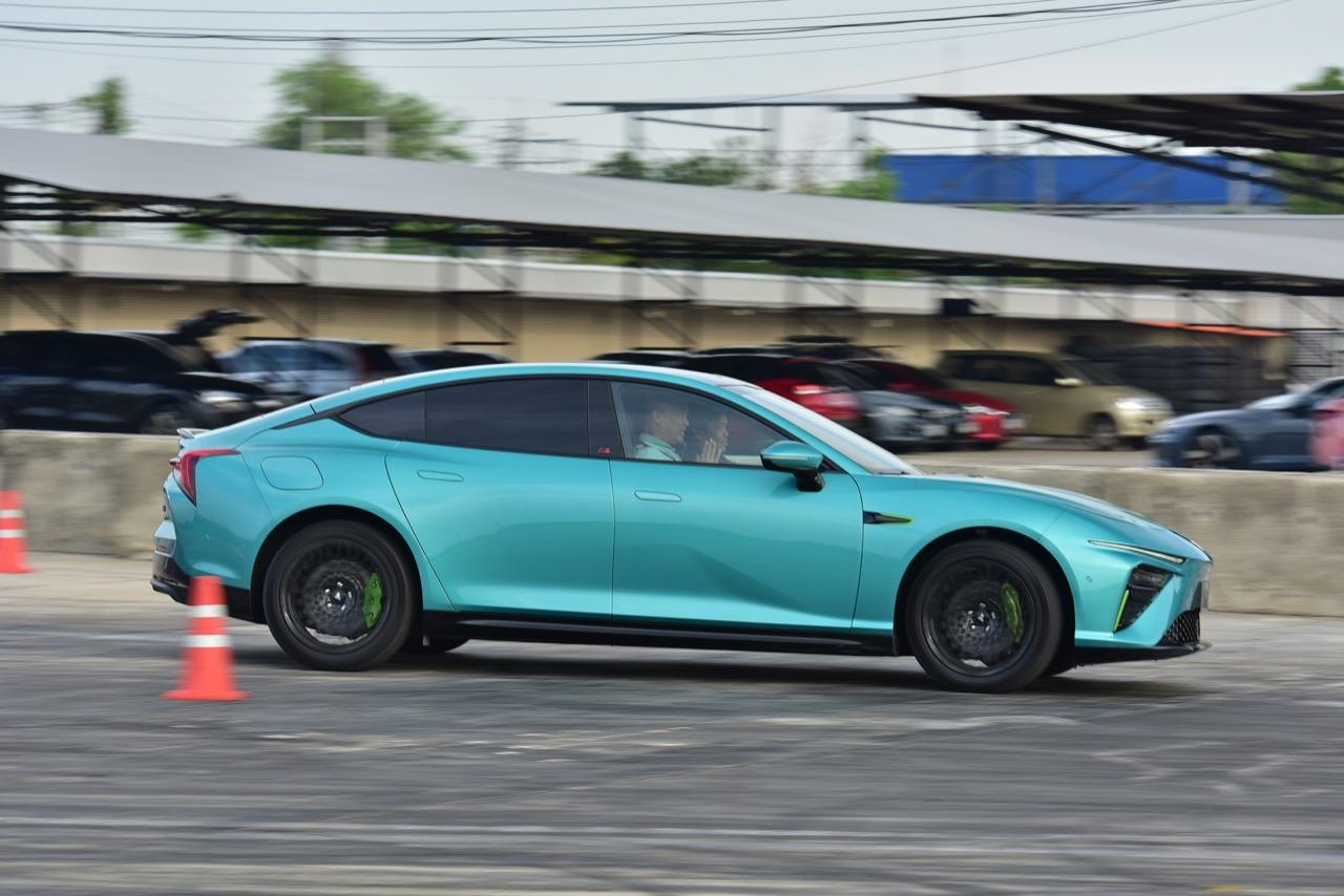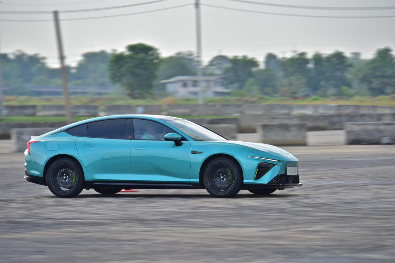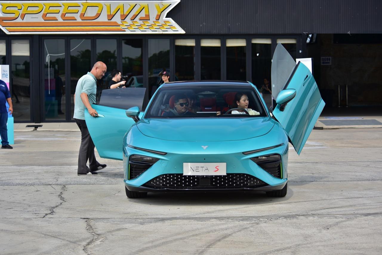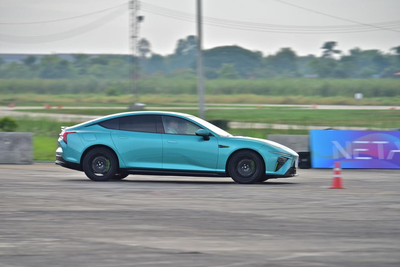 NETA Thailand จัดรถทดสอบ NETA S สปอร์ตซีดานไฟฟ้าให้สื่อมวลชนขับทดสอบสั้นๆ ที่สนามปทุมธานีสปีดเวย์ ช่วงหลังๆ มานี้ สนามดริฟต์แห่งนี้ได้รับความนิยมในการใช้เป็นสนามทดสอบประสิทธิภาพของรถยนต์รุ่นใหม่ โดยมีการจัดวางผังสนาม เพื่อเน้นไปที่การทดสอบอัตราเร่ง 0-100 ความคล่องตัวของแชสซีและการตอบสนองของพวงมาลัย และสุดท้ายกับการทดสอบประสิทธิภาพของระบบเบรก NETA S สีเขียวสว่างสดใส มีภายในที่สวยงามราวกับรถยุโรปราคาแพง ตำแหน่งท่านั่ง ปรับตั้งเบาะไฟฟ้าผ่านจอภาพระบบสัมผัสโดยไม่มีปุ่มปรับระดับของเบาะนั่งคู่หน้า แม้แต่เบาะหลังก็ยังปรับไฟฟ้าให้พนักพิงหลังเอนลงไปทางด้านหลังเพื่อท่านั่งที่ผ่อนคลาย พวงมาลัยหุ้มหนังแท้สีดำสลับสีส้ม คันเกียร์อัตโนมัติ เหมือนกับ Mercedes-Benz เป็นก้านเล็กๆ ทางด้านขวามือของพวงมาลัย ใช้งานง่าย ดันลงล่างก็เข้าตำแหน่ง D ดันขึ้นมาตรงกลางเป็นตำแหน่งเกียร์ว่างหรือ N และดันขึ้นบนสุดเป็นตำแหน่งเกียร์ถอยหลังหรือ R สวิตช์เล็กๆ บนก้านเกียร์คือตำแหน่ง P เอาไว้จอดแบบไม่ต้องเข็น