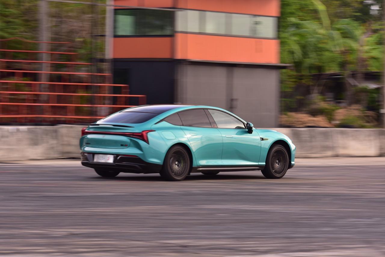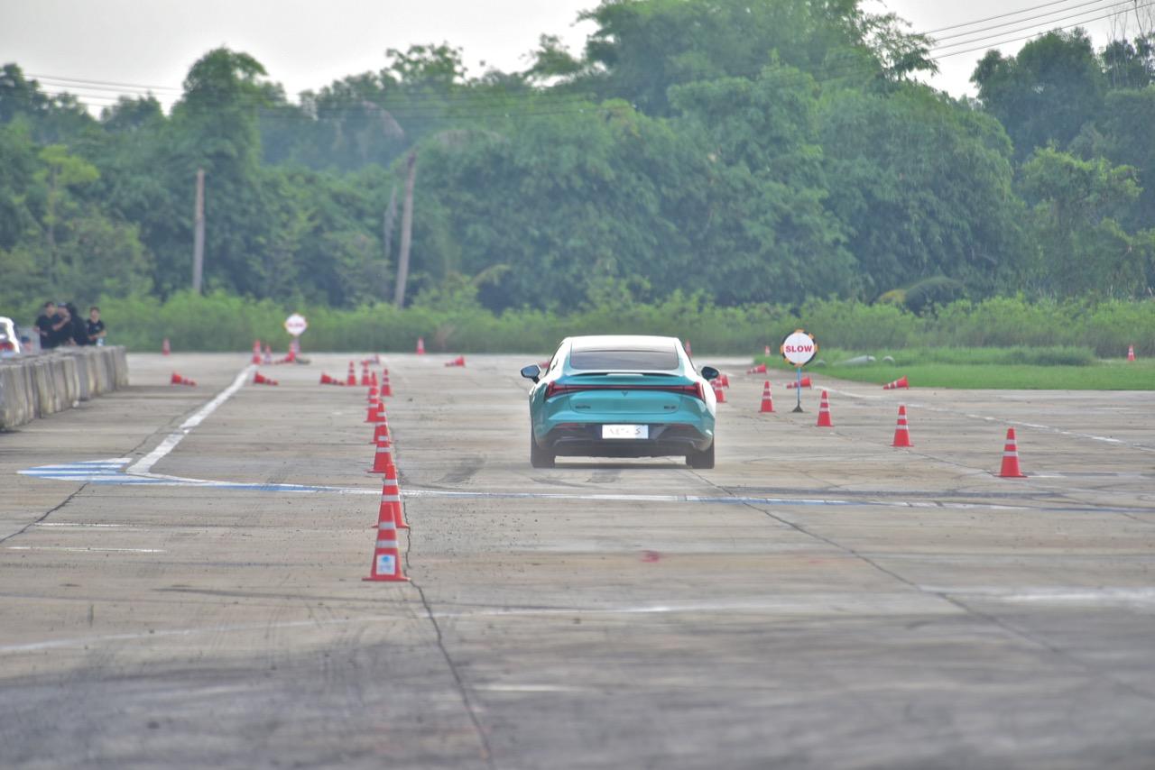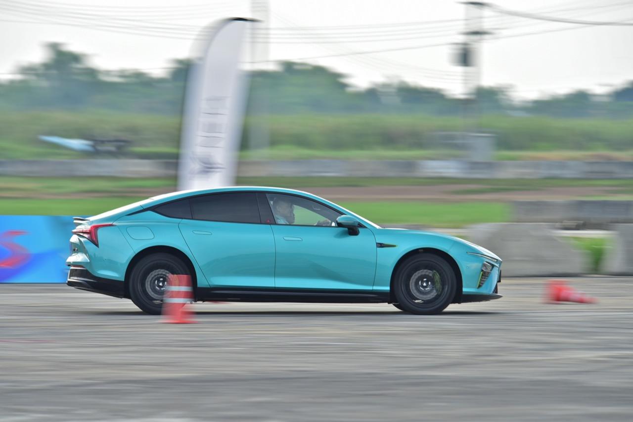 รอบแรกจากจำนวนสามรอบสนาม ผมใช้โหมด ECO ใช้คันเร่งแบบค่อยเป็นค่อยไปเพื่อศึกษาทำความเข้าใจกับอาการของรถก่อนที่จะขับเร็วขึ้น ด้วยโหมดที่โหดกว่านี้ในรอบที่สองและสาม โหมด ECO พวงมาลัยเบาสบายมือ คันเร่งไฟฟ้าตอบสนองแบบง่วงนอน ไหลไปเรื่อยๆท่ามกลางความนวลของช่วงล่างที่ทำให้รู้สึกผ่อนคลาย NETA S ถูกเซตช่วงล่างให้ออกมาในแนวหนึบนุ่ม วิ่งเรื่อยๆ ควบคุมได้ง่ายและพวงมาลัยไฟฟ้ากับช่วงล่างหน้าแบบปีกนกคู่ ก็ช่วยให้รถเลี้ยวได้เร็วขึ้น ความคล่องตัวของมันเกิดจากมอเตอร์ขับเคลื่อนสองตำแหน่งที่คอยปั่นล้อหน้าและล้อหลังให้มีแรงบิดที่สมดุล ขับไปจนเกือบจะครบรอบ ผมก็ปรับโหมดไปที่ Normal แล้วจอดนิ่งอยู่ตรงจุดสตาร์ต เพื่อทดสอบอัตราเร่ง 0-100 กิโลเมตรต่อชั่วโมงด้วยโหมดกลางๆ ที่ยังไม่โหดมากนัก