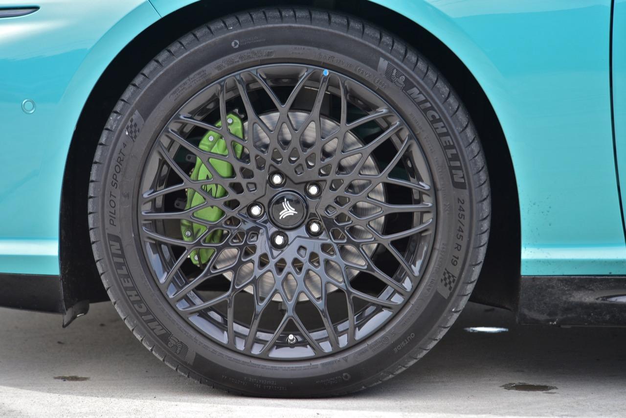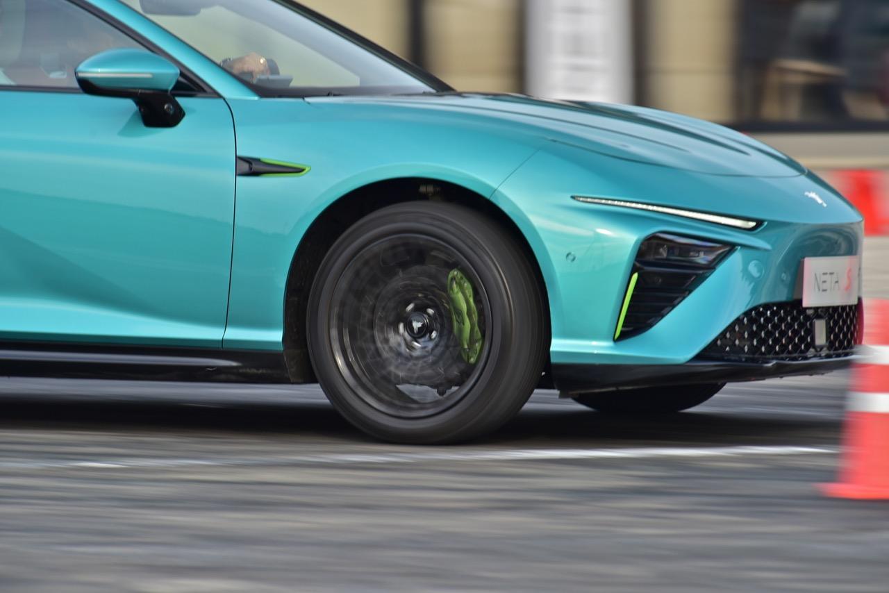 ล้อลายซี่ถี่ขอบ 19 นิ้ว ห่อรัดด้วยยางสปอร์ตสมรรถนะสูง Michelin Pilot Sport 4 ไซส์ 245/45R19 ปั่นจี๋อย่างรวดเร็ว เจ้า NETA ที่มีเรือนร่างน้องๆ Mercedes-Benz S Class กระโจนพรวดออกจากจุดสตาร์ตพร้อมเสียงยางที่แหกปากร้องสนั่น ระบบช่วยทรงตัวกับการเฉลี่ยแรงบิดลงไปยังล้อทั้งสี่ของมอเตอร์คู่ ทำให้รถพุ่งออกจากจุดหยุดนิ่งตรงไปข้างหน้าโดยไม่มีอาการทอร์คสเตียร์ เหมือนก้อนหินที่ถูกหนังสติ๊กดีดออกไปตรงๆ อัตราเร่ง 0-100 ในโหมด Normal ทำได้ 4.3 วินาที นั่นเร็วเอาเรื่องเลยทีเดียว หลุดจากกรวยที่ต้องเบรกหนักๆ ผมแตะเบรกแรงๆ เพื่อลดความเร็วก่อนพุ่งเข้าโค้งขวา เบรกสี่พอตหน้าสีเขียวกับจานเบรกเหล็กหล่อมีพลังในการหยุดยั้งดีพอสมควร พวงมาลัยหนักขึ้นแต่ไม่มาก ทำให้เลี้ยวเข้าโค้งมุมแคบไปทางขวาได้อย่างรวดเร็ว การถ่ายเทน้ำหนักขณะเลี้ยวทำให้นึกถึง BMW M5 G30 แต่ NETA S หนัก 2.3 ตันนั้นปราดเปรียวกว่ามาก จากพลังการปั่นของมอเตอร์ขับเคลื่อนที่ขยันขันแข็ง การเลี้ยวไปทางขวาตลอดแนวสนามมีแท่งแบร์ริเออร์กั้นเอาไว้ในบางจุดทำให้รู้สึกเสียวสันหลังอยู่เหมือนกัน แรงบิด 620 นิวตันเมตร ไม่ใช่เรื่องที่จะมาล้อเล่นในวันที่มีอากาศร้อนแบบนี้ ผมพุ่งผ่านโค้งซ้ายเข้าสู่ทางตรงด้วยความเร็วเกือบๆ 130 กิโลเมตรต่อชั่วโมง เบรกแล้วหักเลี้ยวเข้าโค้งซ้ายมุมกว้าง แรงเหวี่ยงหนีศูนย์ไม่มากเท่ากับ EQS เนื่องจากตัวเบากว่า 300 กิโลกรัม การเซตรถหนัก 2.3 ตันให้พุ่งลิ่วๆ พร้อมกับทำให้ยาง PS4 แหกปากร้องไปตลอดทาง ถ้าเป็นรถสันดาปภายใน คุณต้องมีม้าไม่ต่ำกว่า 450 ตัว ในเครื่องหกสูบเทอร์โบคู่ แต่มอเตอร์คู่ของ NETA S กับการเซตคันเร่งให้ตอบสนองไวขึ้นในโหมด Normal มีกำลังสูสีกับเครื่อง M256 ของ CLS53 แต่สิ่งที่ NETA S แสดงให้เห็นก็คือ รอยยางสีดำกับเสียงวิ่งแหวกอากาศอย่างเงียบเชียบ คุณจะได้ยินแค่เสียงเอี้ยดของยางและเสียงวิ้ดเบาๆ ของมอเตอร์ เมื่อคันเร่งถูกกดลงจนสุด อัตราเร่งระดับยิ่งยวดของ NETA S ทำให้คนที่ชอบความเร็วและการตอบสนองที่คล่องแคล่วว่องไวถึงกับหลงรักกันเลยทีเดียว