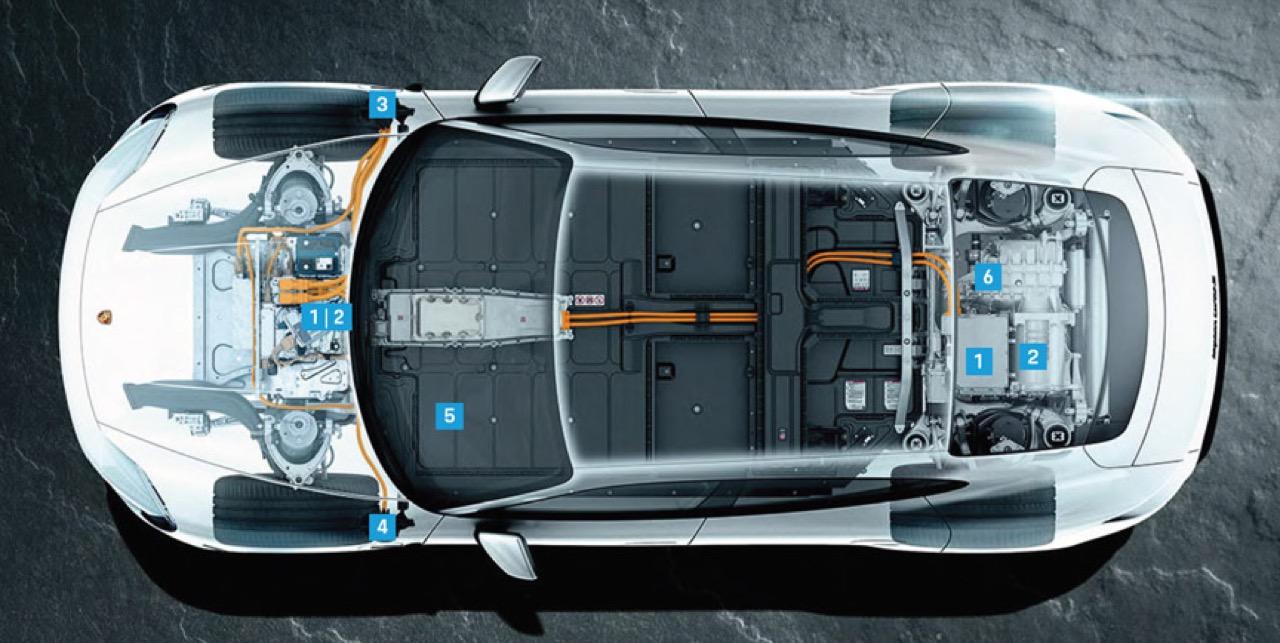โครงสร้างพื้นฐานของรถยนต์ไฟฟ้า EV ทั่วไป เห็นได้ชัดว่ามีชุดแบตเตอรี่ซึ่งติดตั้งอยู่ที่พื้น เป็นส่วนประกอบชิ้นเดียวของชุดกักเก็บพลังงานไฟฟ้าที่หนักที่สุด การวางแบตฯเอาไว้ในระดับต่ำ ช่วยรักษาจุดศูนย์ถ่วงให้อยู่ในเกณฑ์ที่ดี รถยนต์ไฟฟ้า EV ทุกคัน มีระบบจัดการแบตเตอรี่ ซึ่งเป็นสมองกลไฟฟ้าที่คอยควบคุมการทำงานของแบตเตอรี่ Porsche Taycan และ Audi e-Tron GT มีกล่อง BMS ประกอบด้วยคอนแทคไฟฟ้า (สวิตช์เปิด/ปิด) และฟิวส์ แบตเตอรี่เชื่อมต่อด้วยสายไฟฟ้าแรงสูงไปยังมอเตอร์อินเวอร์เตอร์ และกล่องจ่ายไฟฟ้าแรงสูง ในกรณีของ Taycan มีมอเตอร์ AC ด้านหน้าและด้านหลัง แบตเตอรี่ปล่อยไฟฟ้ากระแสตรง และอินเวอร์เตอร์ที่ติดอยู่กับมอเตอร์ จะทำหน้าที่แปลงกระแสไฟฟ้าของแบตเตอรี่ที่เป็นไฟกระแสตรง DC ให้กลายเป็นไฟฟ้ากระแสสลับ AC สำหรับป้อนมอเตอร์ขับเคลื่อน โดยทั่วไป ยานยนต์ EV จะมีกล่องจ่ายไฟฟ้าแรงสูง ซึ่งเปรียบเสมือนฮับส่วนกลางสำหรับพลังงานไฟฟ้าทั้งหมด กระแสไฟเข้า/ออก จาก HVDB ของชุดแบตเตอรี่ พอร์ตชาร์จ และอุปกรณ์ไฟฟ้าทุกอย่างในรถยนต์ เครื่องชาร์จ DC ออนบอร์ด เป็นส่วนหนึ่งของ HVDB อุปกรณ์อิเล็กทรอนิกส์กำลังสูงทั้งหมด เช่น อินเวอร์เตอร์และ HVDB มักจะระบายความร้อนด้วยของเหลวเพื่อลดอุณหภูมิการทำงาน