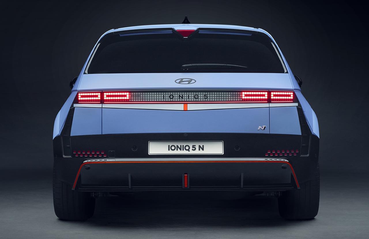 Hyundai Ioniq 5 N มีรูปลักษณ์ที่เหมือนกับ Ioniq 5 ด้านหน้าสวมกันชนดีไซน์ใหม่ที่ดุดัน เป็นเอกลักษณ์ของแบรนด์ N พร้อมช่องรับอากาศขนาดใหญ่บริเวณด้านล่างกับม่านอากาศแนวตั้ง กระจังหน้ารูปแบบตาข่าย โลโก้ N ที่ด้านขวาของกระจัง ระหว่างไฟหน้า ไฮไลต์พิเศษ เดินเส้นสีส้ม 'Luminous Orange' ที่ด้านล่างของชุดกันชนสีดำ ล้ออลูมิเนียมฟอร์จขนาด 21 นิ้ว ห่อรัดด้วยยางซิ่ง Pirelli P-Zero ขนาด 275/35R21 ที่เหนียวหนึบ สเกิร์ตใต้ท้องรถและไฮไลต์สีส้ม Luminous Orange ที่ต่อเนื่องจากด้านหน้า ทำให้รถ EV มีรูปลักษณ์ที่พร้อมลงสนาม คาลิปเปอร์เบรกประทับตราสัญลักษณ์ N บั้นท้ายมีสปอยเลอร์แบบปีกนก พร้อมไฟเบรกรูปสามเหลี่ยมในตัว ฝาครอบกันชนสีดำสุดพิเศษ กราฟิกสะท้อนแสงลายตารางหมากรุก ดิฟฟิวเซอร์หลังเน้นสีส้ม และช่องอากาศแนวตั้งที่กันชนหลัง