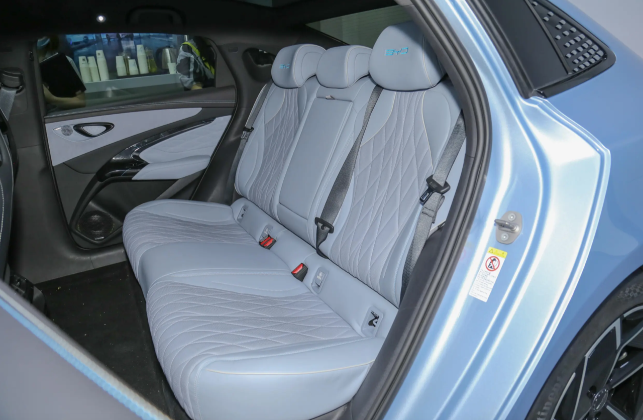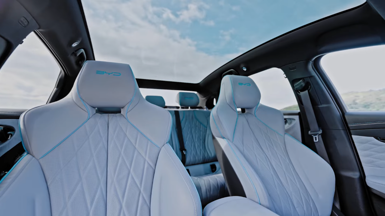 BYD Seal เบาะที่นั่งระดับพรีเมียม สำหรับผู้โดยสาร 5 คน เบาะนั่งแบบสปอร์ตสีฟ้าอ่อนขาวที่นุ่มนิ่มจากการเลือกวัสดุภายในตัวเบาะเพื่อรองรับสรีระของคนขับและผู้โดยสาร โทนสีภายในที่นำเสนอเบาะนั่งสีขาวมีเส้นสีขาวที่ขอบของตัวเบาะ ที่จับประตูมีรูปทรงเหมือนเปลือกหอย วัสดุ Alcantara ช่วยเพิ่มความสวยงามให้กับห้องโดยสาร เบาะนั่งคนขับปรับด้วยไฟฟ้า 8 ทิศทาง จุด รองรับบั้นเอวปรับไฟฟ้า 4 ทิศทาง พร้อมหน่วยความจำ ระบบระบายอากาศ และระบบทำความร้อน เบาะนั่งผู้โดยสารด้านหน้าปรับไฟฟ้า 6 ทิศทาง ติดตั้งระบบระบายอากาศและระบบทำความร้อนในตัว ส่วนระบบแอร์ ใช้ระบบควบคุมสภาพอากาศอัตโนมัติแบบดูอัลโซน พร้อมปั๊มความร้อนที่นำพลังงานความร้อนทิ้งกลับมาใช้ใหม่ เพื่อลดการใช้พลังงาน นอกจากนี้ ยังมีกรองอากาศ PM 2.5 และซันรูฟแบบพาโนรามา เซนเซอร์วัดแสงเพื่อปรับความโปร่งใสโดยอัตโนมัติ
