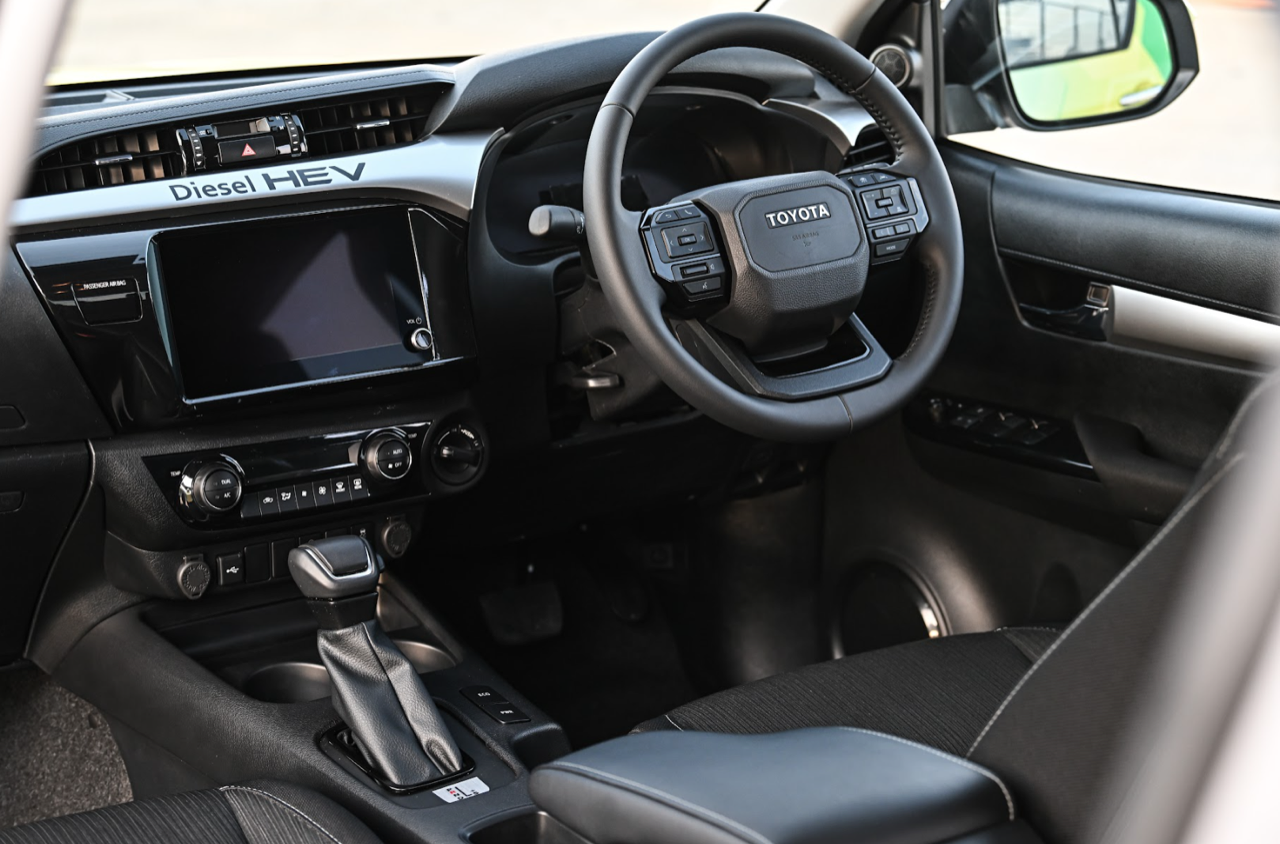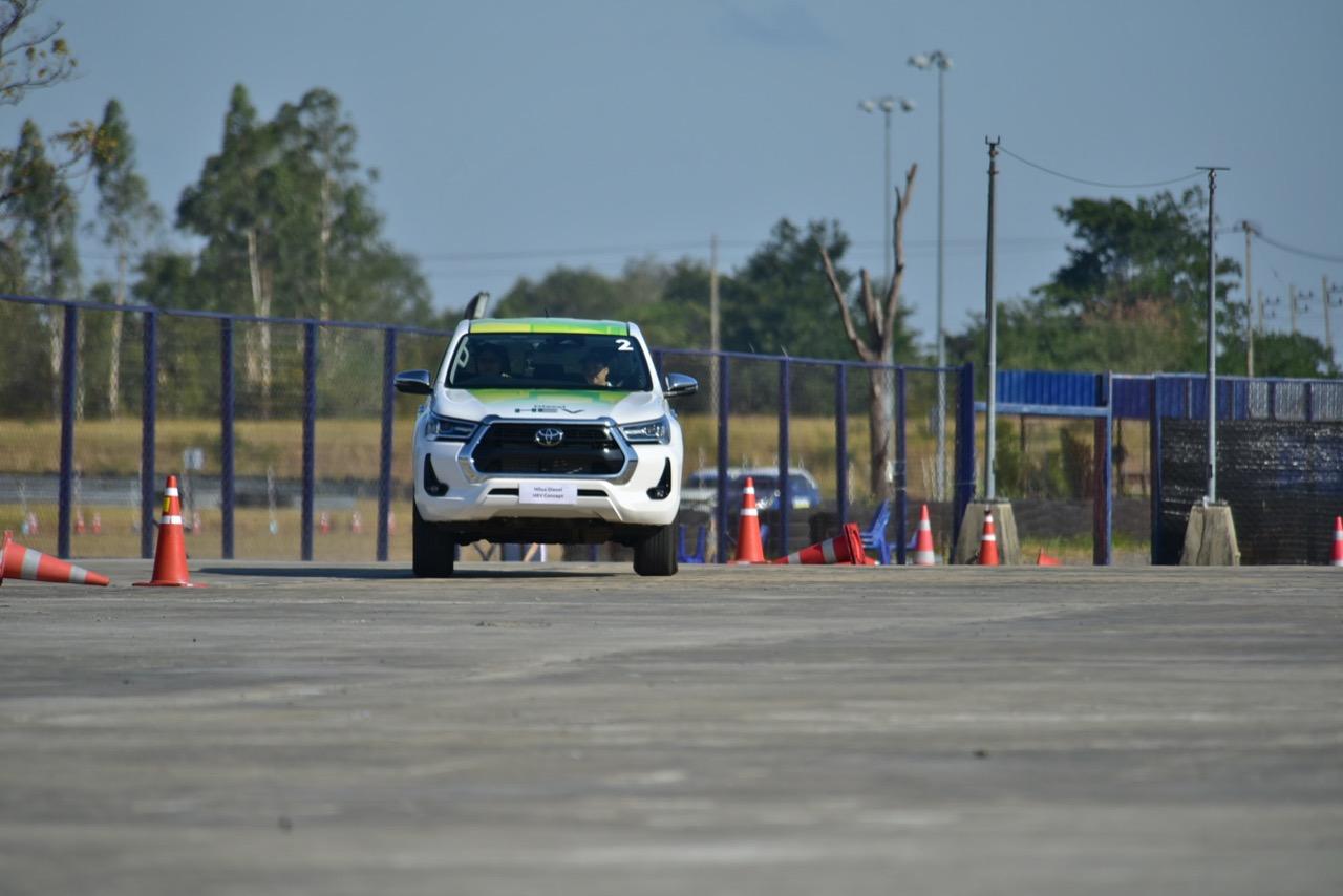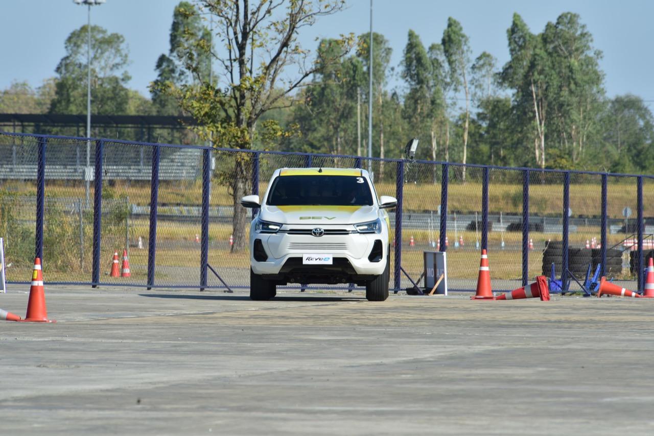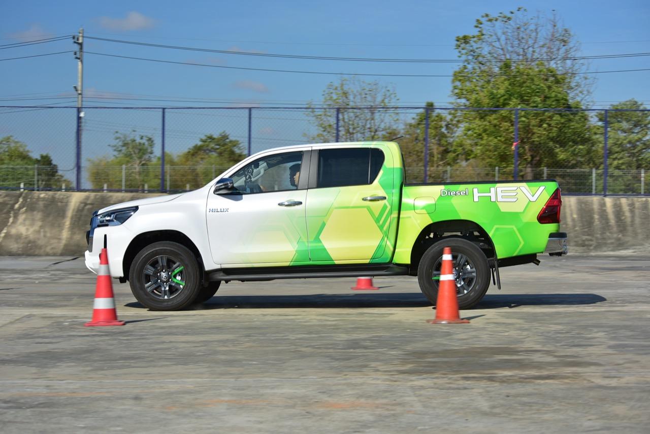 สตาร์ตเครื่องยนต์ 2.8 ลิตร ที่มีระบบไฮบริดเสริม 48 โวลต์ แรงสั่นสะเทือนของเครื่องยนต์ขณะเดินเบายังคงมีอยู่ ส่วนการออกตัวเพื่อดูอัตราเร่ง 0-100 ของกระบะ Hilux BEV น่าจะทำได้ประมาณ 7.8 วินาที การเลี้ยวอย่างแม่นยำและเบามือเกิดจากพวงมาลัยไฟฟ้า EPAS ในที่สุด Hilux ก็มีพวงมาลัยไฟฟ้าซะที ถึงแม้จะเป็นรถต้นแบบที่ยังไม่ได้ผลิตจริง แต่พวงมาลัยไฟฟ้าในกระบะต้นแบบบ่งบอกถึงชุดบังคับเลี้ยวของ New Hilux ที่จะเปิดตัวในปี 2567 ได้เป็นอย่างดี เนื่องจากไม่มีเครื่องยนต์ มันจึงปราศจากแรงสั่นสะเทือน รวมถึงเสียงที่มีแค่เสียงยางและเสียงลมเบาๆ เมื่อเร่งความเร็วถึง 100 กิโลเมตรต่อชั่วโมง การหักพวงมาลัยให้ความรู้สึกดีกว่าพวงมาลัยเพาเวอร์ใน REVO ค่อนข้างเบาสบายมือราวกับกำลังขับรถเก๋ง น้ำหนักของพวงมาลัยจะเบากว่า Ranger เล็กน้อย และมีความแม่นยำที่ดีเลยทีเดียว เชื้อเพลิงดีเซลเต็มถัง 85 ลิตร ไปได้ไกล 1,200 กิโลเมตร ถือว่าทำระยะทางได้ไกลมากที่สุดเมื่อเทียบกับรถกระบะเครื่องยนต์ไม่เกิน 3.0 ลิตร เทอร์โบ แถมยังปล่อยมลพิษต่ำอีกด้วย