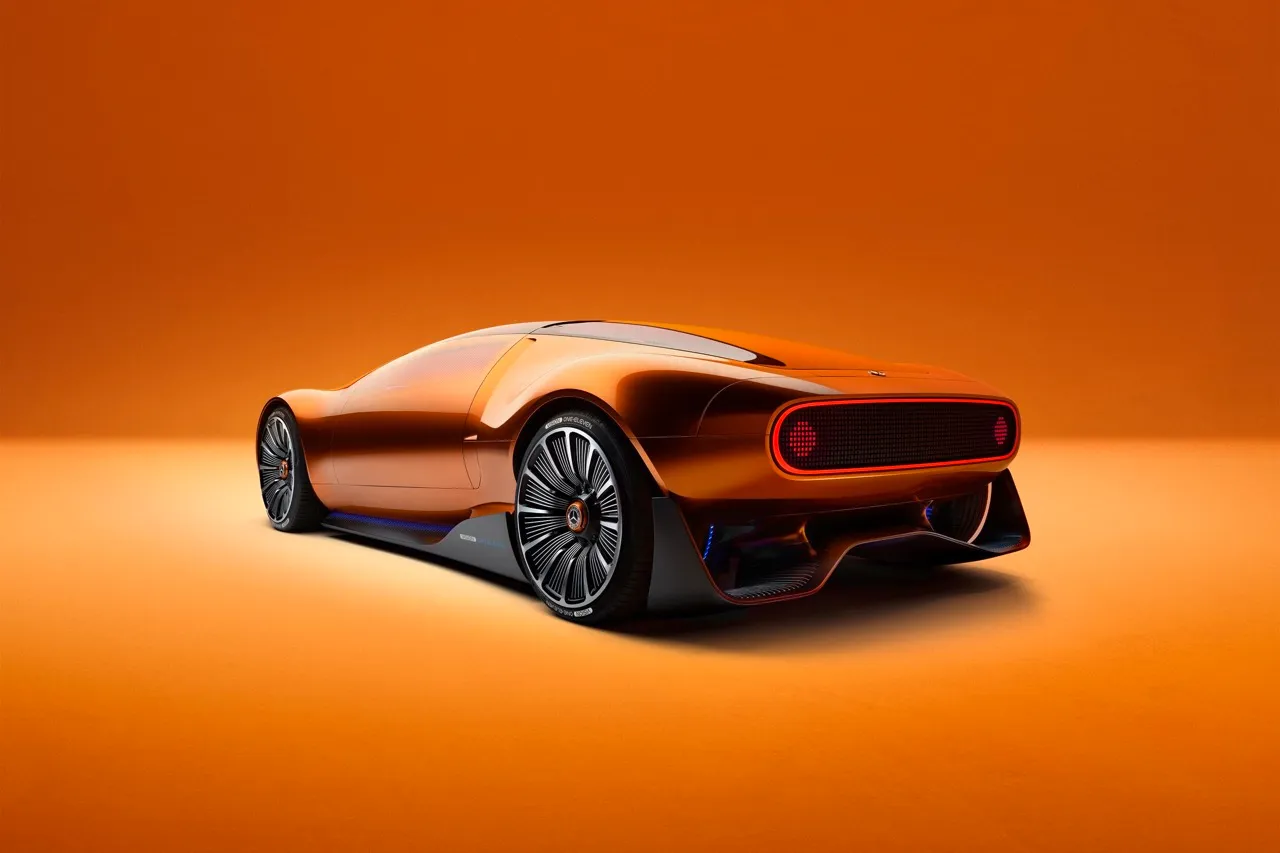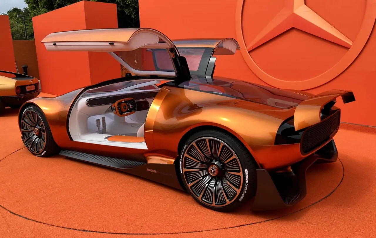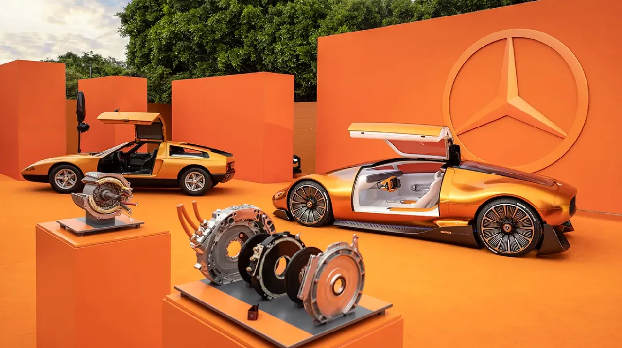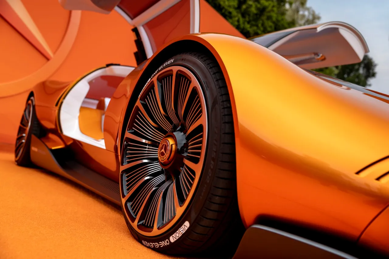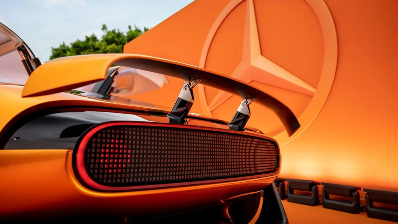 ครีบสร้างแรงกดชายล่างด้านข้างสีดำด้านนั้นดูล้ำหน้ากว่าซุ้มล้อหลังอันอ้วนพี ดีไซน์เนอร์ใช้แนวคิดการเยื้องแสงด้านหลังเป็นสีน้ำเงิน ดิฟฟิวเซอร์ขนาดใหญ่ ยางหลังที่มองเห็นได้อย่างชัดเจนในสไตล์รถสปอร์ต ล้อคอนเซปต์ขนาดใหญ่ ซึ่ง Mercedes-Benz ไม่มีวันที่จะผลิตออกมาแบบนั้นจริงๆ เพราะล้างโคตรยาก การออกแบบลวดลายล้อได้รับแรงบันดาลใจจากขดลวดมอเตอร์ที่ใช้ในระบบส่งกำลังของ One-Eleven แบรนด์ตราดาว เข้าควบรวมโดยซื้อกิจการของบริษัท YASA ในเดือนกรกฎาคม 2021 ด้วยคำมั่นสัญญาที่ว่าจะมีมอเตอร์ขนาดเล็ก และเบากว่ามากประจำการในรถยนต์ไฟฟ้ารุ่นใหม่ของค่ายดาวสามแฉก ซึ่งเป็นมอเตอร์ที่ทรงพลังมากกว่ามอเตอร์แบบเรเดียลฟลักซ์ (การไหลของแม่เหล็กไฟฟ้าวิ่งขนานไปกับแกนหมุนของมอเตอร์ แทนที่จะตั้งฉากกับแกนนั้น)