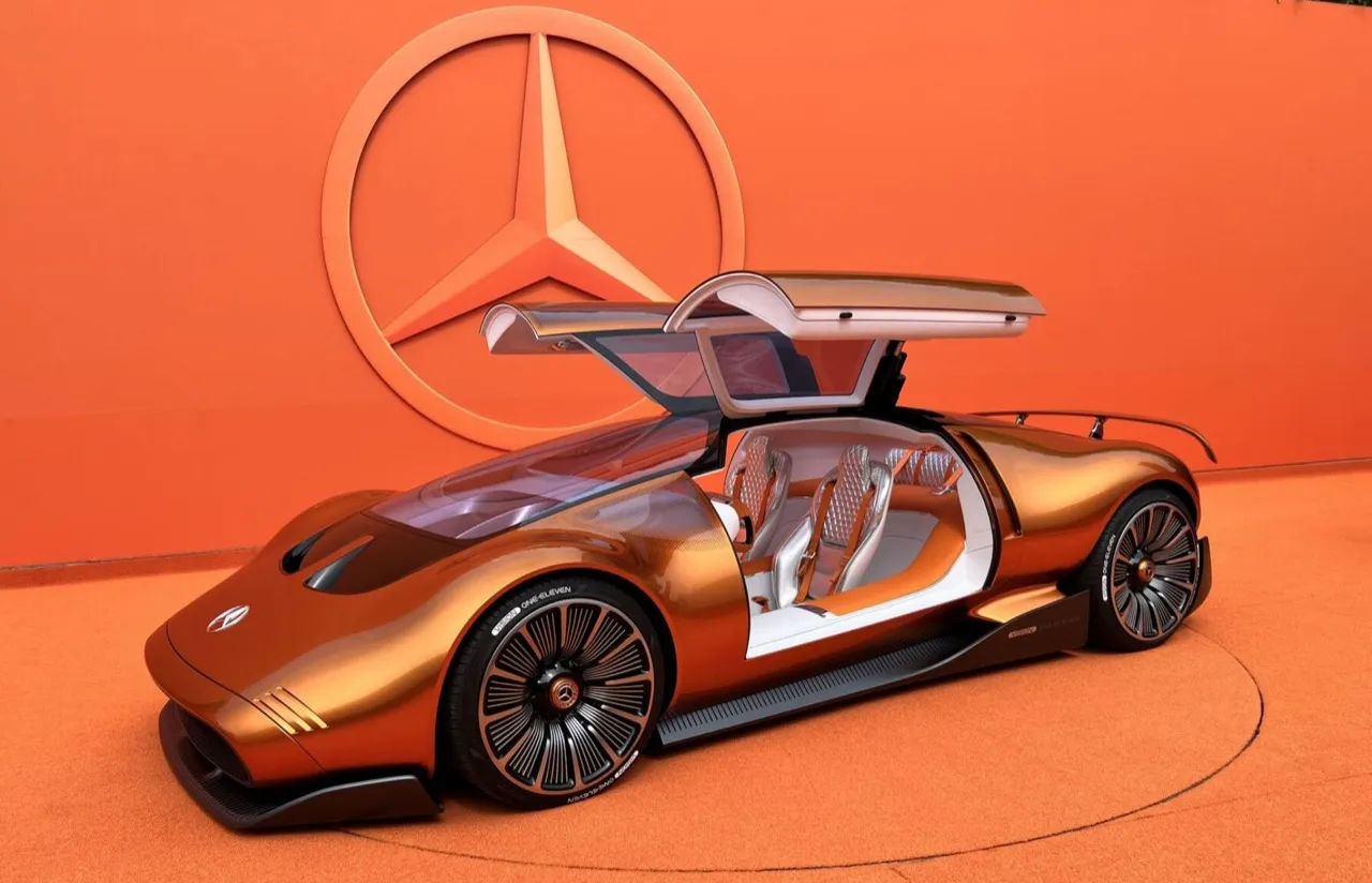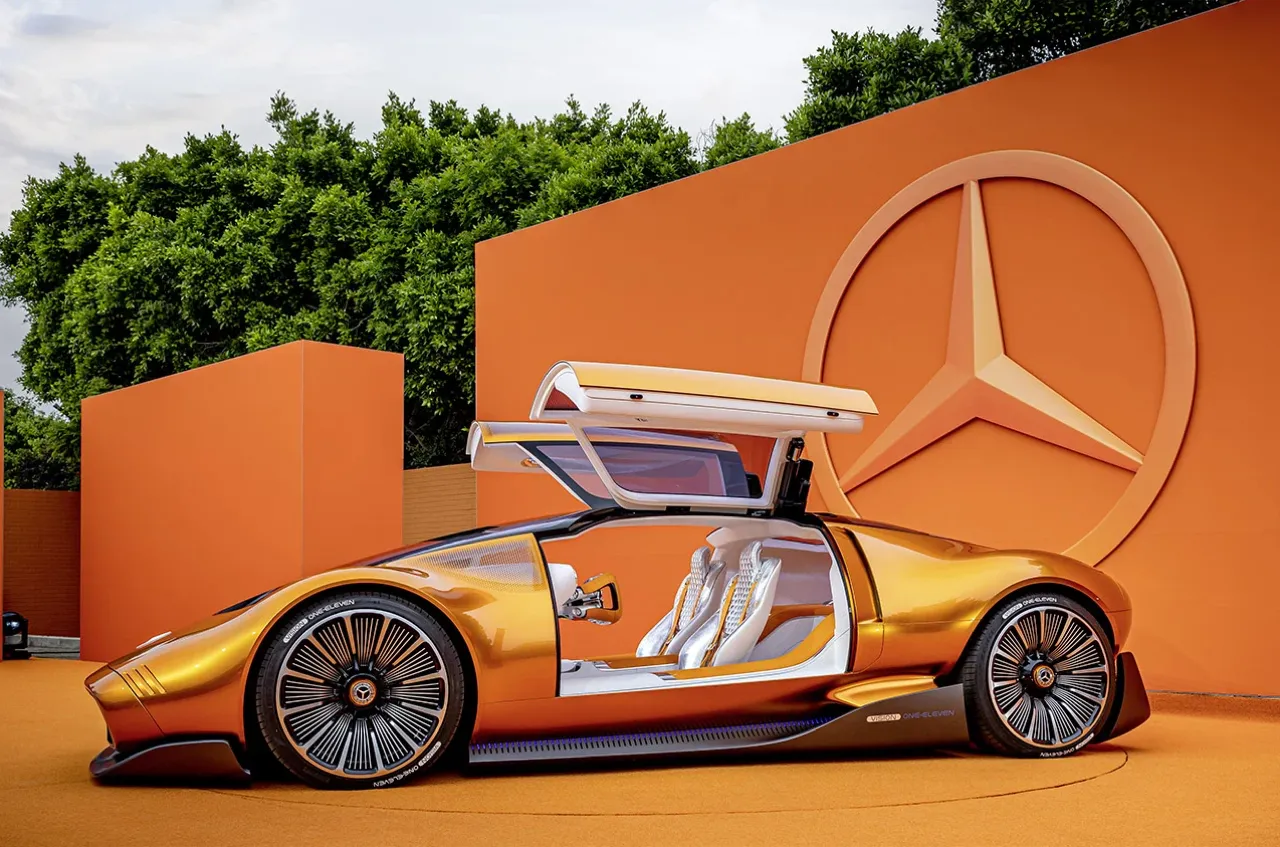 Vision One-Eleven โทนสีทองแดงผสมสีส้ม (และสีดำ) เป็นองค์ประกอบที่ชวนให้นึกถึงยานอวกาศมากที่สุด ดีไซน์ไฟหน้า และไฟท้ายดูโดดเด่นไม่น้อย เมื่อเทียบกับรถต้นแบบอายุ 54 ปี C111 เป็นรถทดสอบเครื่องยนต์วางกลางลำ ในขณะที่รถ Vision One-Eleven คันใหม่เอี่ยมอ่อง มีมอเตอร์ฟลักซ์ของ Yaza ประจำการตามแนวแกนในแต่ละล้อ ชุดแบตเตอรี่ขนาดใหญ่ซึ่งยังไม่ได้มีการเปิดเผยถึงความจุ นักออกแบบของ Mercedes นำรูปแบบของรถสปอร์ตเครื่องวางกลางกลับมาอีกครั้ง โดยผลักดันงานดีไซน์จนถึงขีดจำกัด ในส่วนของรถยนต์ต้นแบบตราดาวสามแฉกที่เคยจัดแสดงก่อนหน้านี้ เช่น F 015 และ EQXX ก็มีรูปลักษณ์คล้ายกับรถสปอร์ตเครื่องวางกลาง แต่ Vision One-Eleven นั้นดูจริงจังมากกว่าจะเป็นเพียงแค่รถต้นแบบที่จอดโชว์หล่ออย่างเดียว
