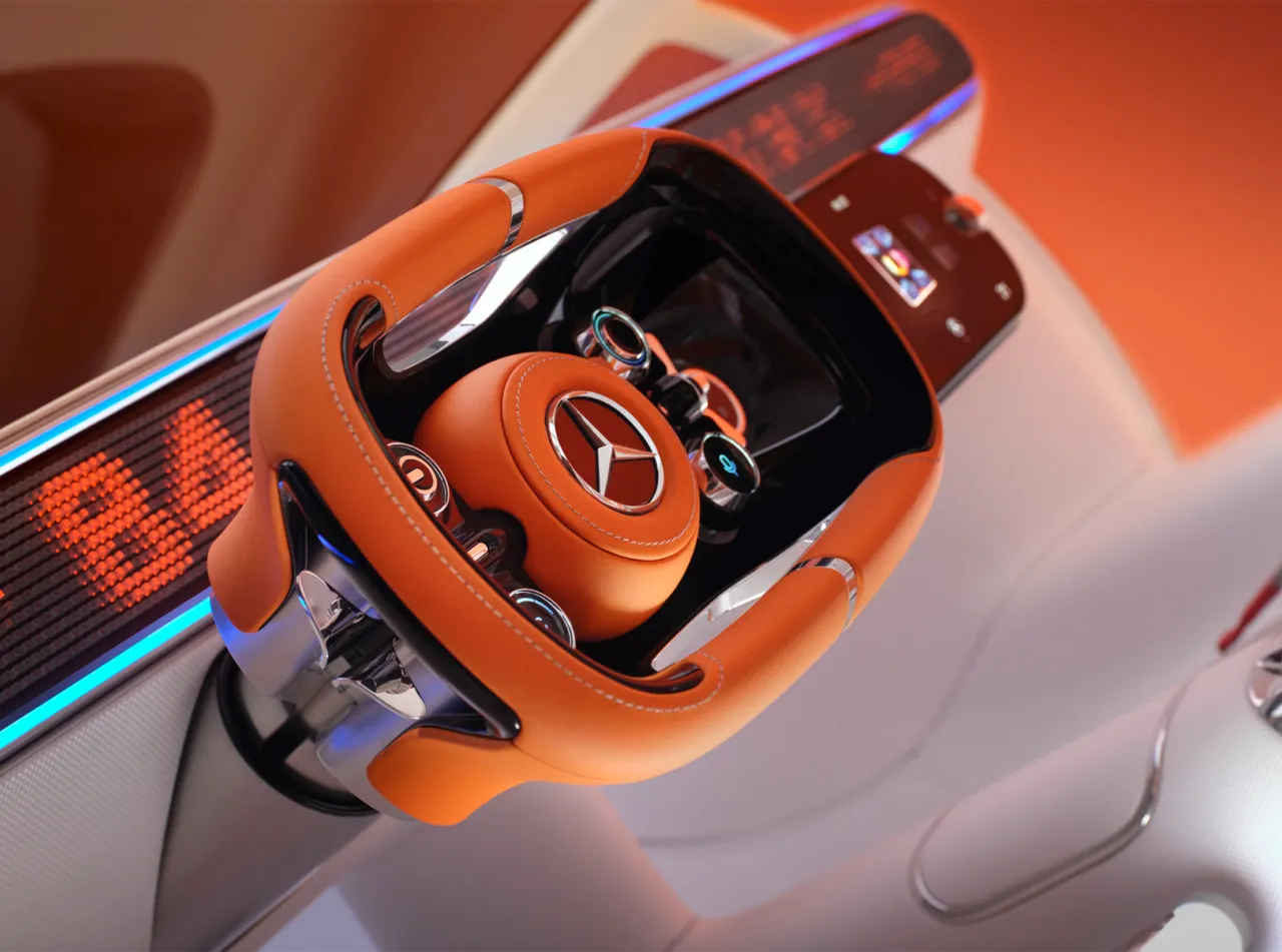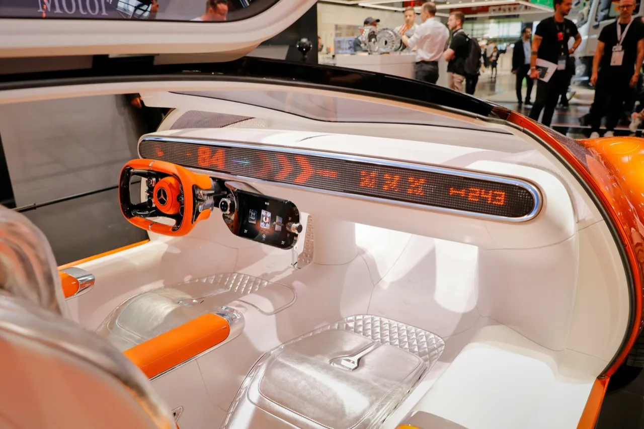การผสมสานหนังไซไฟที่อ้างถึงภาพยนตร์เรื่อง The Fifth Element ของ Luc Besson ในปี 1997 แผงหน้าปัดหุ้มด้วยผ้าสีขาว ทำจากโพลีเอสเตอร์รีไซเคิล 100 เปอร์เซ็นต์ หนังสีส้มสดใสคลุมที่พักแขนที่ธรณีประตู คอนโซลกลาง ลากยาวไปทางด้านหลังเข้าไปในห้องเก็บสัมภาระ หนังได้รับการประมวลผลอย่างยั่งยืนว่าไม่มีการทำร้ายธรรมชาติ! และฟอกโดยใช้เปลือกเมล็ดกาแฟ เบาะนั่ง Bacofoil ถูกรวมเข้ากับแชสซี ตำแหน่งการขับขี่นั้นใกล้เคียงกับที่นั่งแบบเอนนอน ที่คุณจะพบได้ในรถ F1 เท่านั้น สายรัดเข็มขัดนิรภัยสีส้มสดบนเบาะนั่งสีเงิน มีโลโก้ 'ดาวสามแฉก' สีเงินยวงของ Mercedes ประดับอยู่ตรงกึ่งกลางอย่างงดงาม