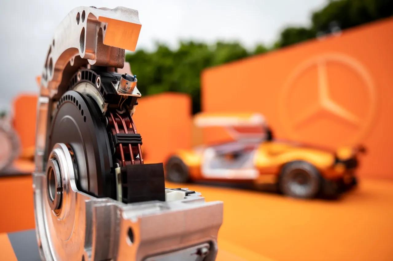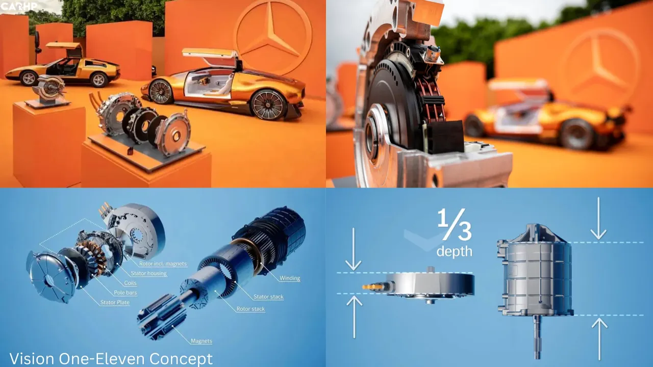 มอเตอร์ไฟฟ้าแบบฟลักซ์ตามแนวแกนที่ออกแบบโดย YASA ซึ่งเป็นบริษัทในเครือ Mercedes-Benz ช่วยให้จุดศูนย์ถ่วงของ Vision One-Eleven นั้นต่ำ ซึ่งตรงกันข้ามกับมอเตอร์ฉุดลากแนวรัศมี ที่พบใน Mercedes EV รุ่นอื่นๆ เช่น EQS/EQE/EQB มอเตอร์ฟลักซ์ตามแนวแกนล้อ มีกำลังหนาแน่นมากกว่ามอเตอร์แนวรัศมีถึง 66 เปอร์เซ็นต์ ทำให้วิศวกรมีความยืดหยุ่นมากขึ้นในการจัดวาง ใน Vision One-Eleven ซุ้มล้อที่นูนออกมาอย่างชัดเจนหมายถึงการวางมอเตอร์ฟลักซ์ตามแนวแกนไว้ใกล้กับล้อ เป็นสัตว์ร้ายสี่ตัวที่ให้กำลังรวม 1,000 กิโลวัตต์ หรือประมาณ 1,300 แรงม้า แน่นอนว่าทั้งหมดนี้ยังคงเป็นเพียงทฤษฎี เนื่องจาก Vision One-Eleven เป็นเพียงรถต้นแบบที่เน้นศักยภาพในด้านสไตล์ ไม่ใช่รถต้นแบบที่ใช้ทดสอบระบบส่งกำลังเหมือนกับคุณลุง C111 ผลลัพธ์จากการออกแบบยุคใหม่ก็คือ มันเป็นรถที่มีพื้นผิวขนาดใหญ่เพียงจุดเดียว หลังคาและตัวถังหลอมรวมเป็นหนึ่งเดียวกัน แม้ว่าจะมีซุ้มล้อหน้าและหลังที่เด่นชัด ด้วยเฉดสีของ Mercedes AMG One